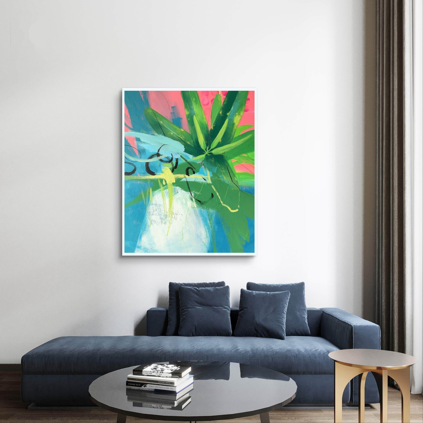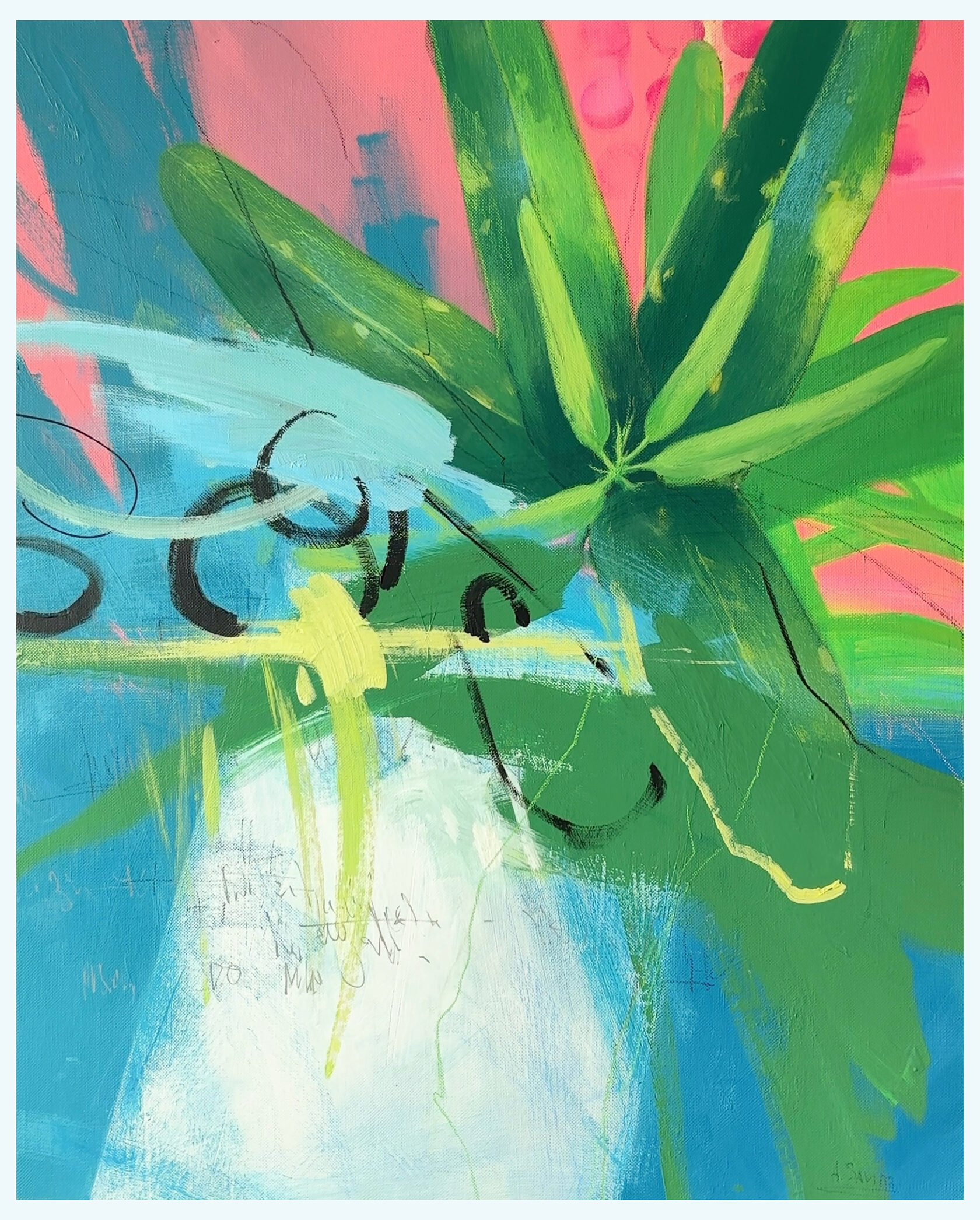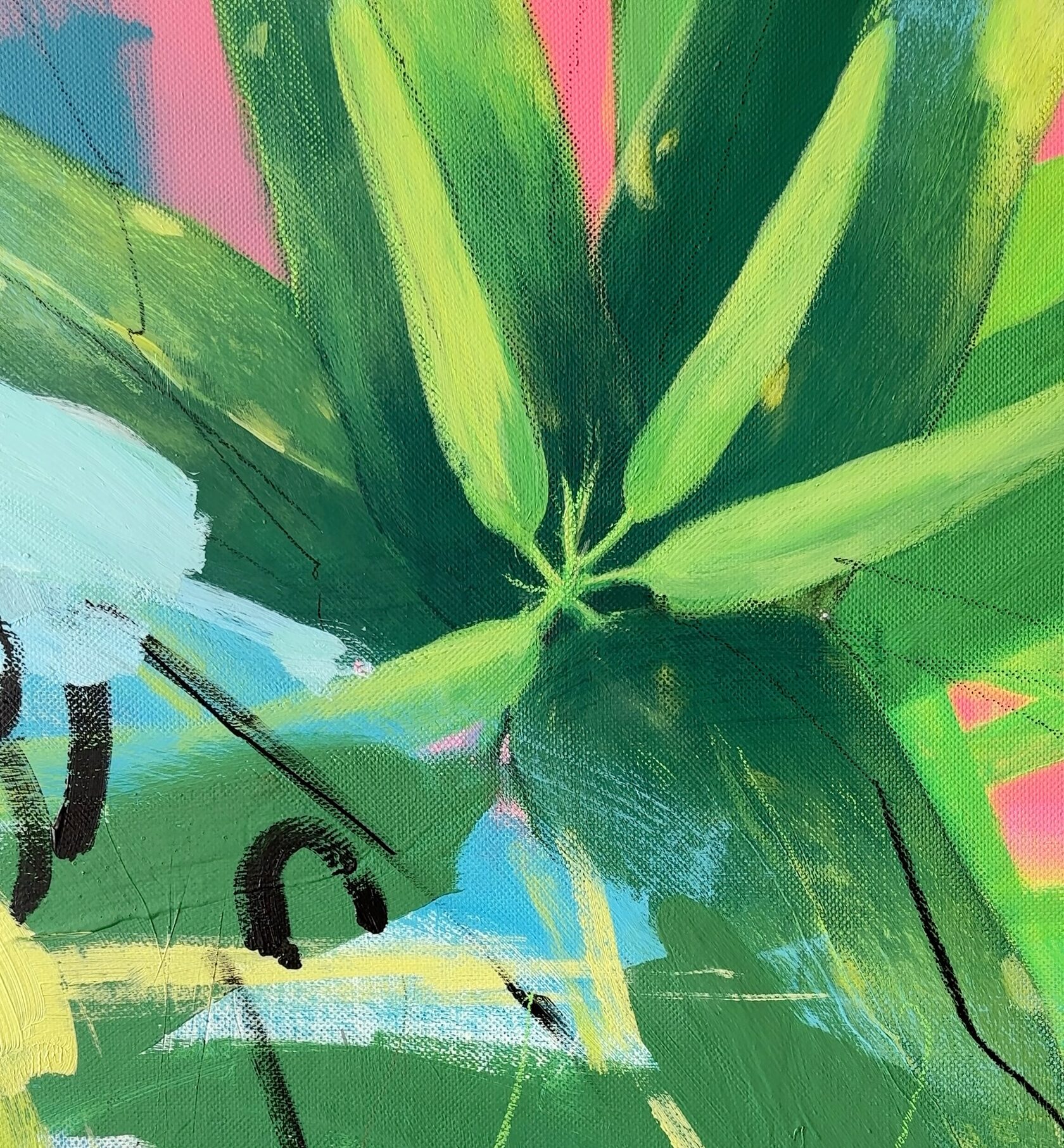 100×80 см, холст, акрил, масляная пастель, 2025 Картина из ботанической серии, в которой растения становятся метафорой внутренних состояний. В этой работе листья кротона распахиваются уверенно и резко. Они будто распирают пространство, пробиваясь сквозь текстуры. В зелёной массе чувствуется напряжение — как будто что-то назревает внутри и вот-вот прорвётся. Розовый и голубой фон — не просто цвет, а настроение: он задаёт внутренний конфликт, тревожную яркость, на фоне которой зелень выглядит особенно живой. Черные и жёлтые линии не декоративны, они будто фиксируют движение или колебание — как записи в дневнике, сделанные на взлёте эмоции. Это не иллюстрация растения, а ощущение от него. Кротон здесь — как символ накопленной силы, которая ищет форму. Это про внутренний рост, не всегда гладкий, но неизбежный.