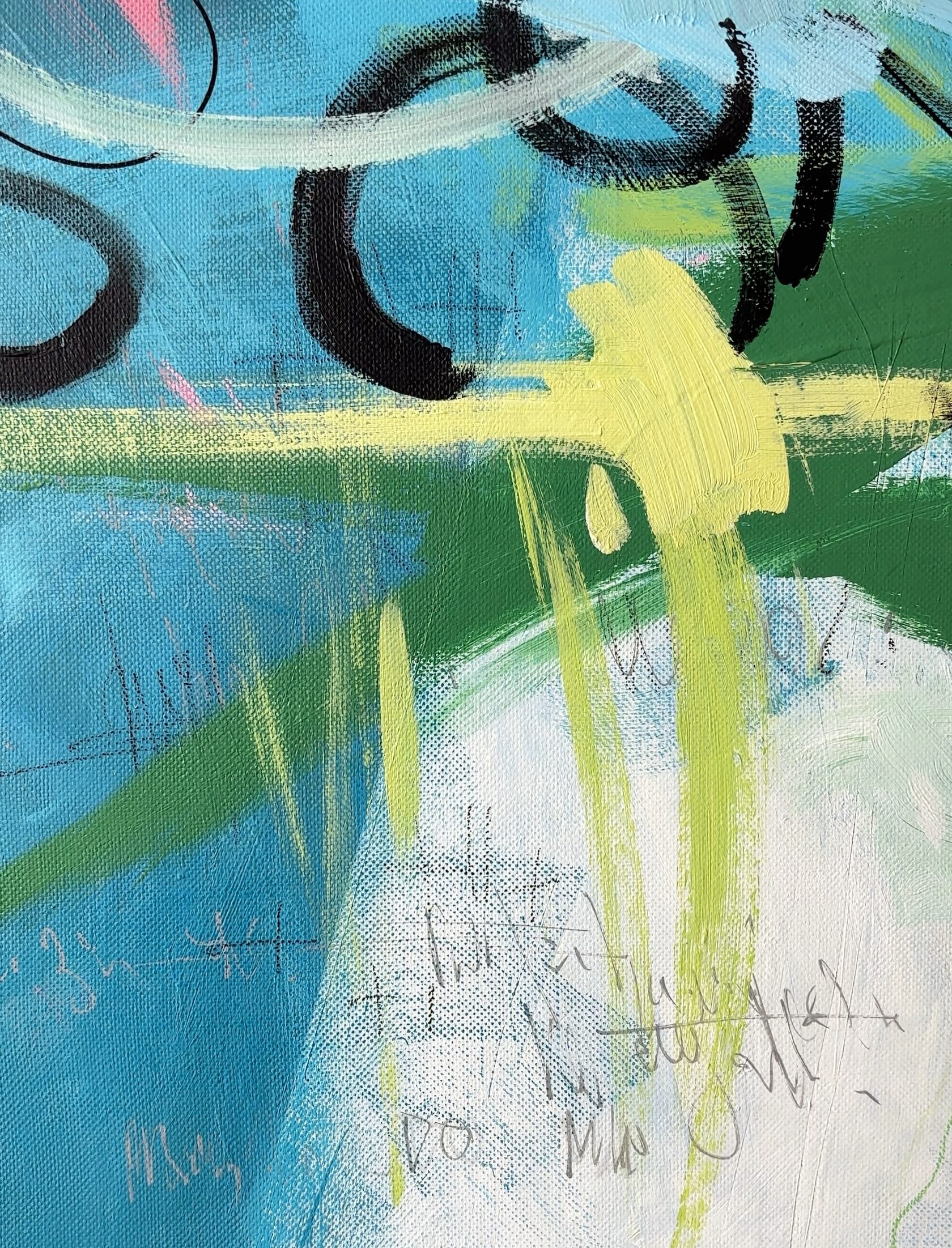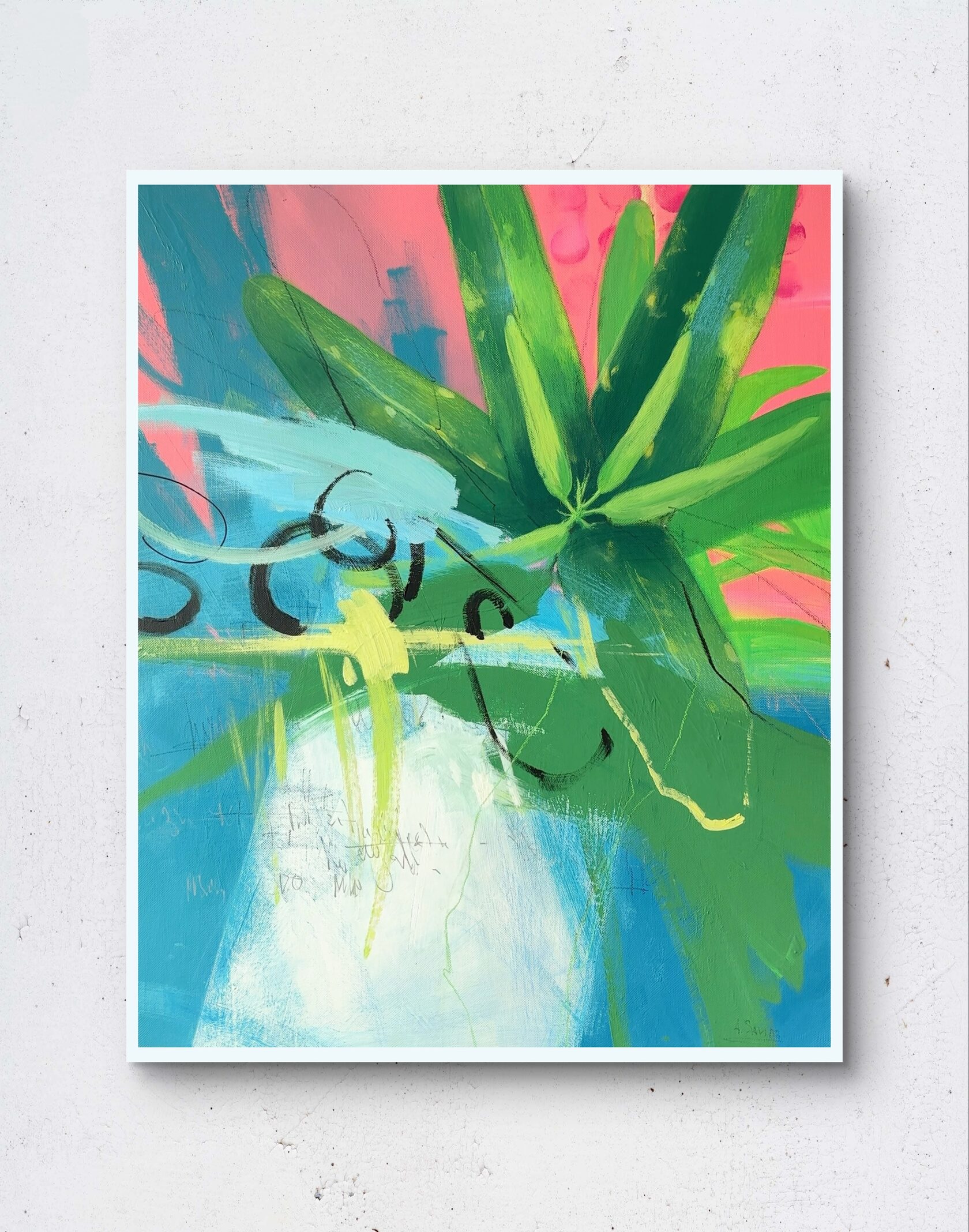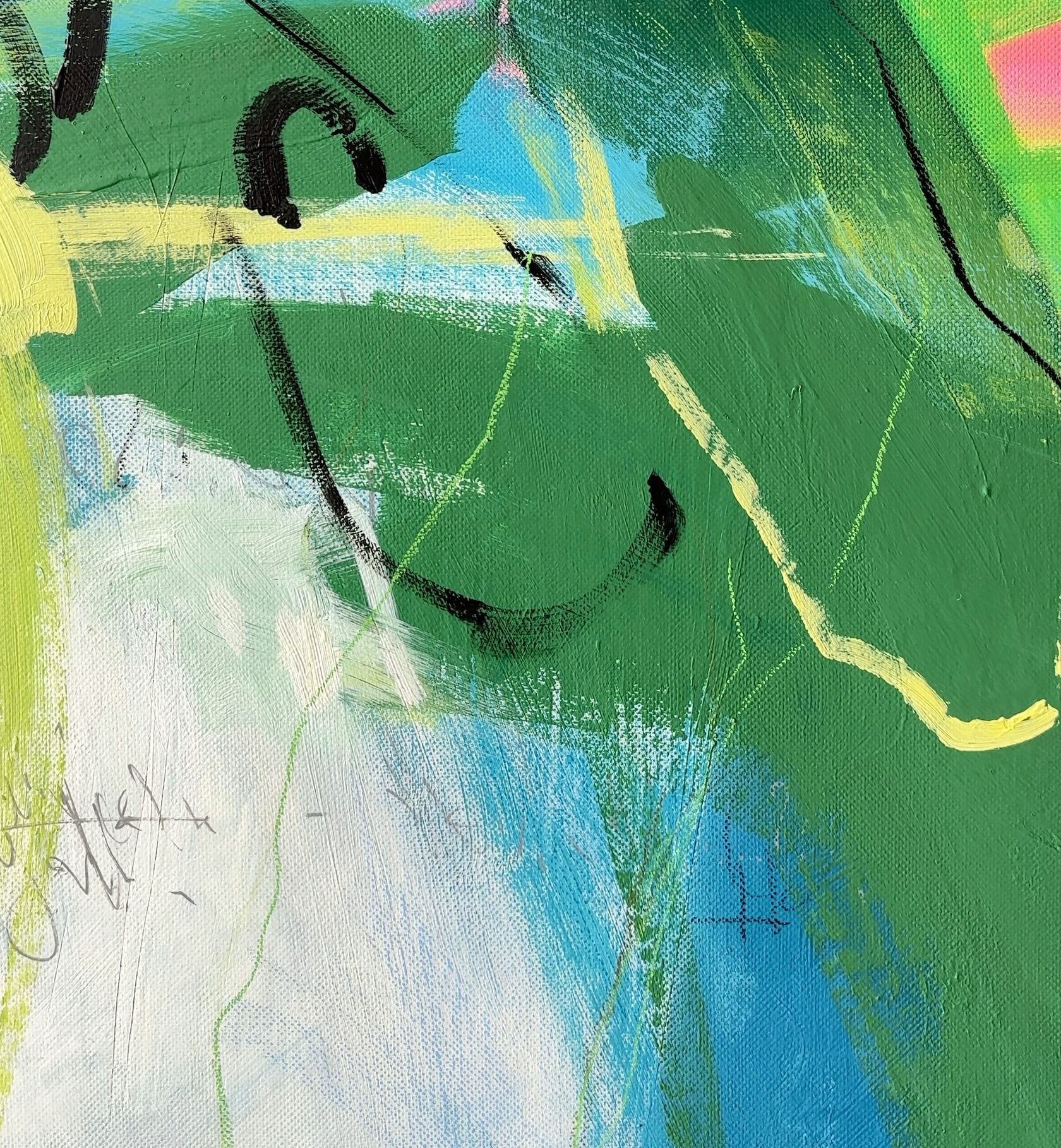 100×80 см, холст, акрил, масляная пастель, 2025 Картина из ботанической серии, в которой растения становятся метафорой внутренних состояний. В этой работе листья кротона распахиваются уверенно и резко. Они будто распирают пространство, пробиваясь сквозь текстуры. В зелёной массе чувствуется напряжение — как будто что-то назревает внутри и вот-вот прорвётся. Розовый и голубой фон — не просто цвет, а настроение: он задаёт внутренний конфликт, тревожную яркость, на фоне которой зелень выглядит особенно живой. Черные и жёлтые линии не декоративны, они будто фиксируют движение или колебание — как записи в дневнике, сделанные на взлёте эмоции. Это не иллюстрация растения, а ощущение от него. Кротон здесь — как символ накопленной силы, которая ищет форму. Это про внутренний рост, не всегда гладкий, но неизбежный.