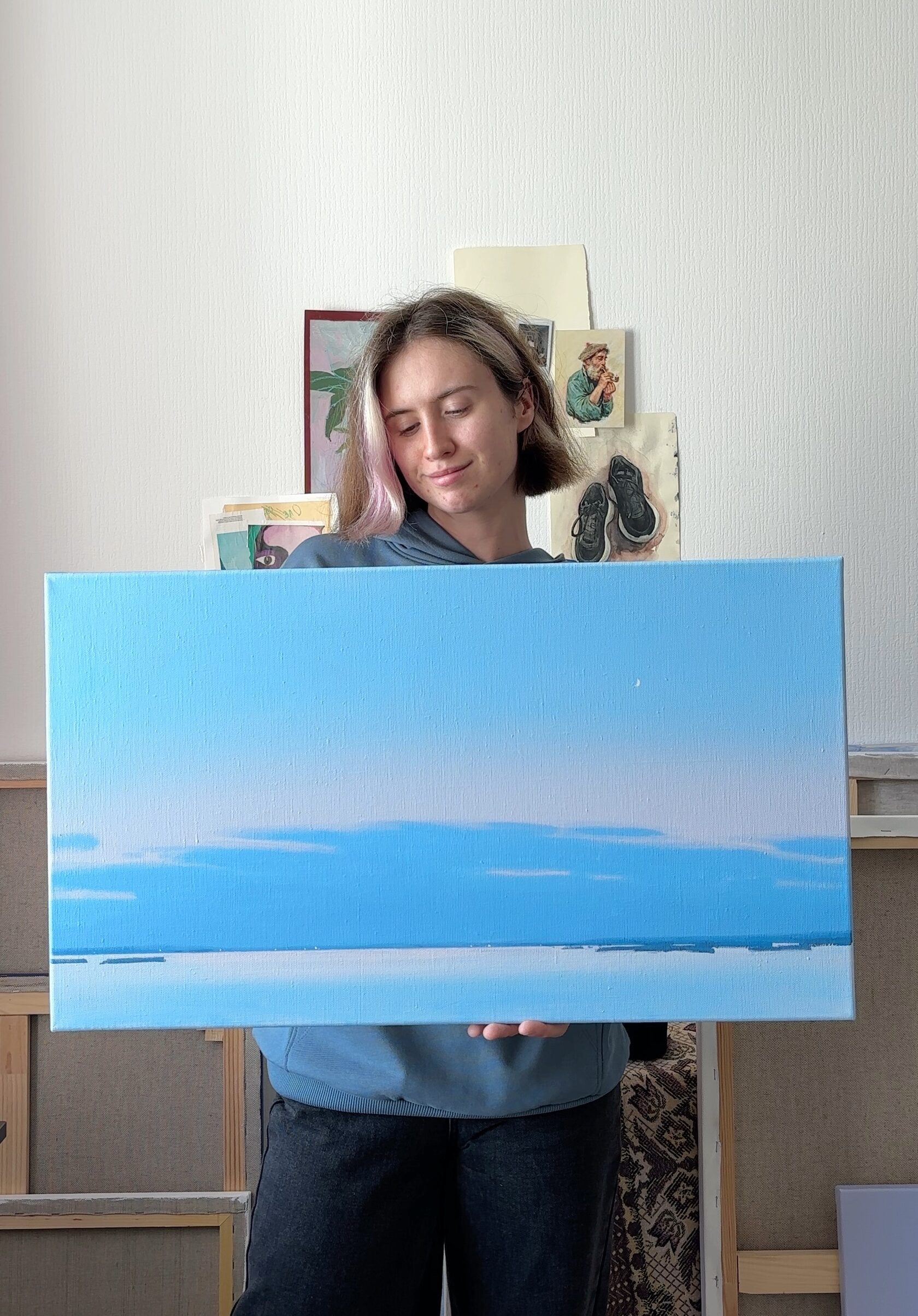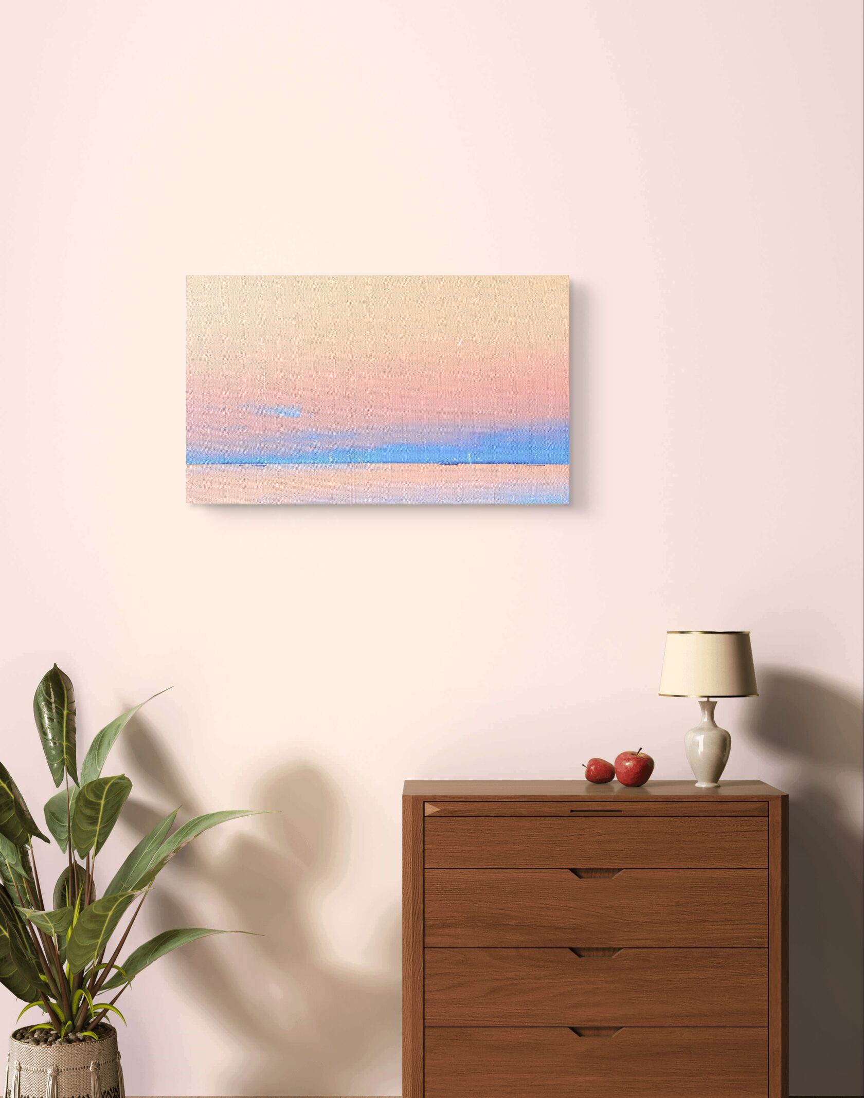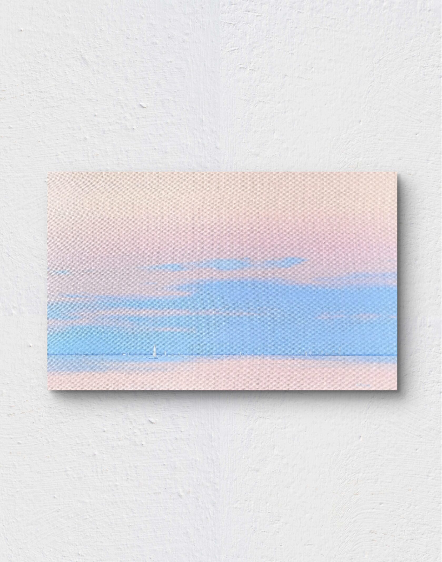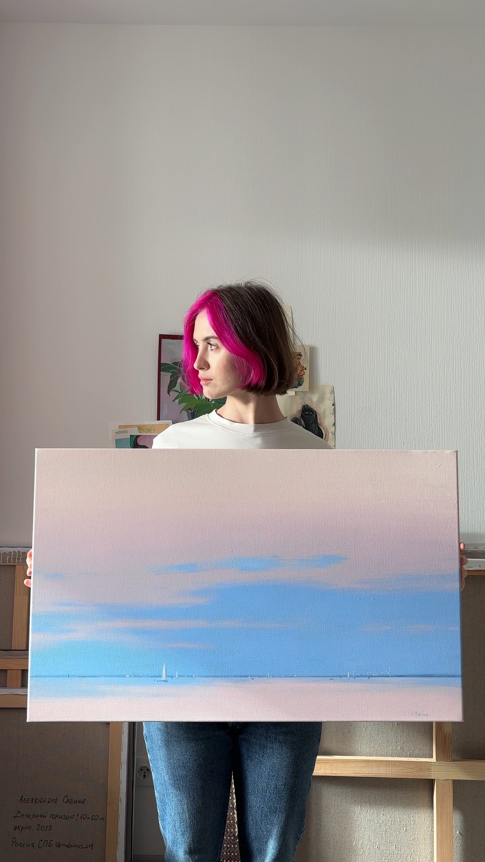 В этой работе отражено чувство покоя и безмятежности, наблюдение за моментом встречи неба и воды на горизонте Финского залива. Нежные переливы голубого и приглушенных оранжевых создают эффект зыбкого сна, а маленькие паруса вдали добавляют ощущение свободы и лёгкого движения. Картина наполнена воздухом, тишиной и прозрачным светом, тем самым состоянием, когда хочется просто смотреть и наслаждаться спокойствием момента.