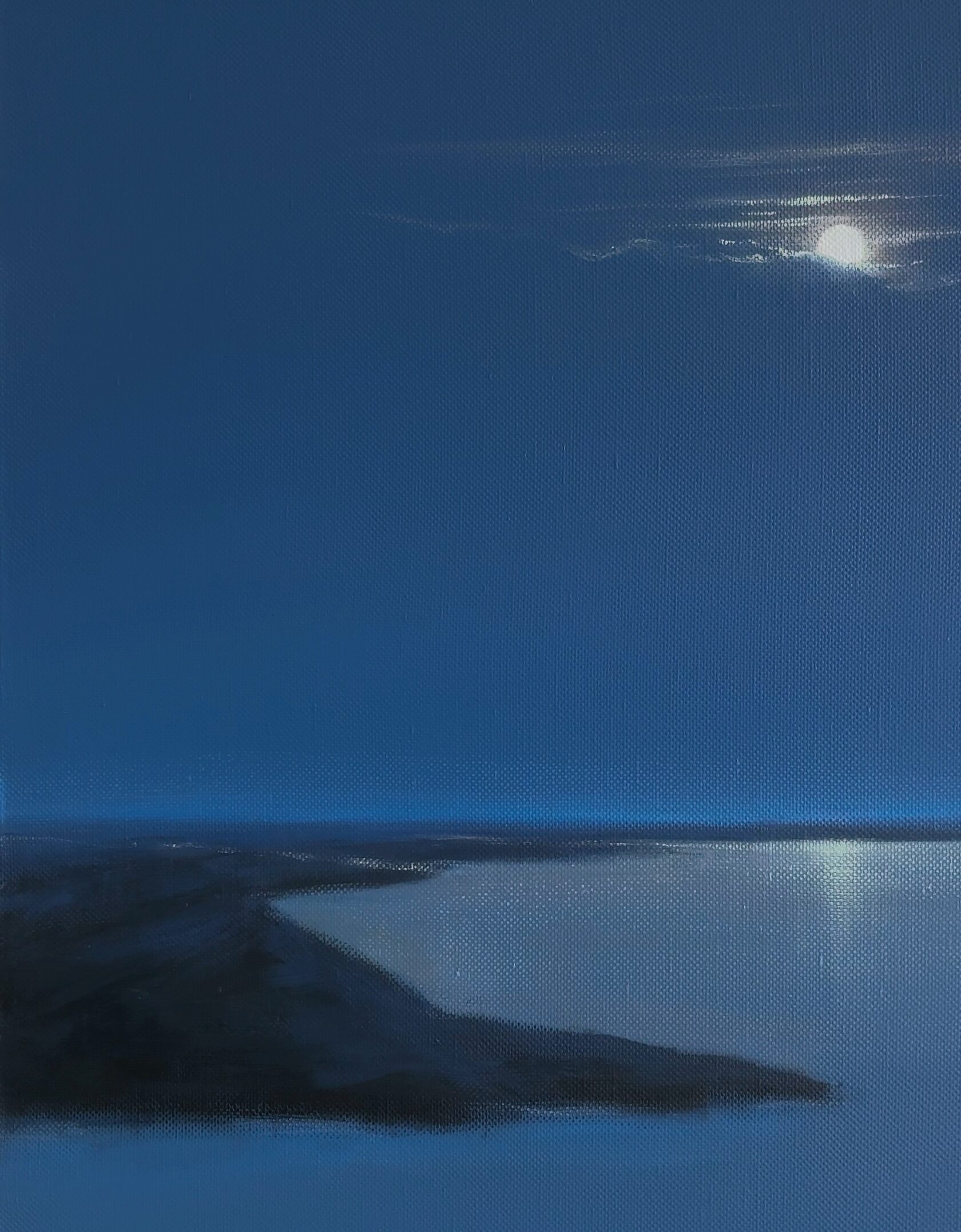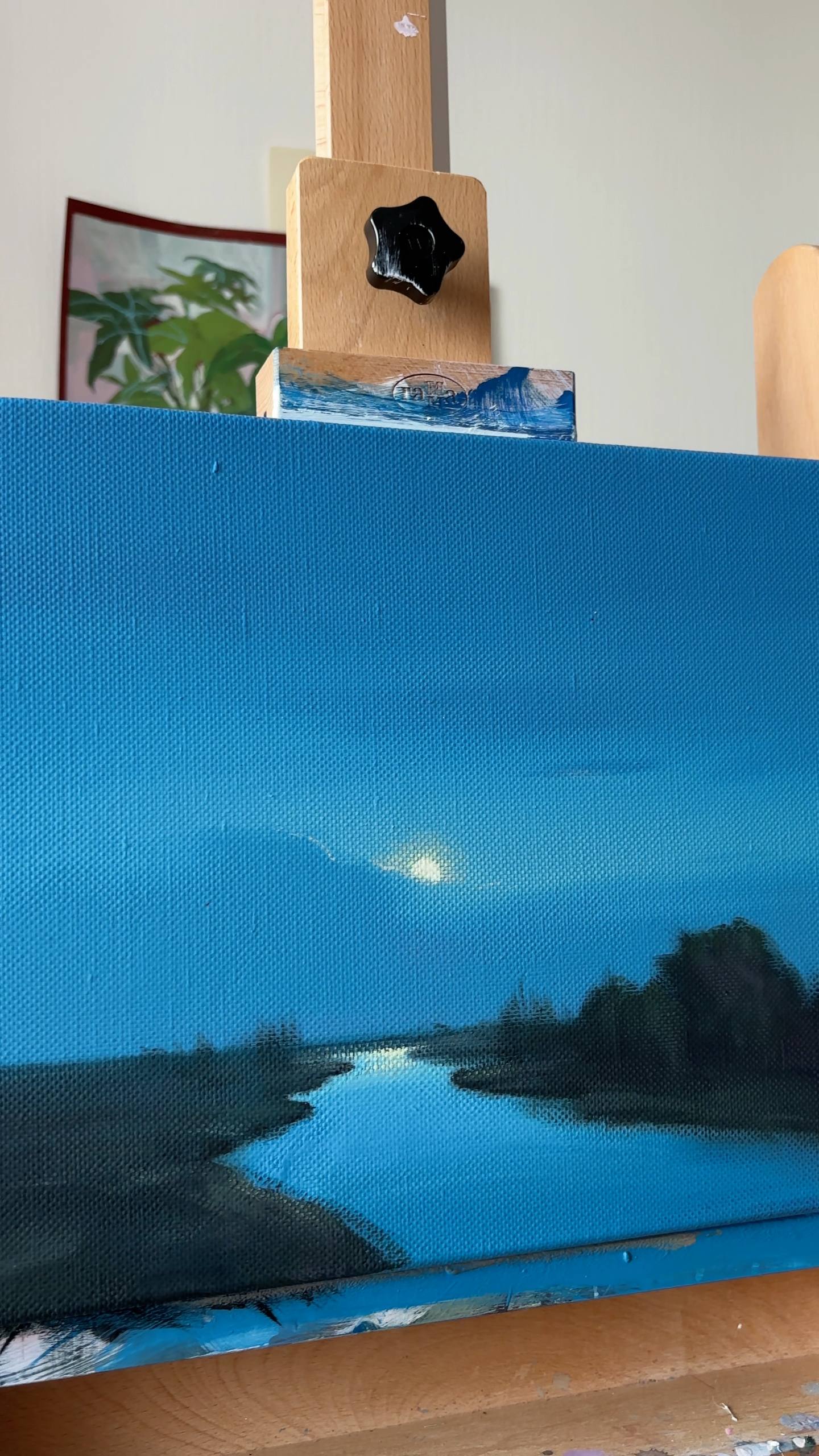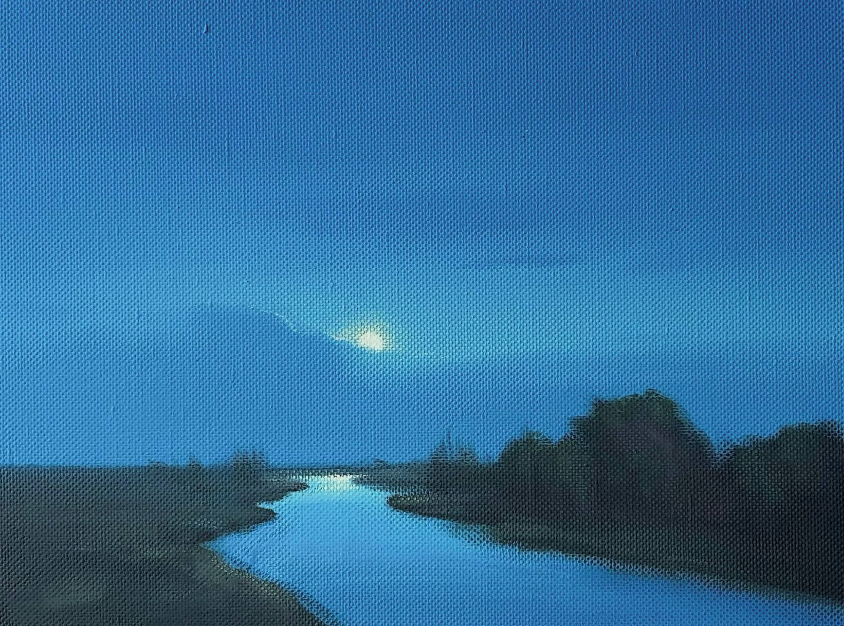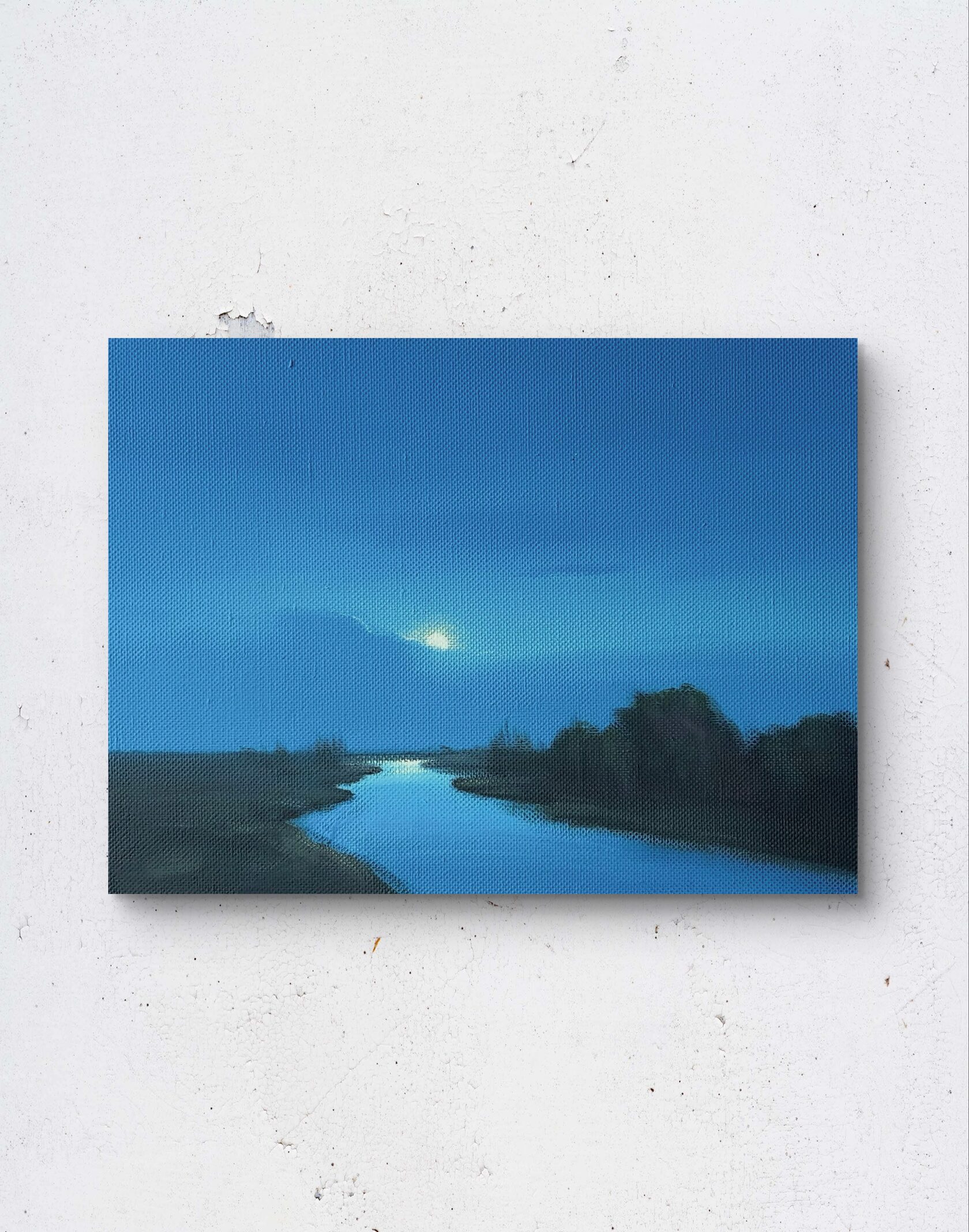 Тихая ночь, когда свет луны становится единственным источником сияния. Он отражается в воде и растворяется в холодных оттенках синего, превращая пейзаж в созерцательную, почти медитативную сцену. Здесь нет движения, только покой и мерцание ночи.