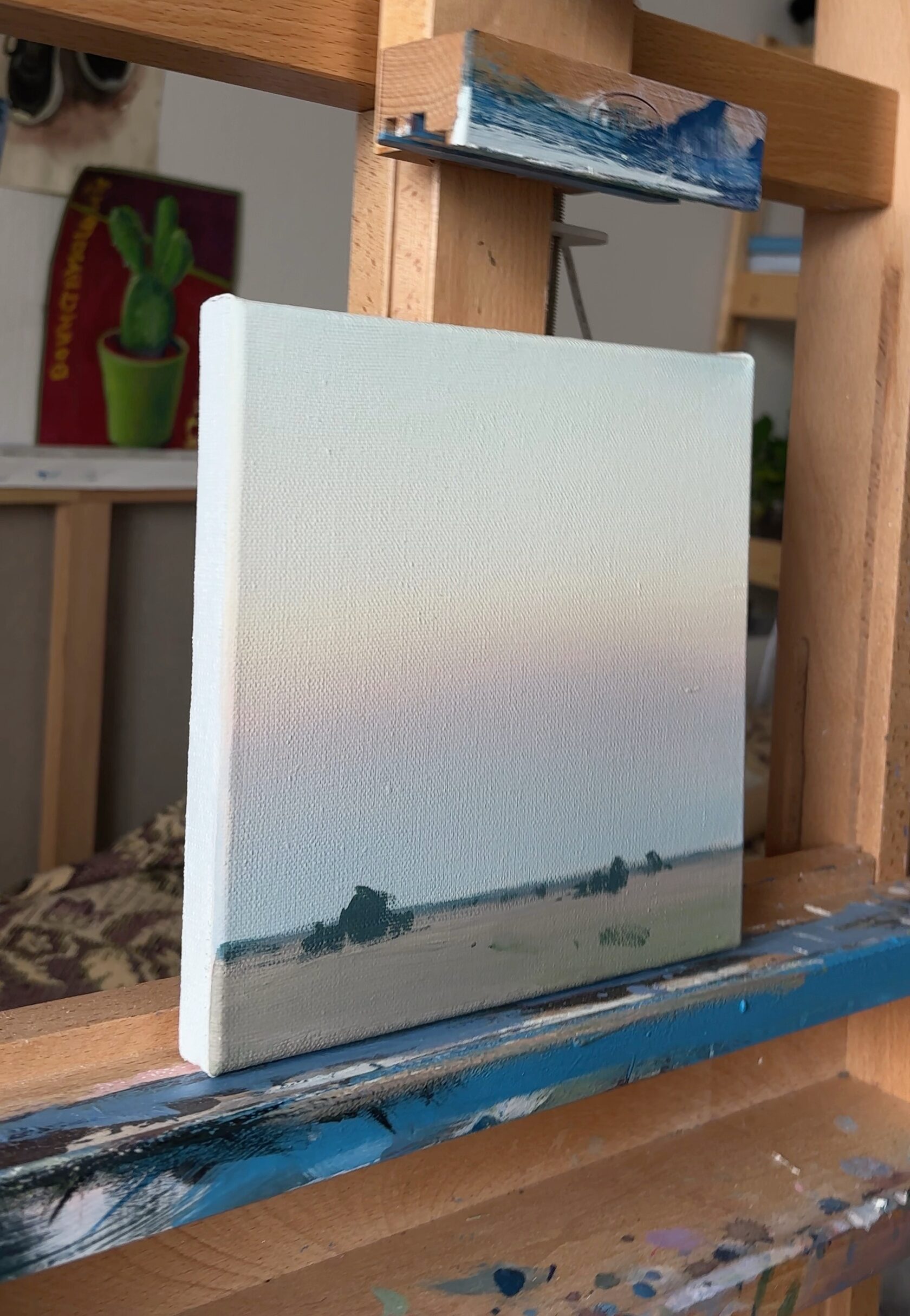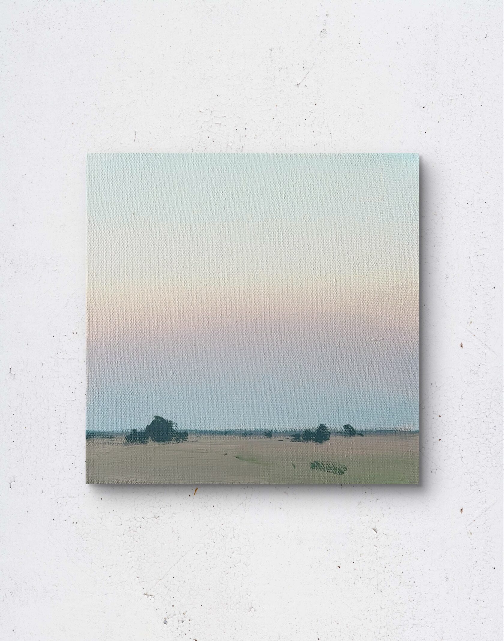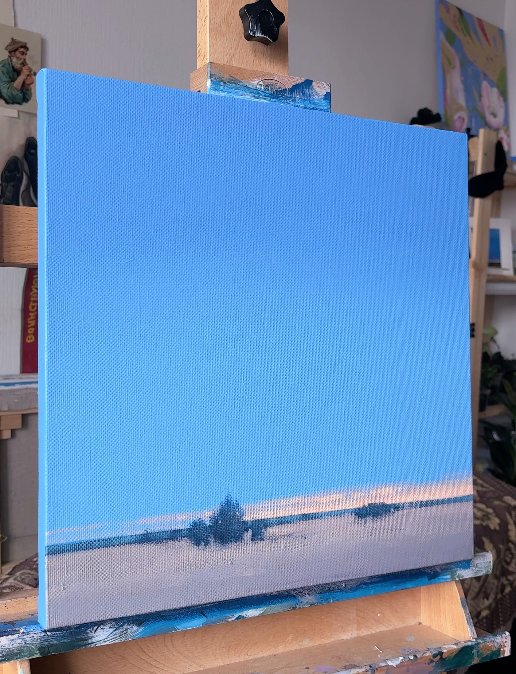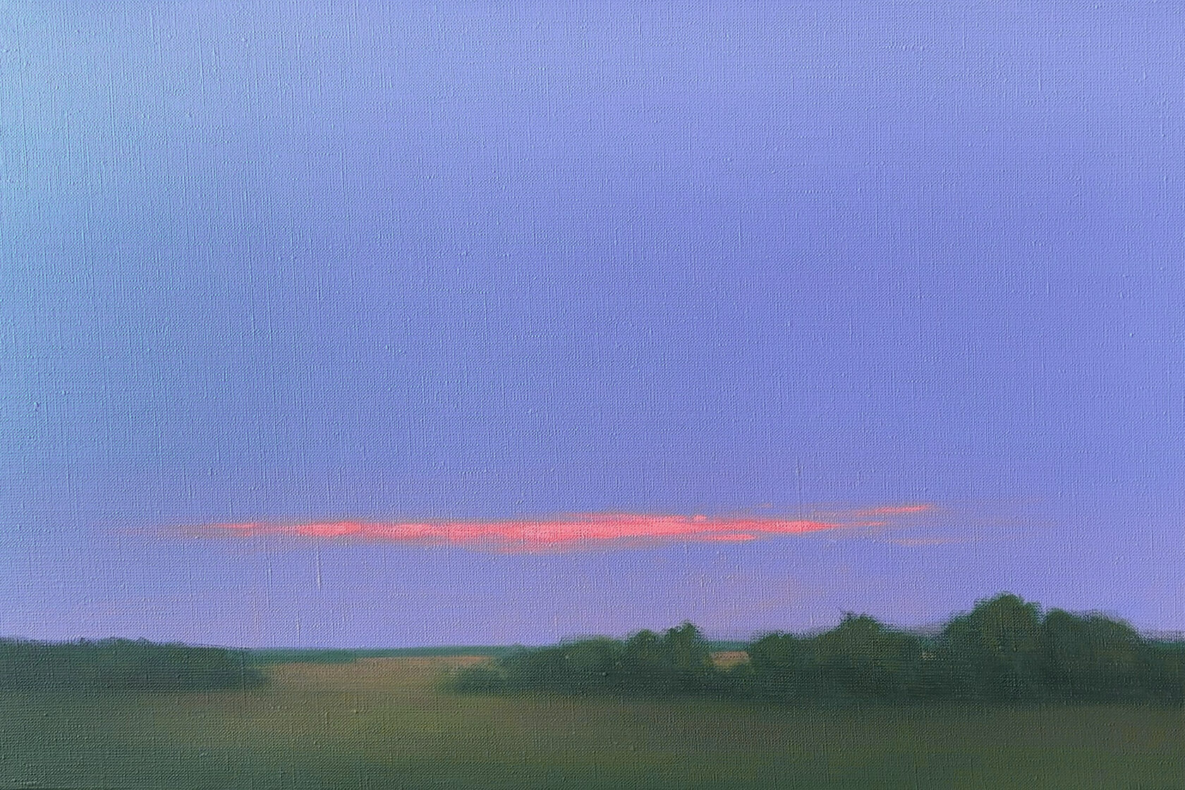 Работа из серии минималистичных пейзажей, исследующих состояние тишины и пространственной свободы. Лаконичная композиция и выверенные цветовые переходы создают эффект медленного дыхания природы. Силуэты деревьев, растворяющиеся в линии горизонта, и мягкая розово-голубая дымка неба фиксируют момент, когда день уступает место ночи.