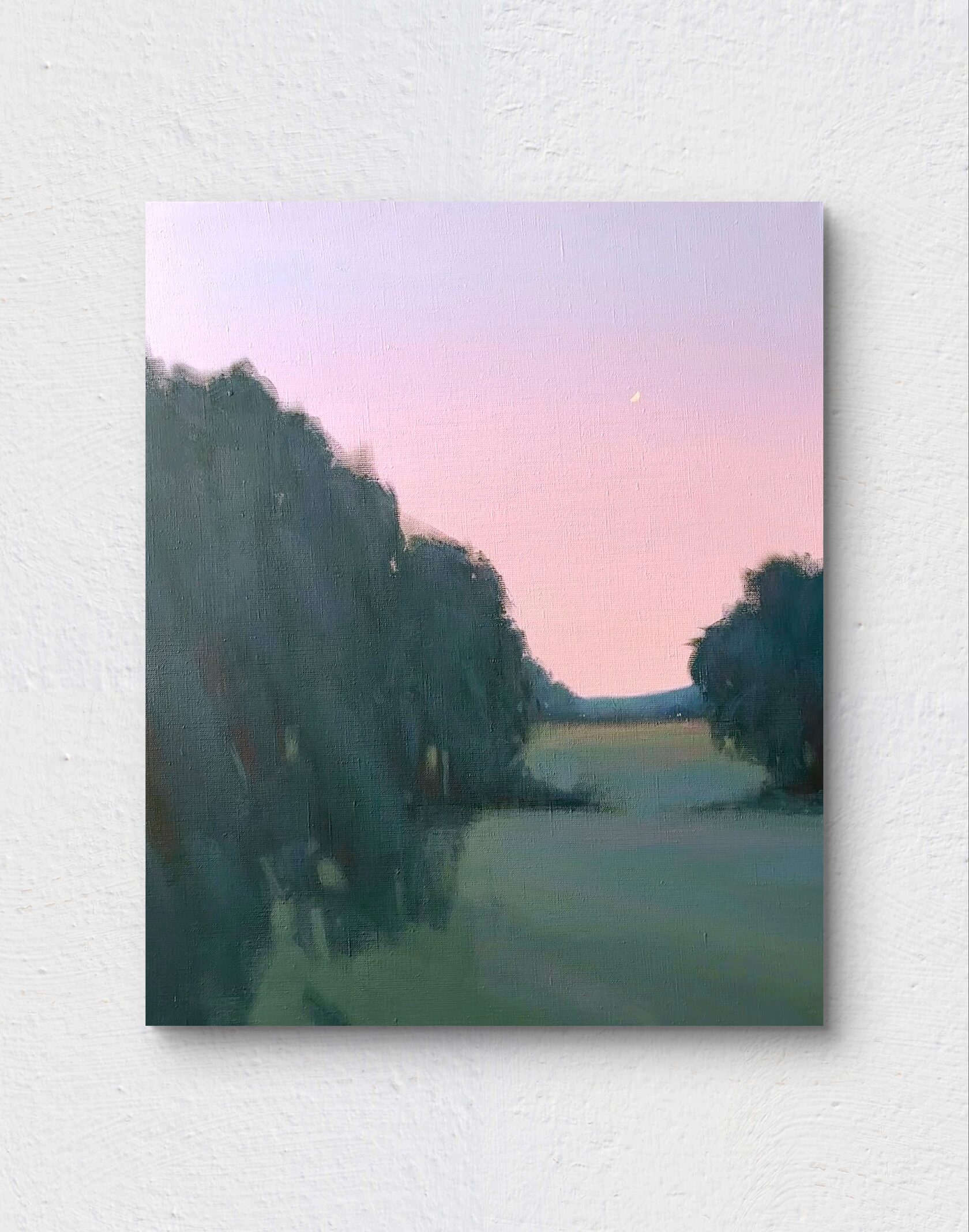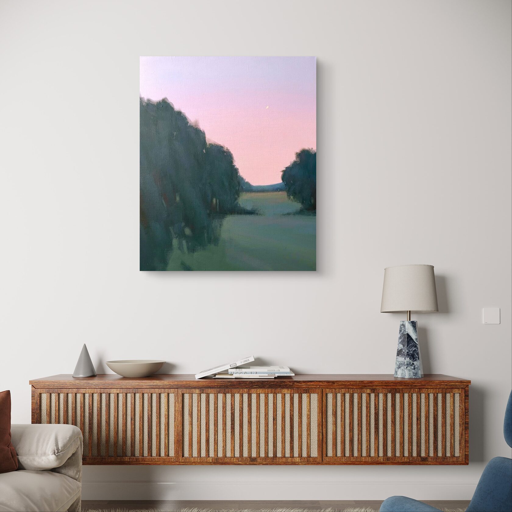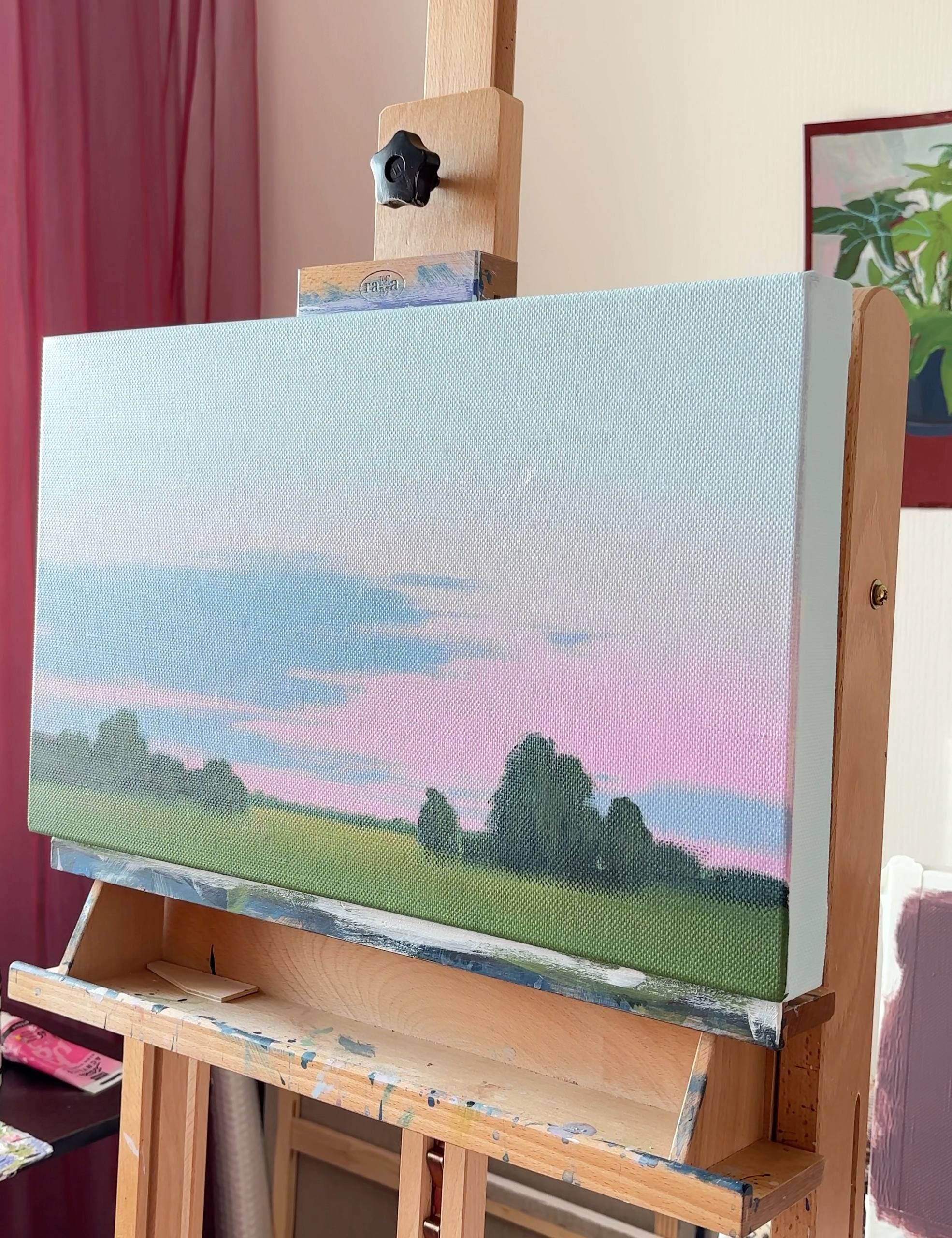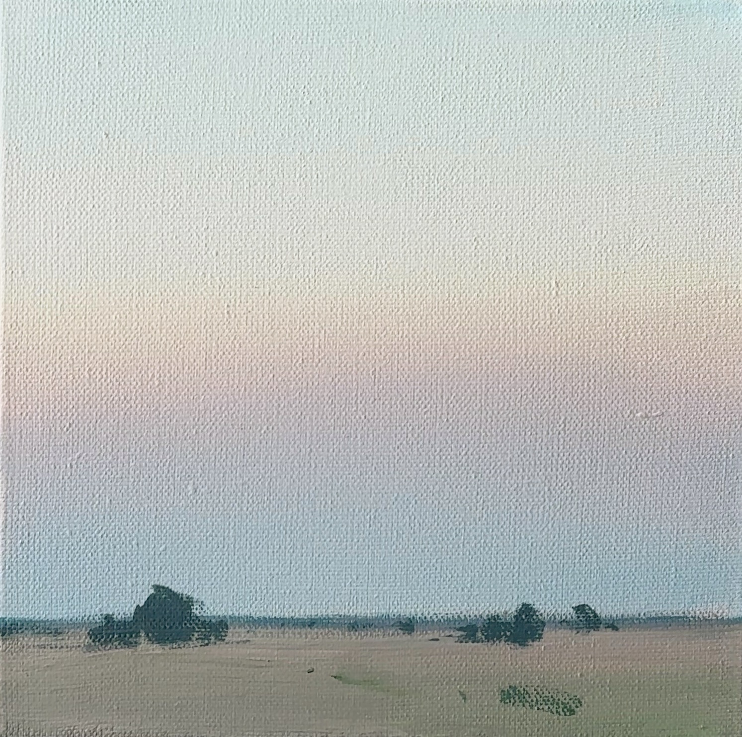 Работа из серии минималистичных пейзажей, исследующих состояние тишины и пространственной свободы. Лаконичная композиция и выверенные цветовые переходы создают эффект медленного дыхания природы. Силуэты деревьев, растворяющиеся в линии горизонта, и мягкая розово-голубая дымка неба фиксируют момент, когда день уступает место ночи.