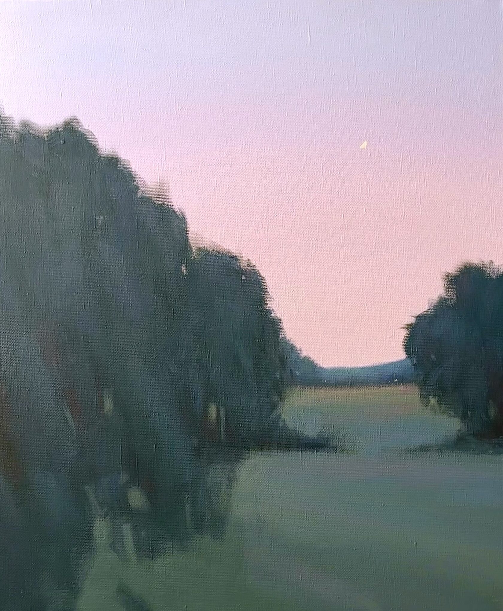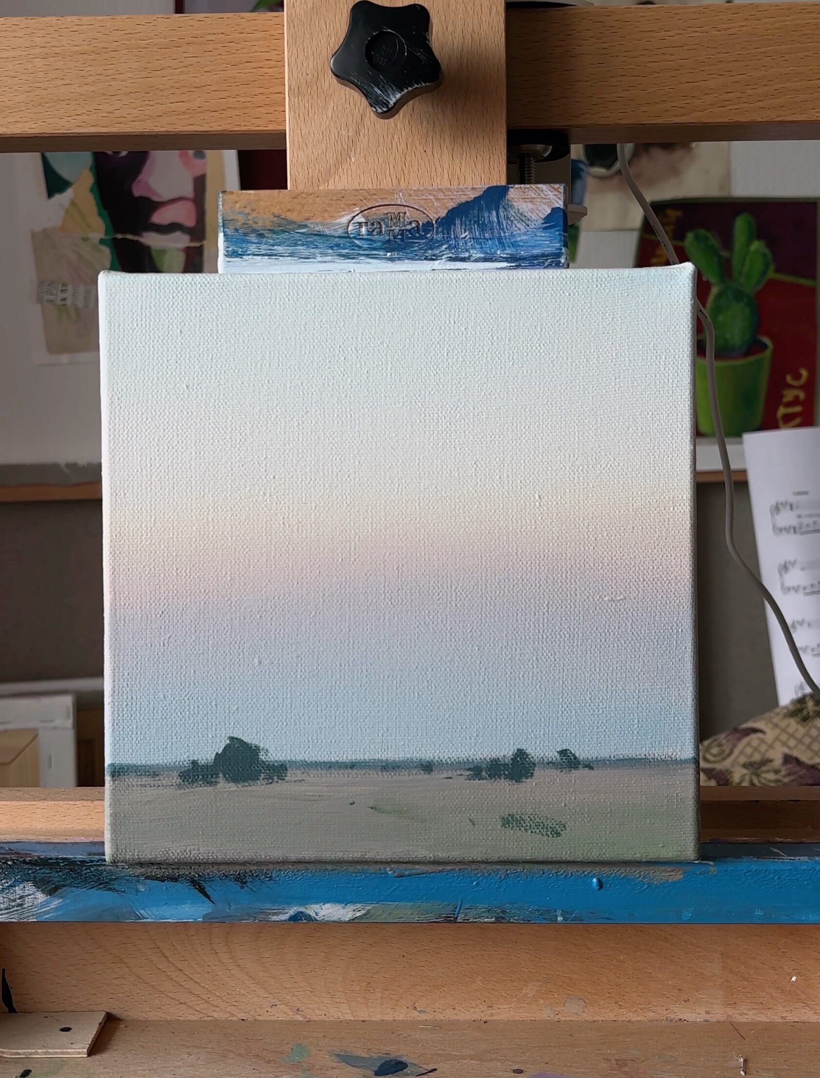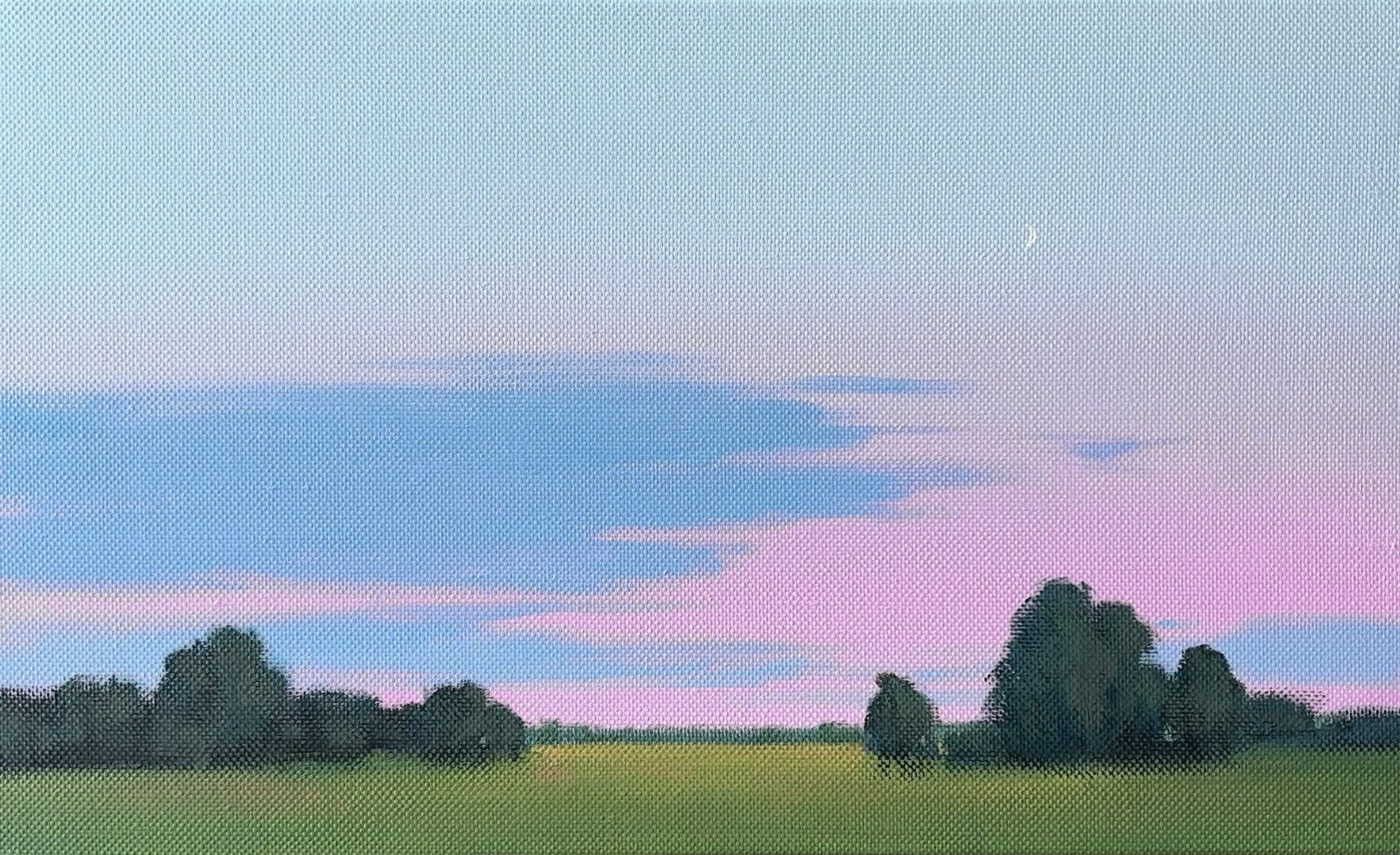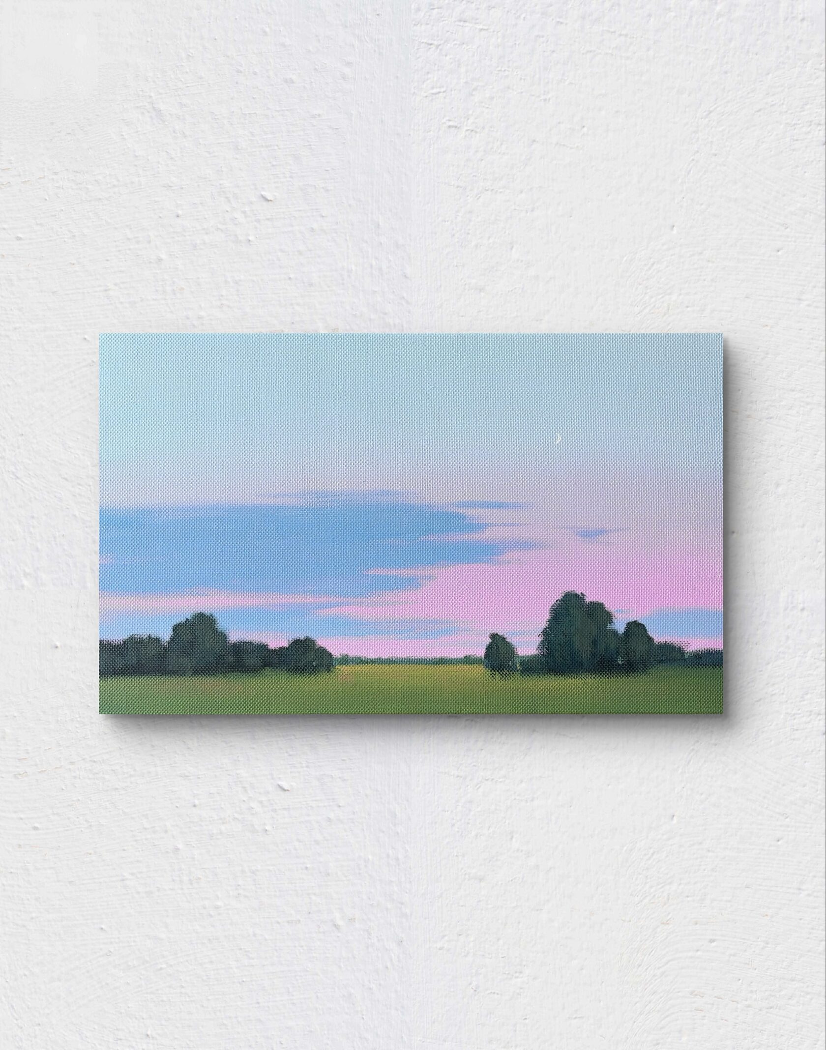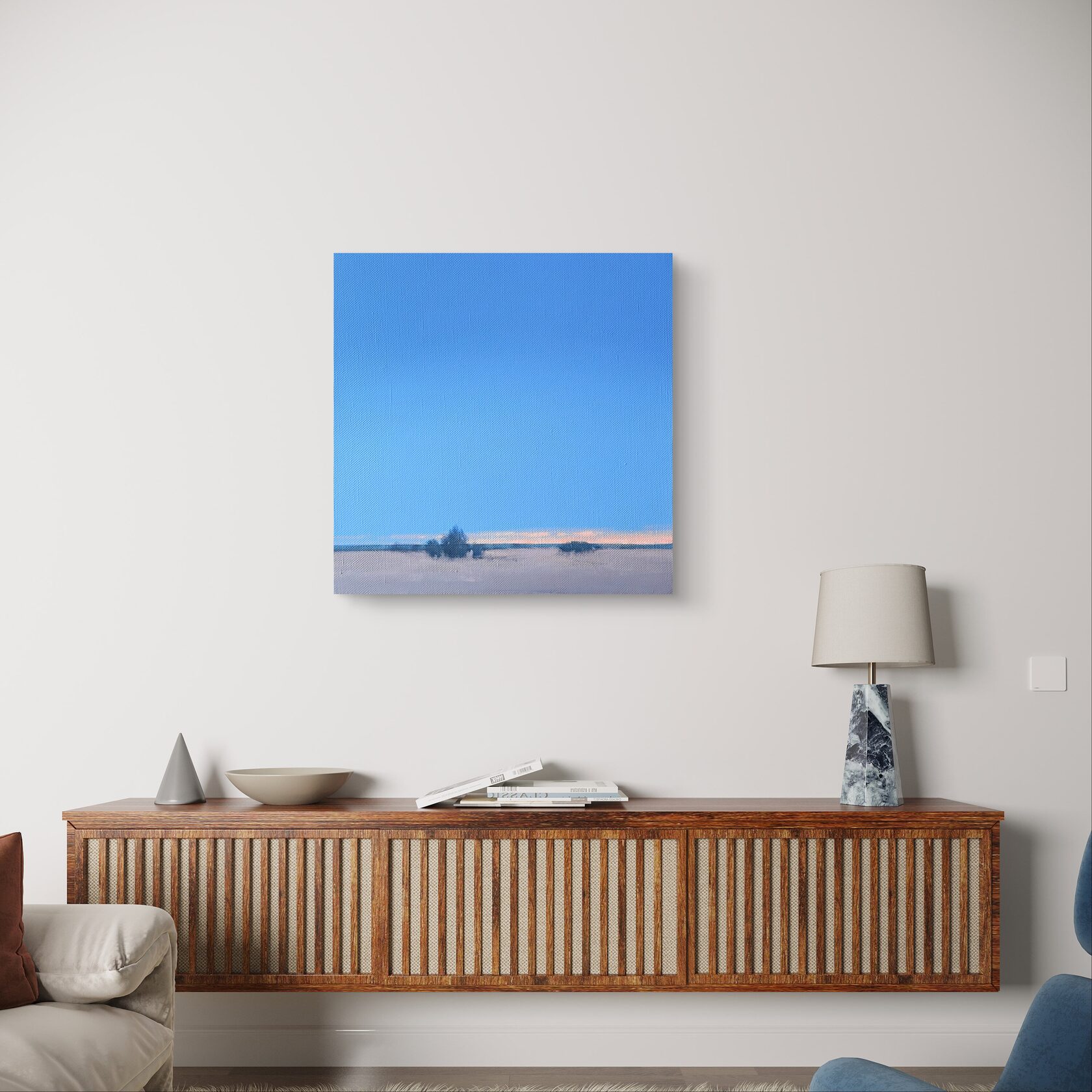 Работа из серии минималистичных пейзажей, исследующих состояние тишины и пространственной свободы. Лаконичная композиция и выверенные цветовые переходы создают эффект медленного дыхания природы. Силуэты деревьев, растворяющиеся в линии горизонта, и мягкая розово-голубая дымка неба фиксируют момент, когда день уступает место ночи.