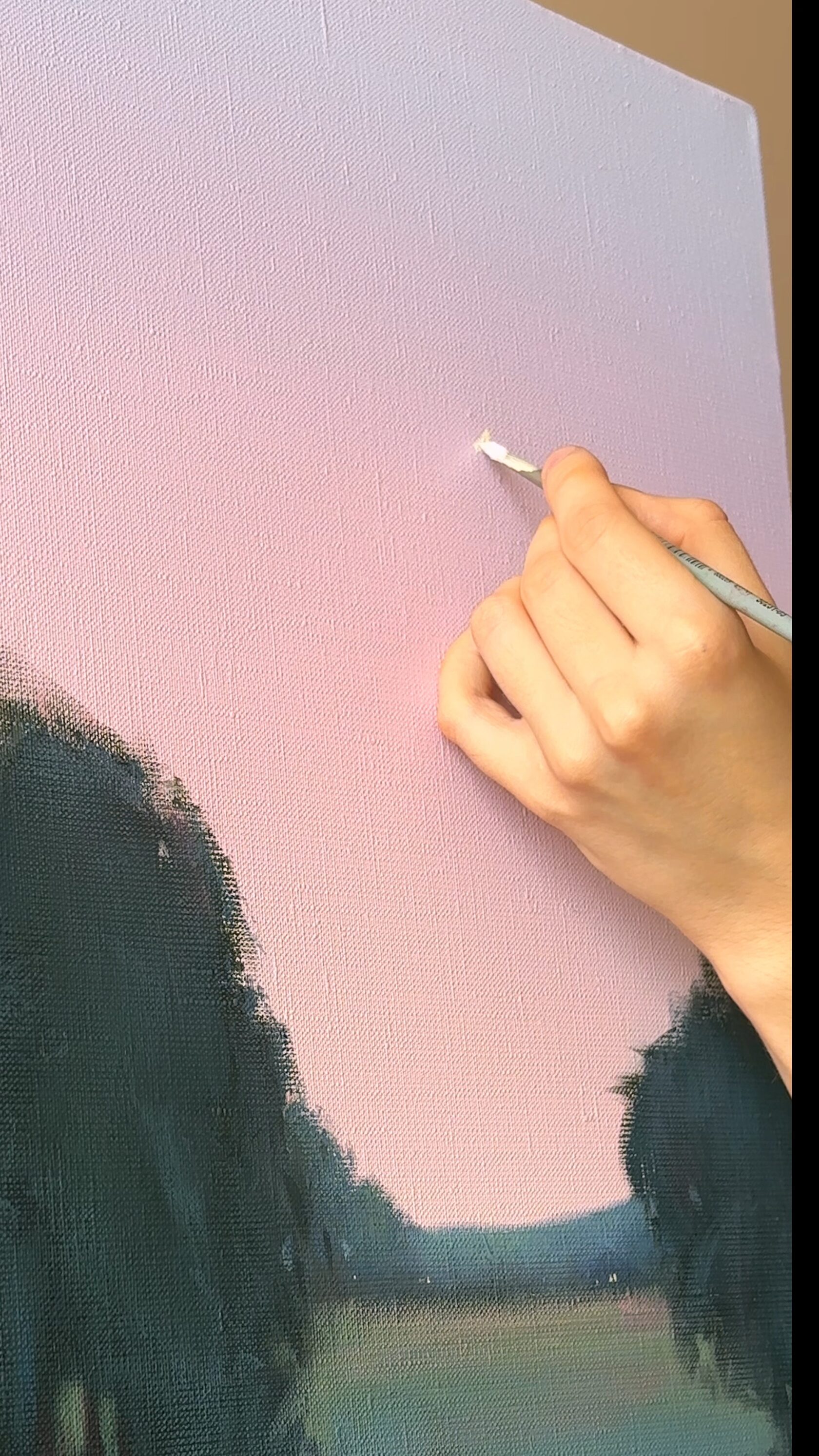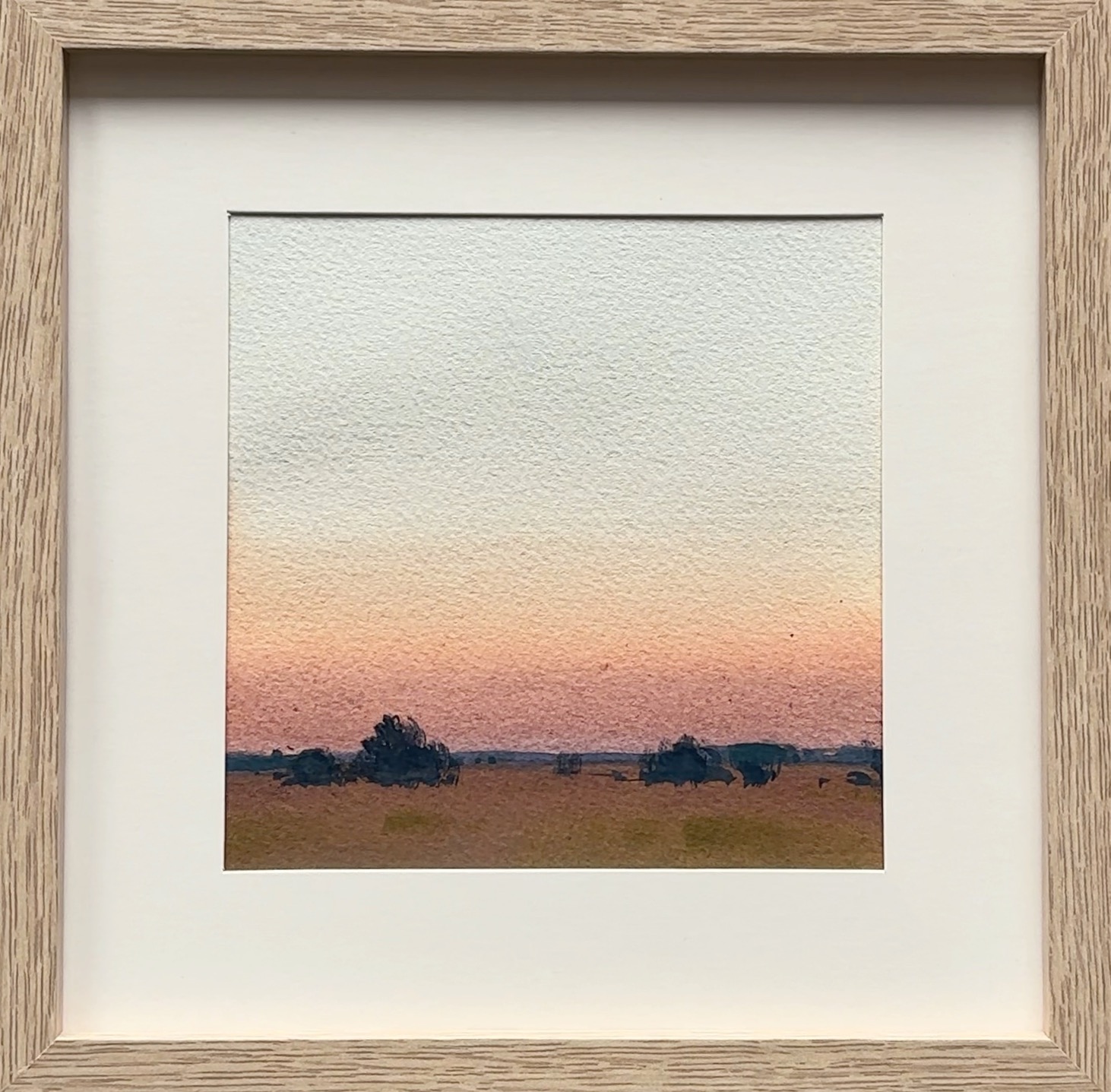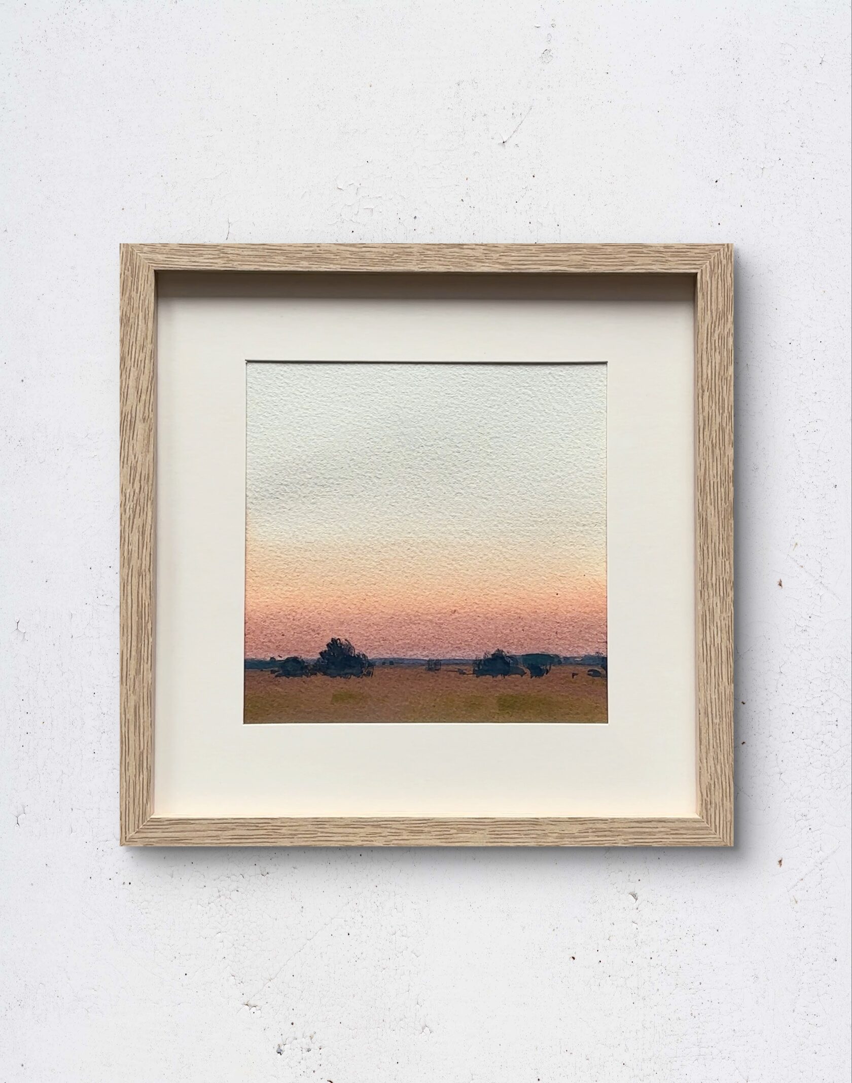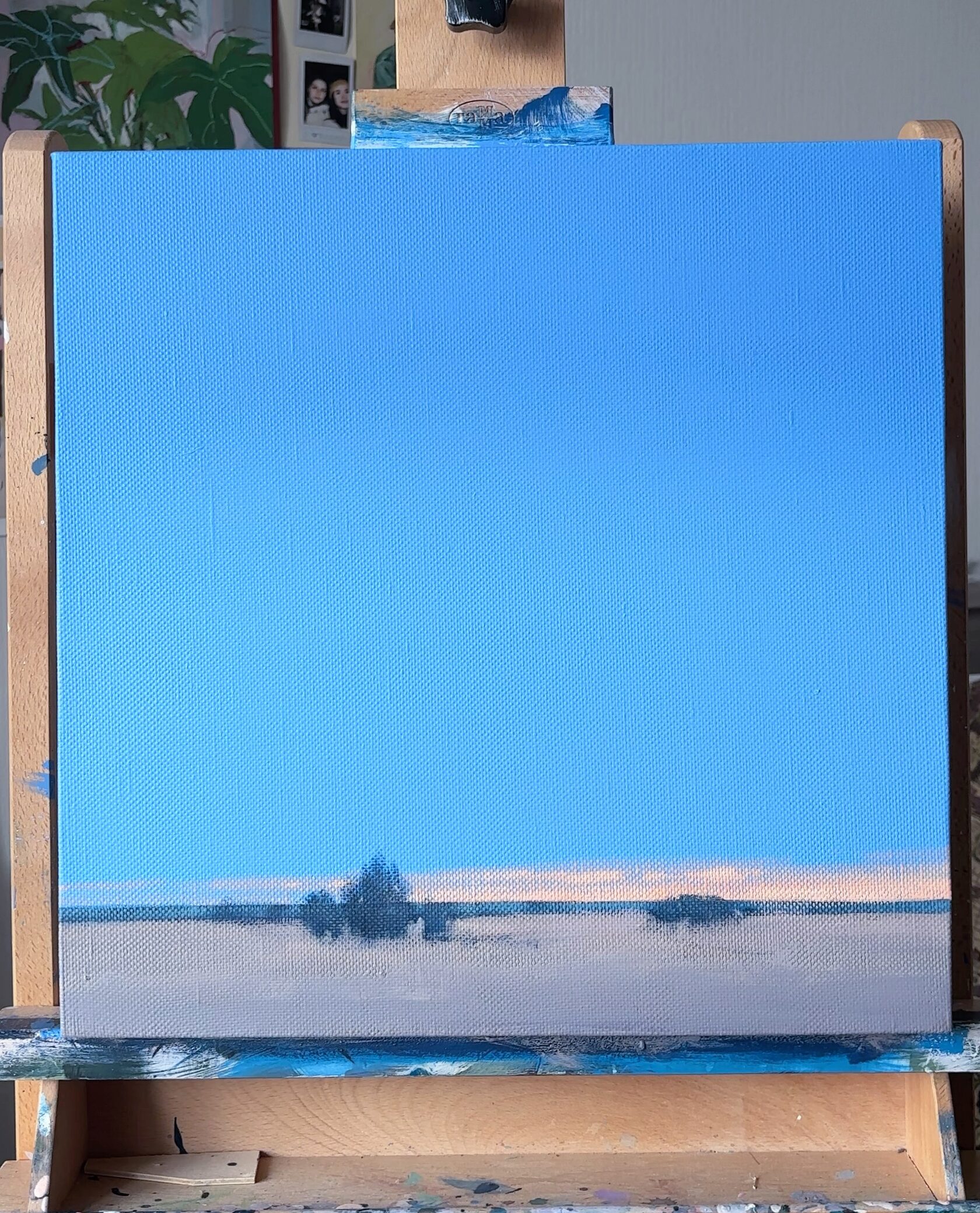 Работа из серии минималистичных пейзажей, исследующих состояние тишины и пространственной свободы. Лаконичная композиция и выверенные цветовые переходы создают эффект медленного дыхания природы. Силуэты деревьев, растворяющиеся в линии горизонта, и мягкая розово-голубая дымка неба фиксируют момент, когда день уступает место ночи.