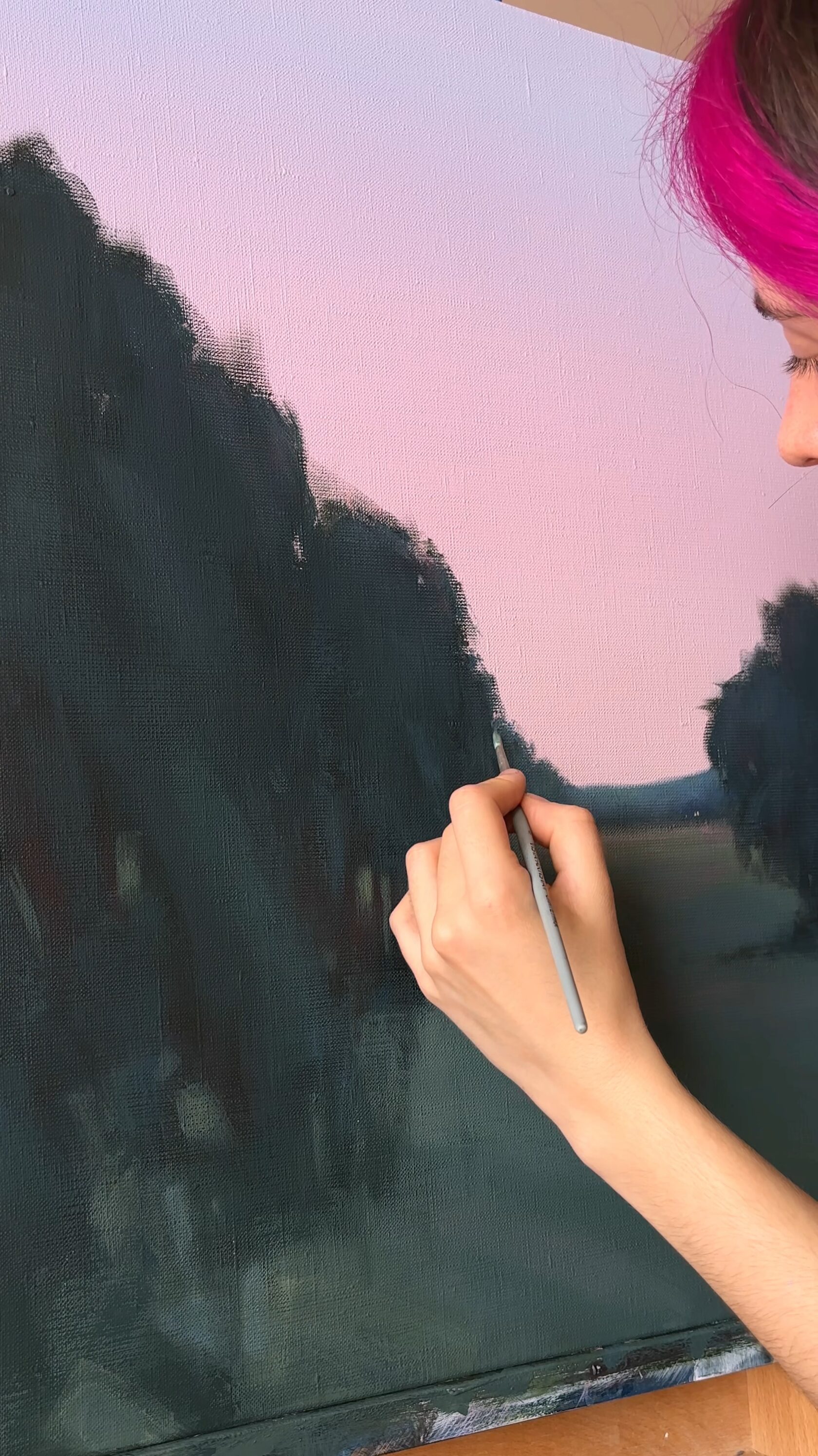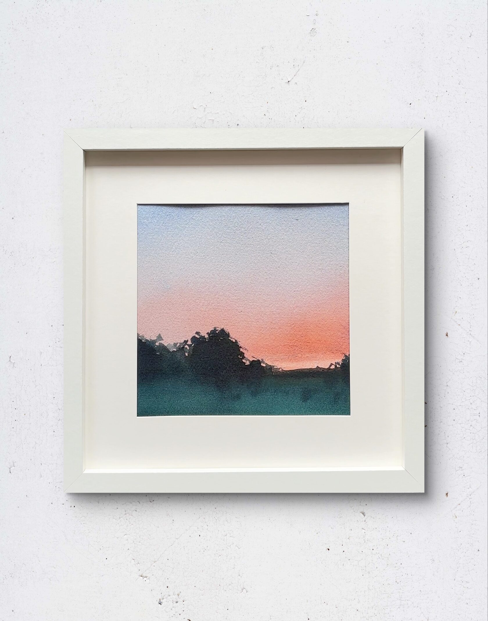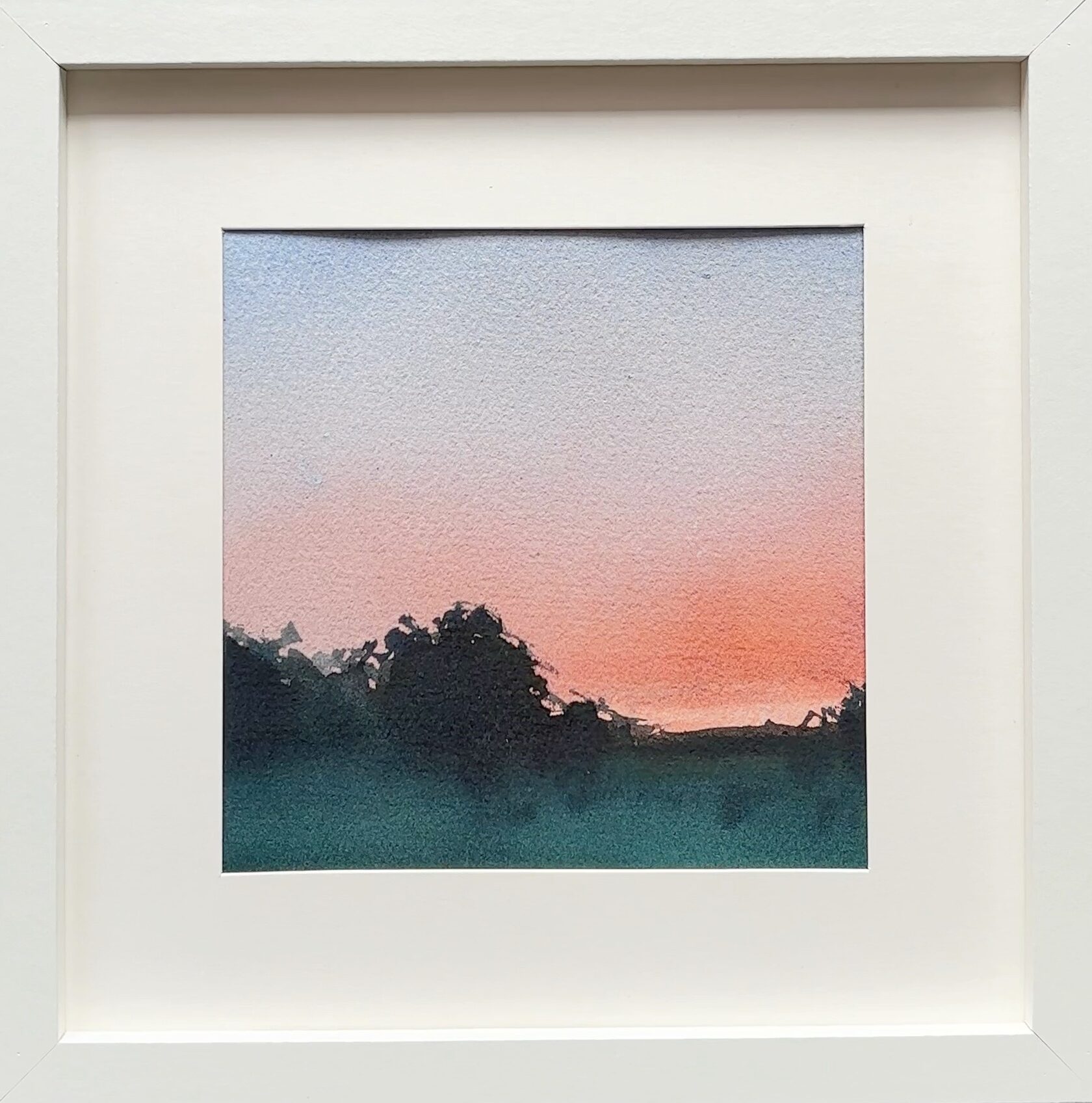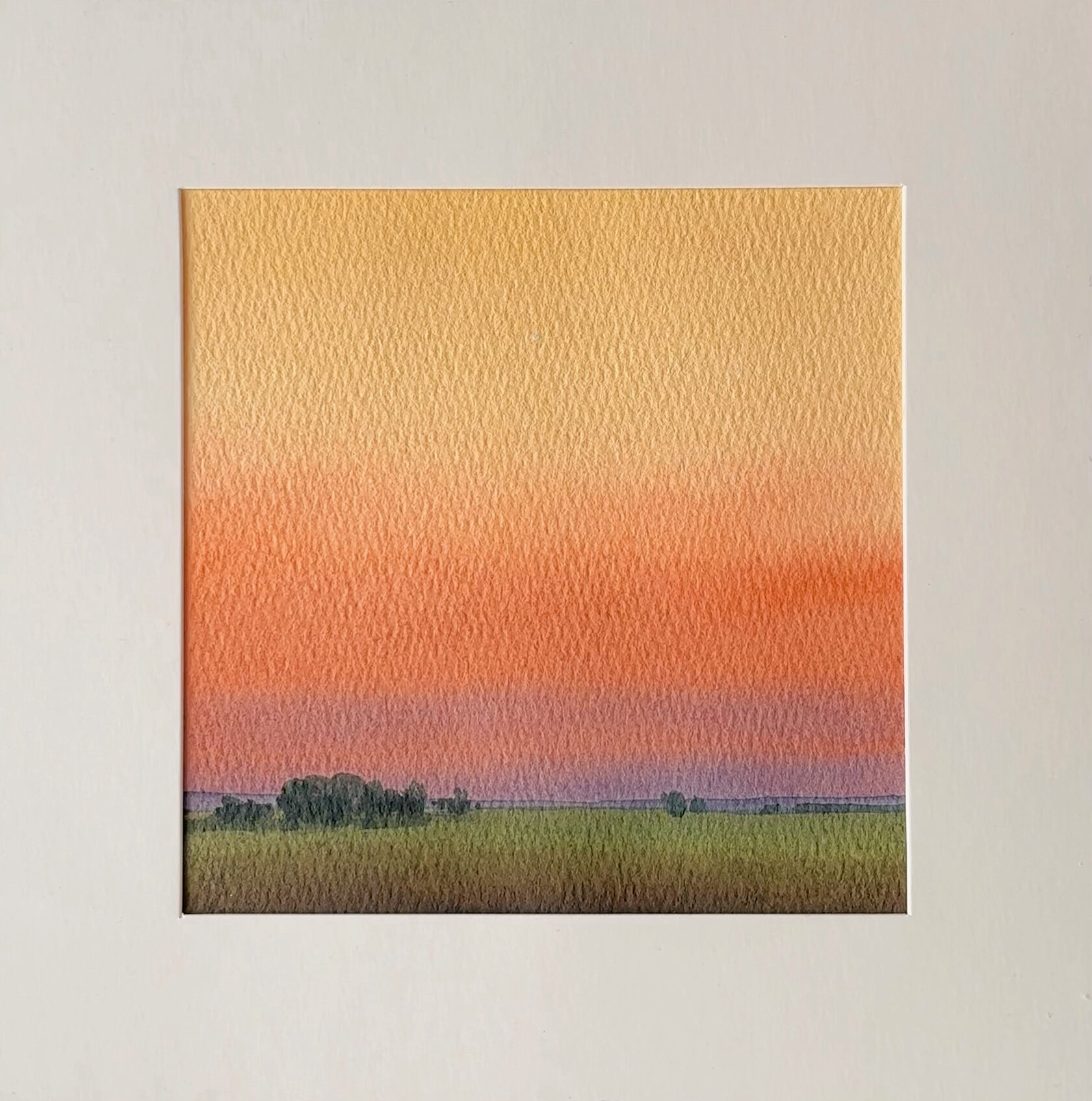 Работа из серии минималистичных пейзажей, исследующих состояние тишины и пространственной свободы. Лаконичная композиция и выверенные цветовые переходы создают эффект медленного дыхания природы. Силуэты деревьев, растворяющиеся в линии горизонта, и мягкая розово-голубая дымка неба фиксируют момент, когда день уступает место ночи.
