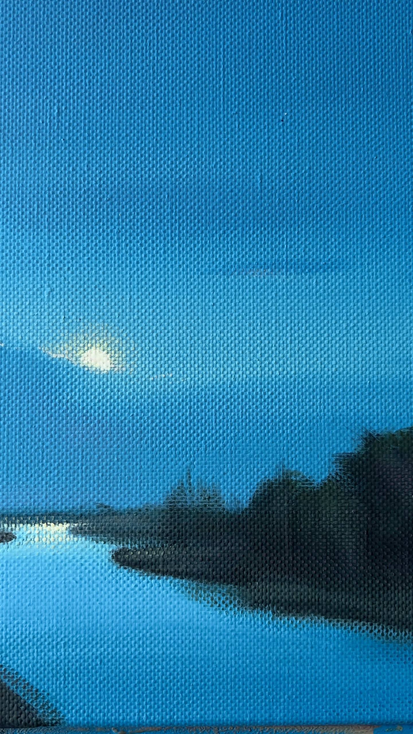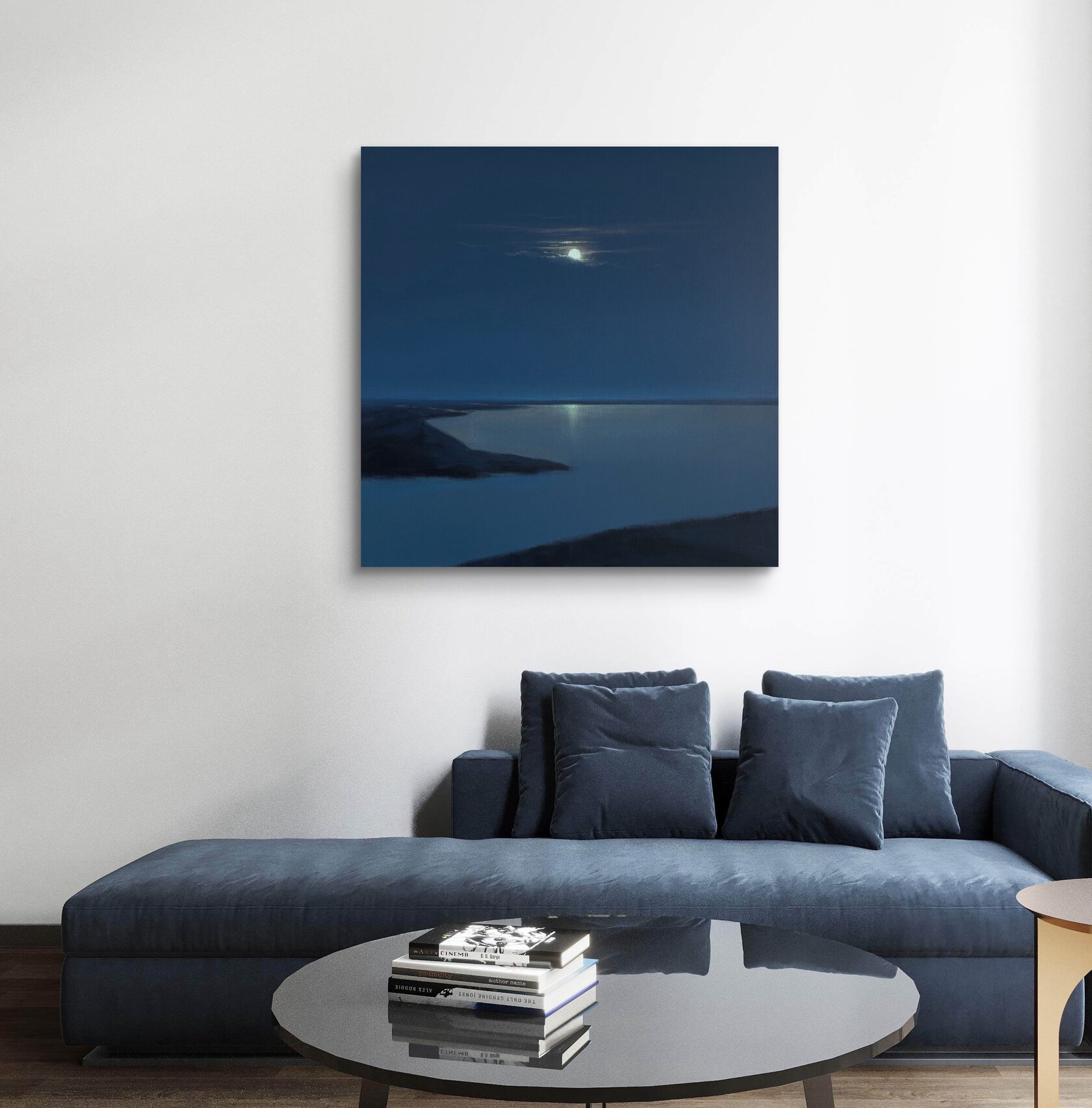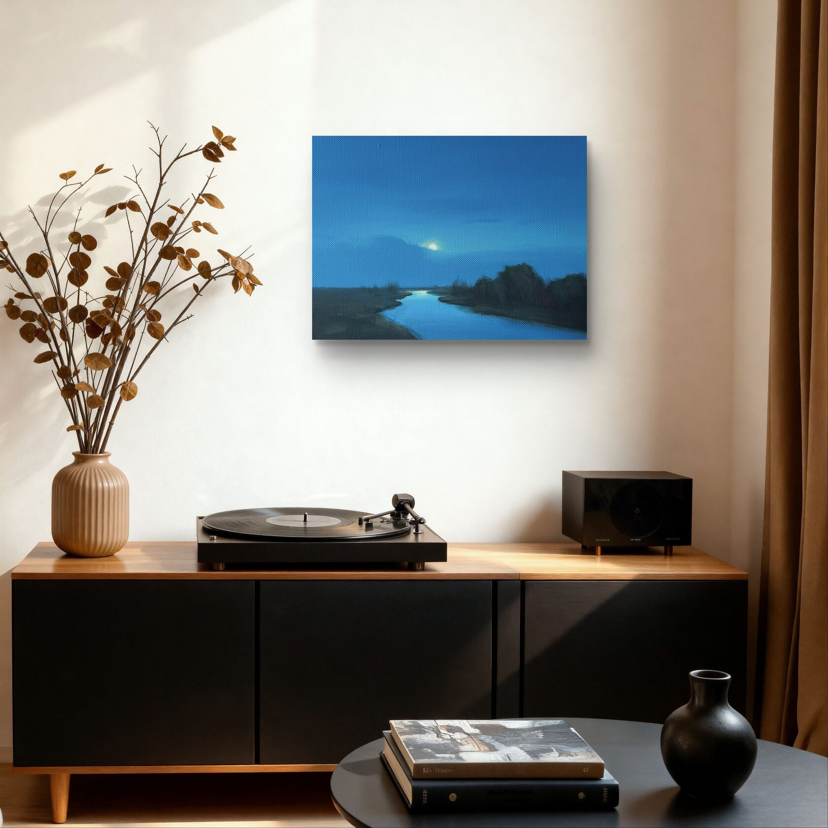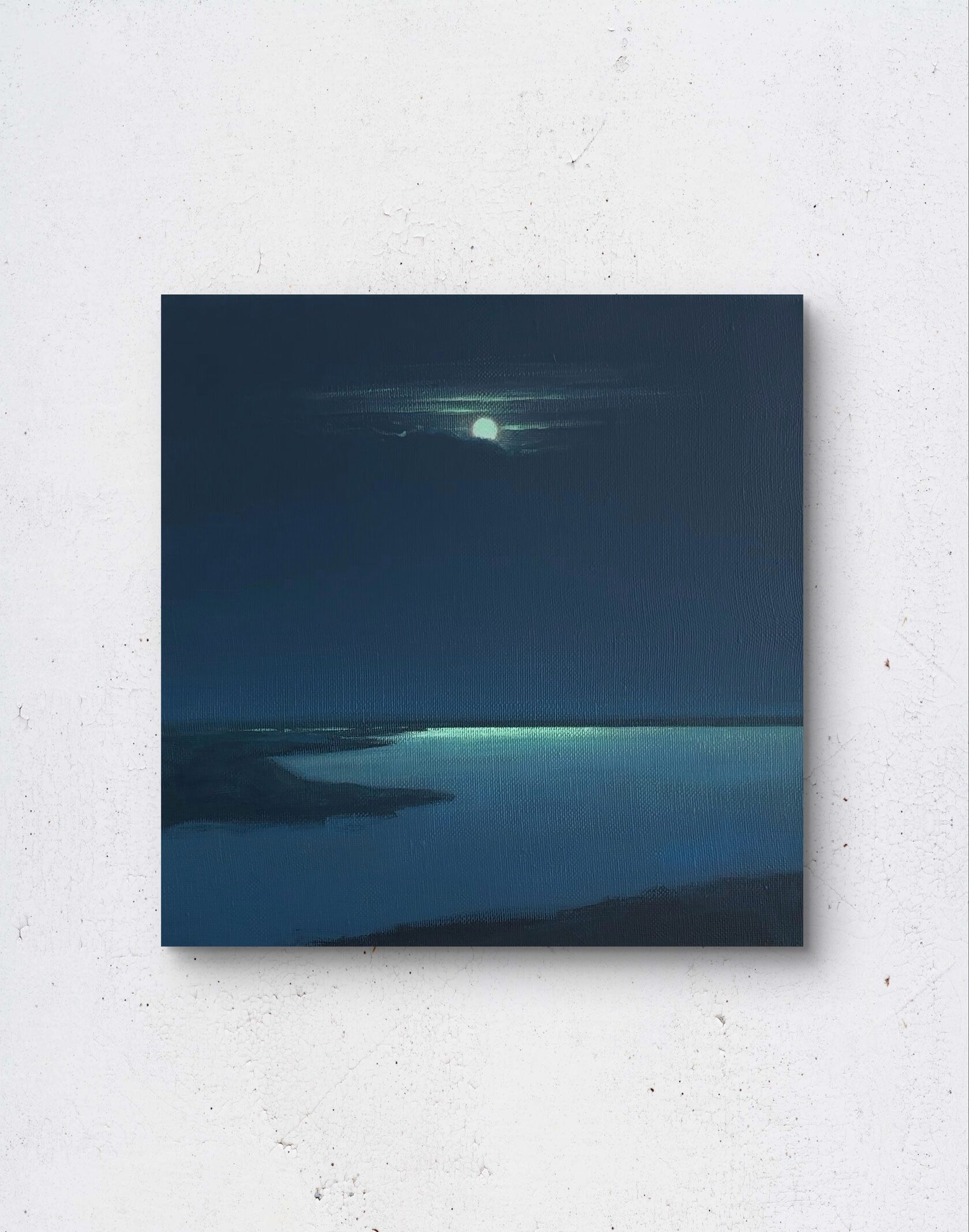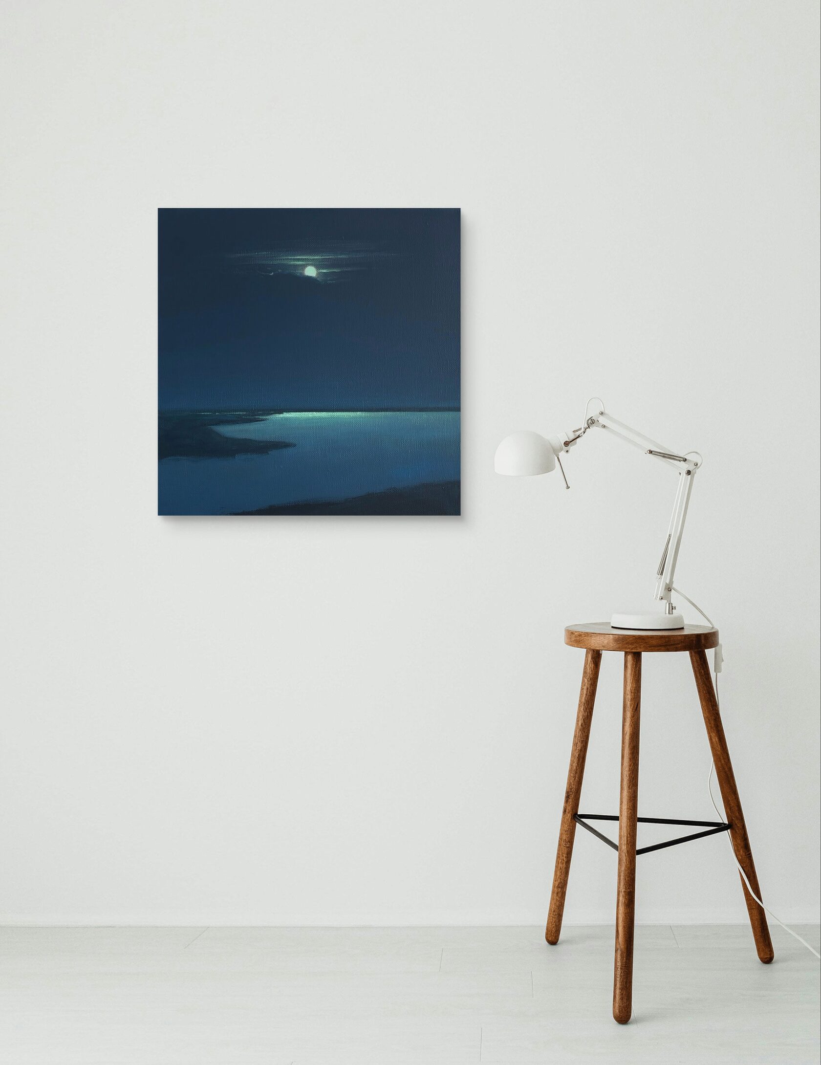 Глубокая тишина ночи, мерцание луны над водной гладью и ощущение спокойствия — всё это заключено в минималистичном пейзаже «Тихая ночь». Картина выполнена в темно-синих и приглушённых тонах, создающих атмосферу уединения и внутренней тишины.
