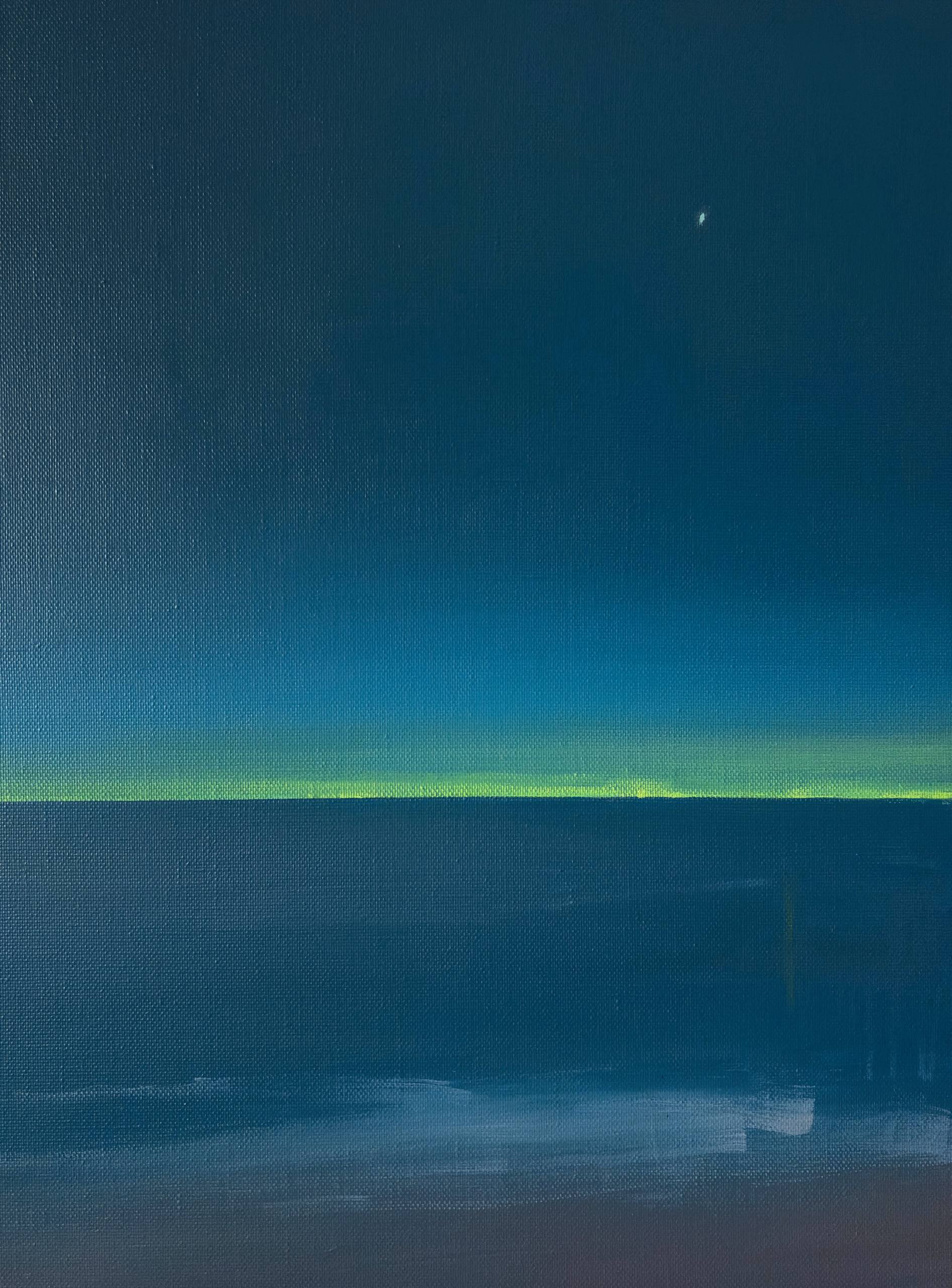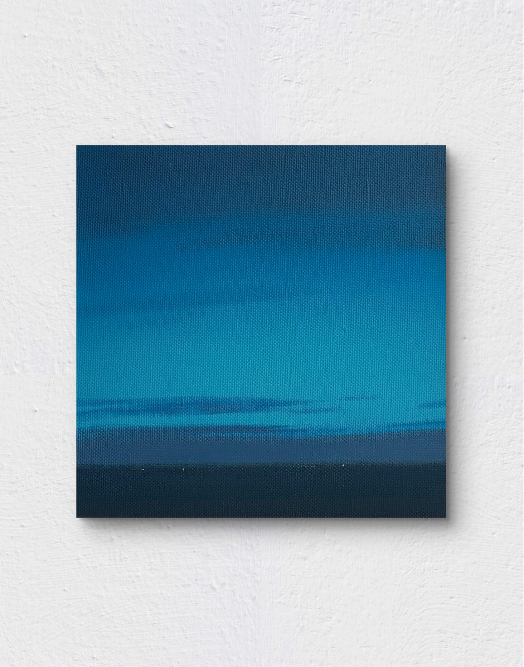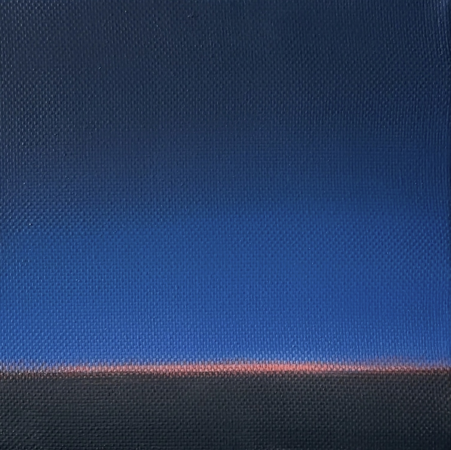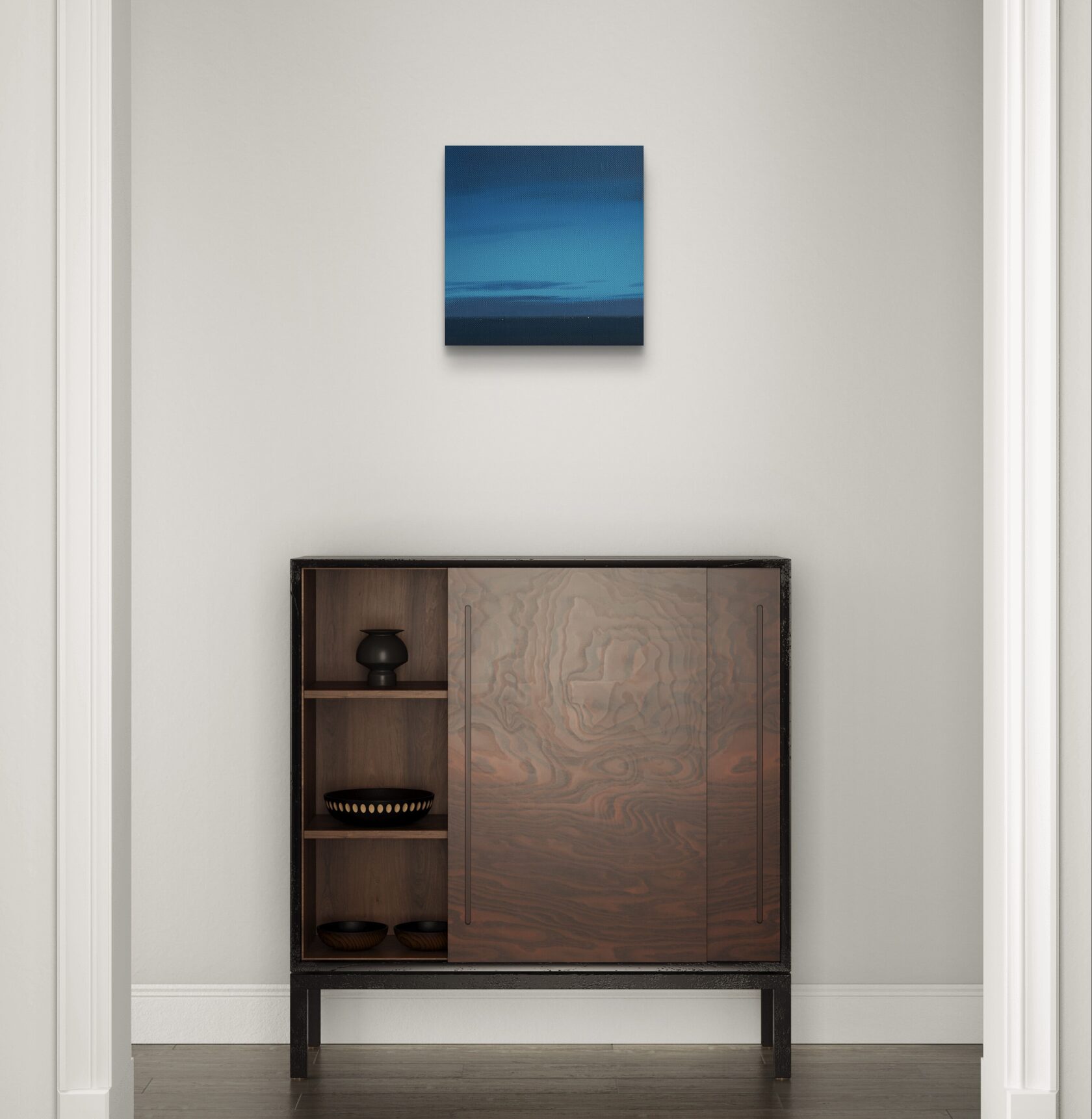 Картина передает ощущение тишины и бескрайности ночного неба. Глубокий синий цвет плавно растворяется в сгущающихся сумерках, а тонкая полоска тёплого заката у горизонта добавляет композиции уравновешенность и лёгкость. Минималистичный пейзаж строится на тонких цветовых нюансах, создавая эффект глубины и спокойствия.