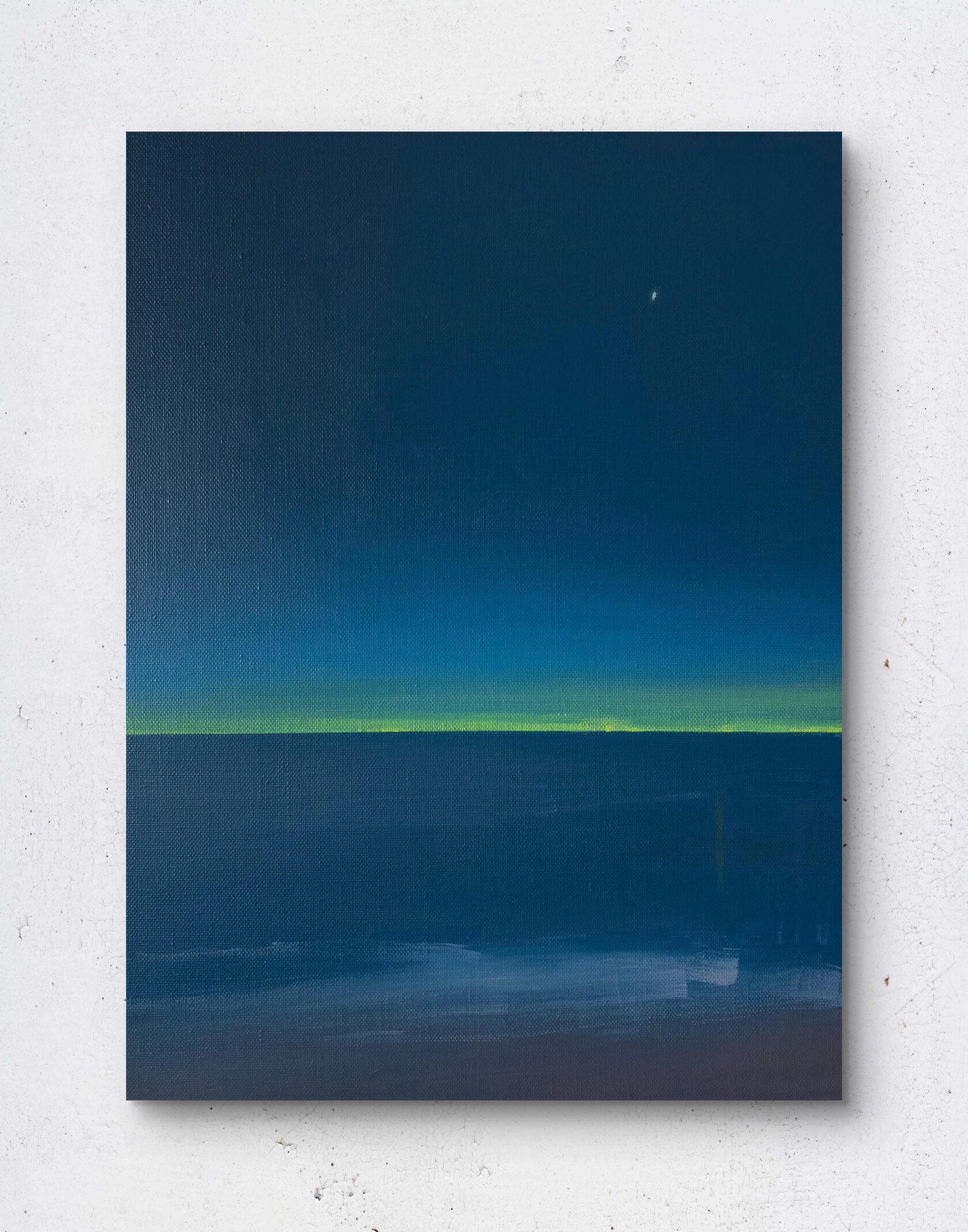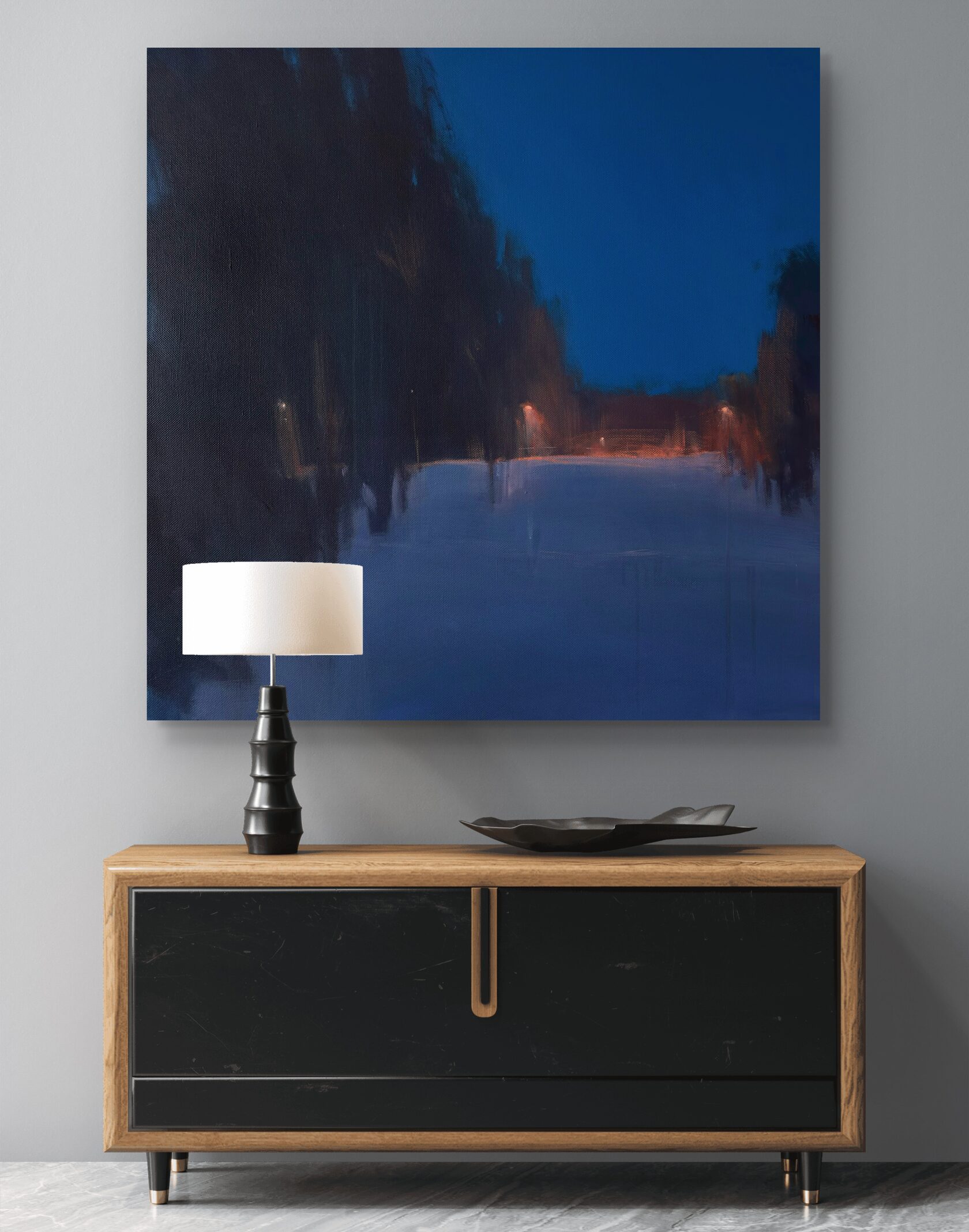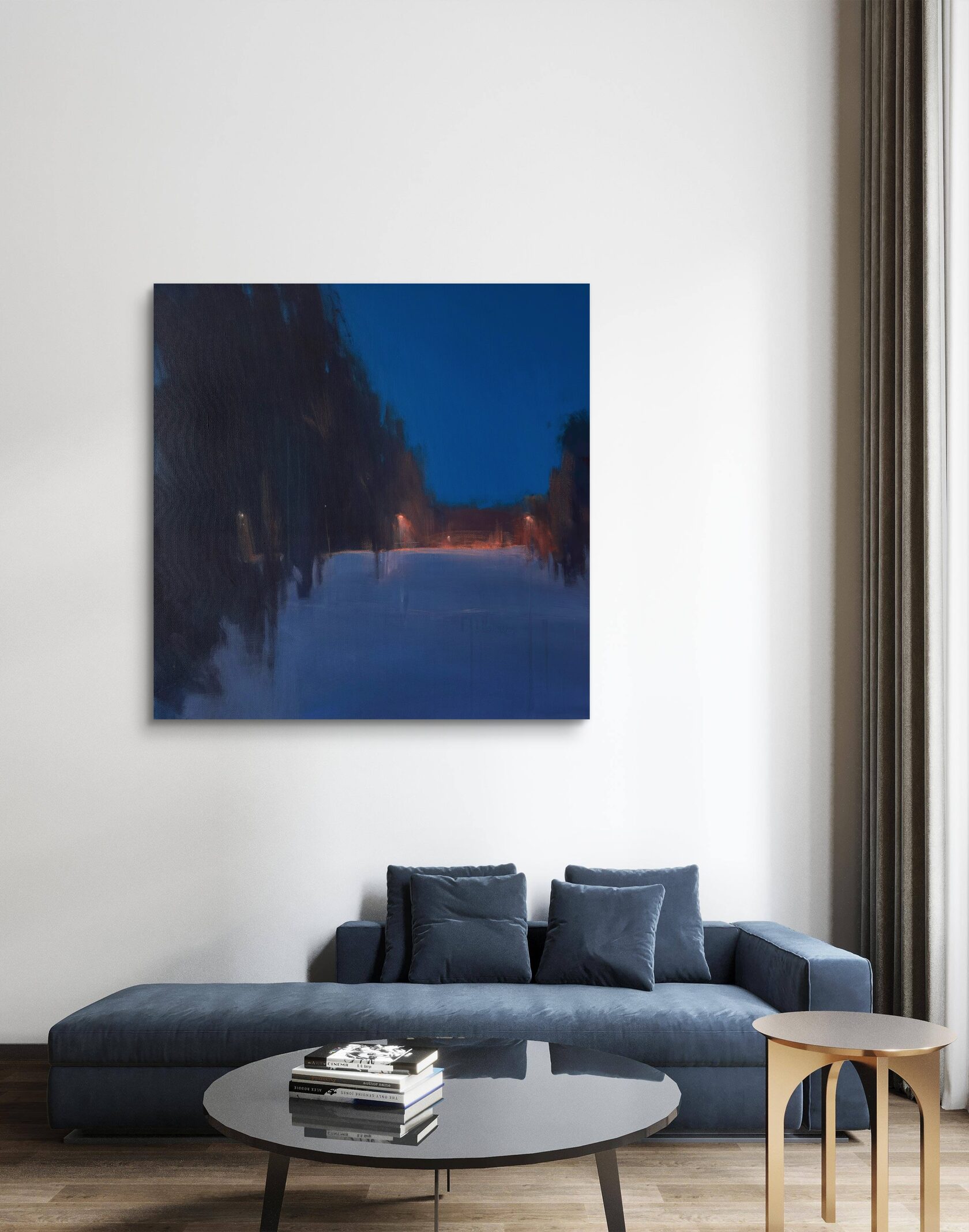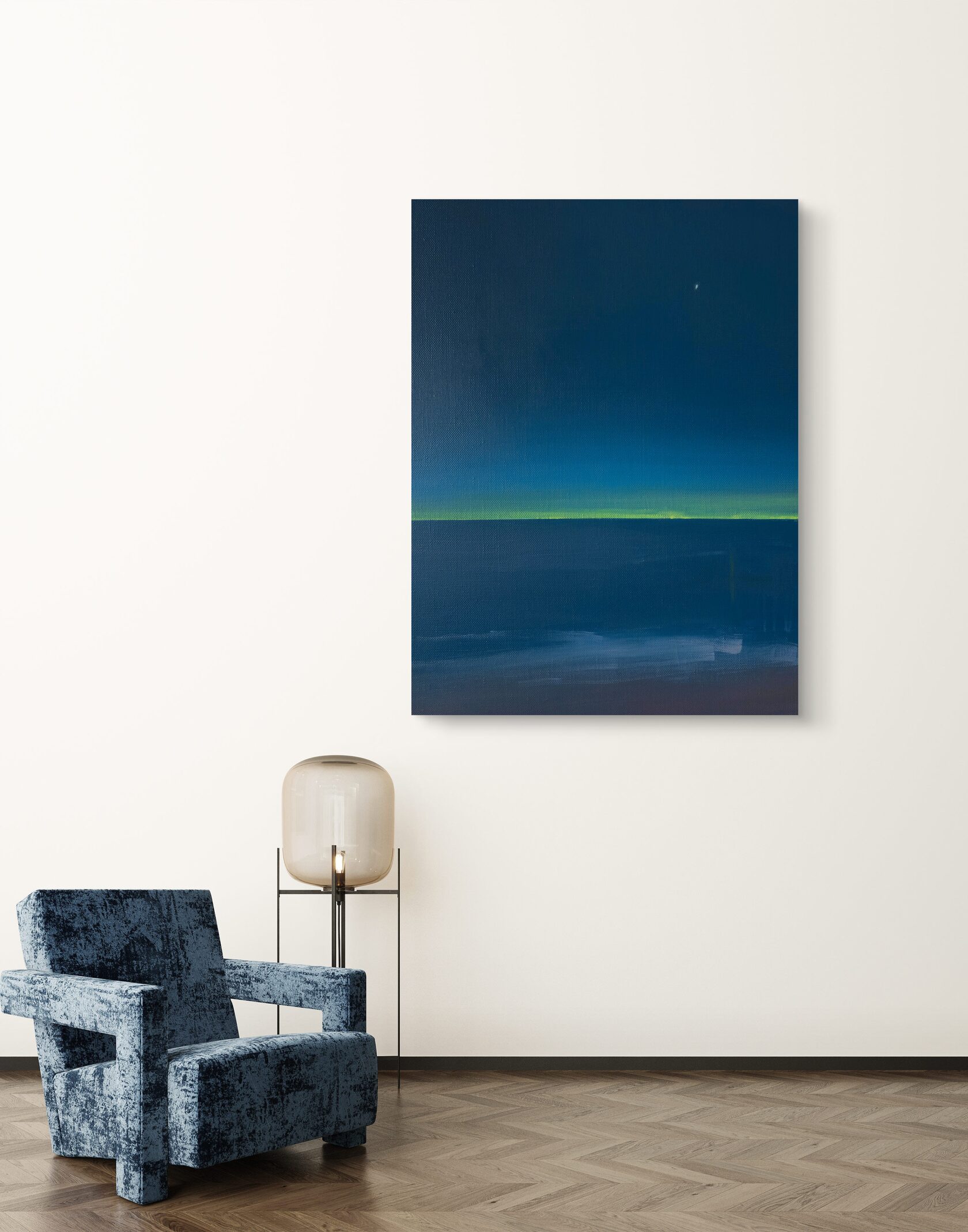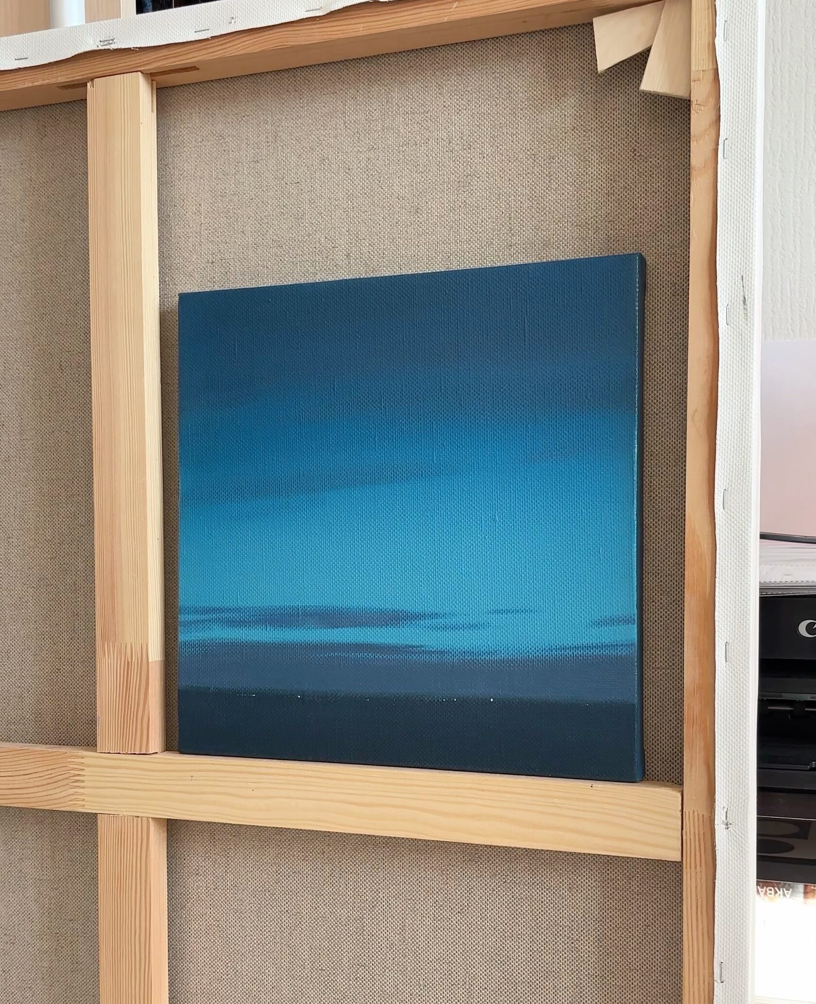 Картина передает ощущение тишины и бескрайности ночного неба. Глубокий синий цвет плавно растворяется в сгущающихся сумерках, а тонкая полоска тёплого заката у горизонта добавляет композиции уравновешенность и лёгкость. Минималистичный пейзаж строится на тонких цветовых нюансах, создавая эффект глубины и спокойствия.