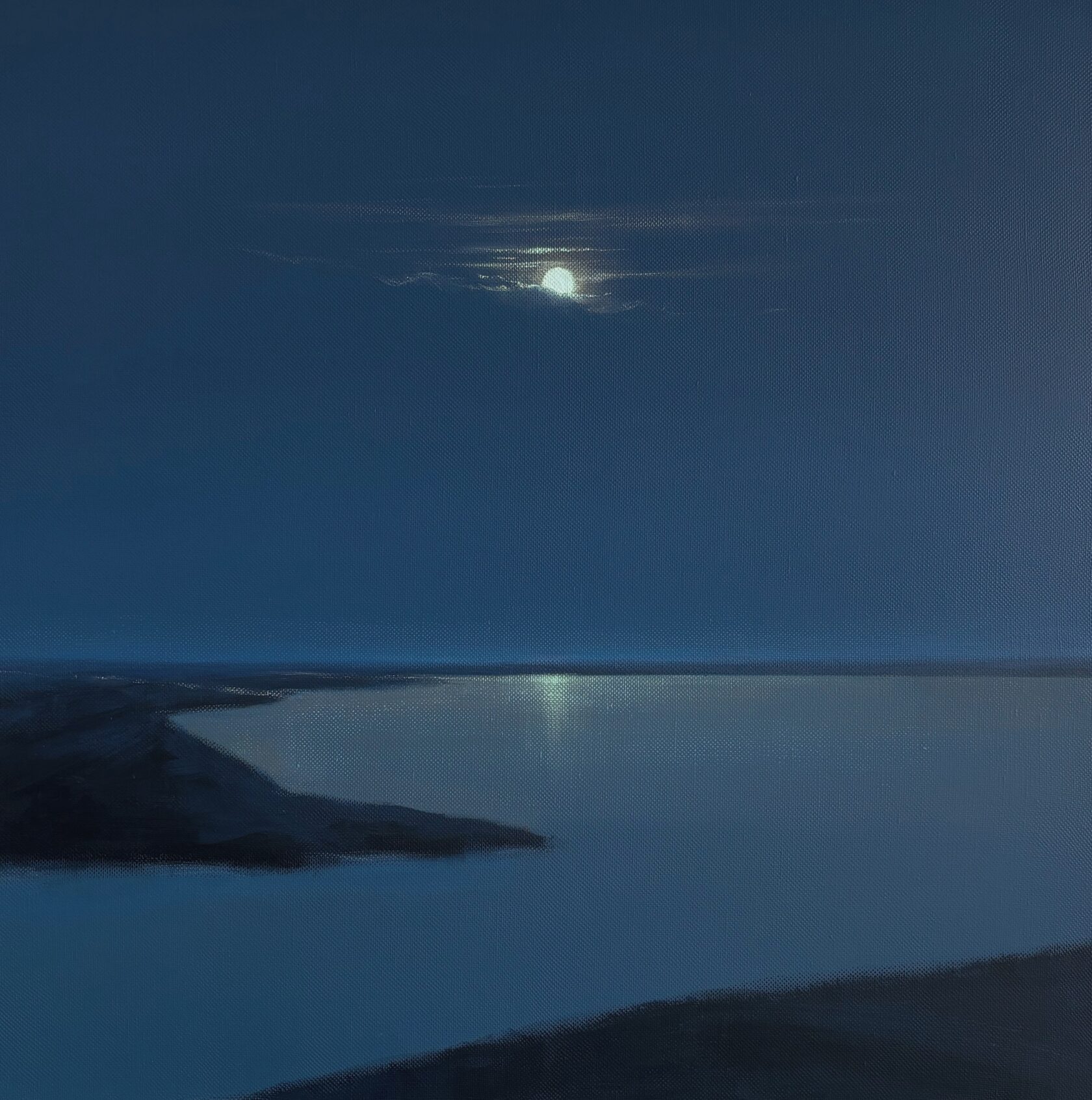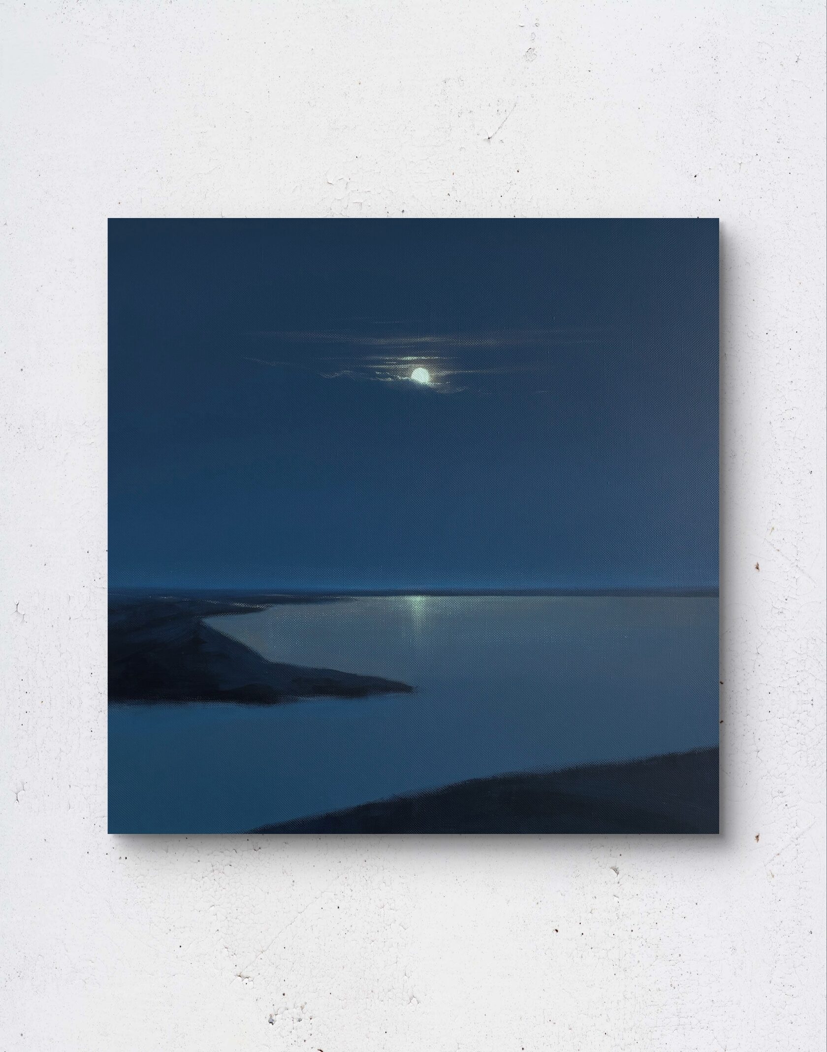 Более тёмная и камерная версия работы «Тихая ночь», эта картина словно погружает зрителя в ещё большую глубину ночного спокойствия. Лунный свет едва пробивается сквозь облака, отражаясь на глади воды и создавая почти медитативную тишину.
