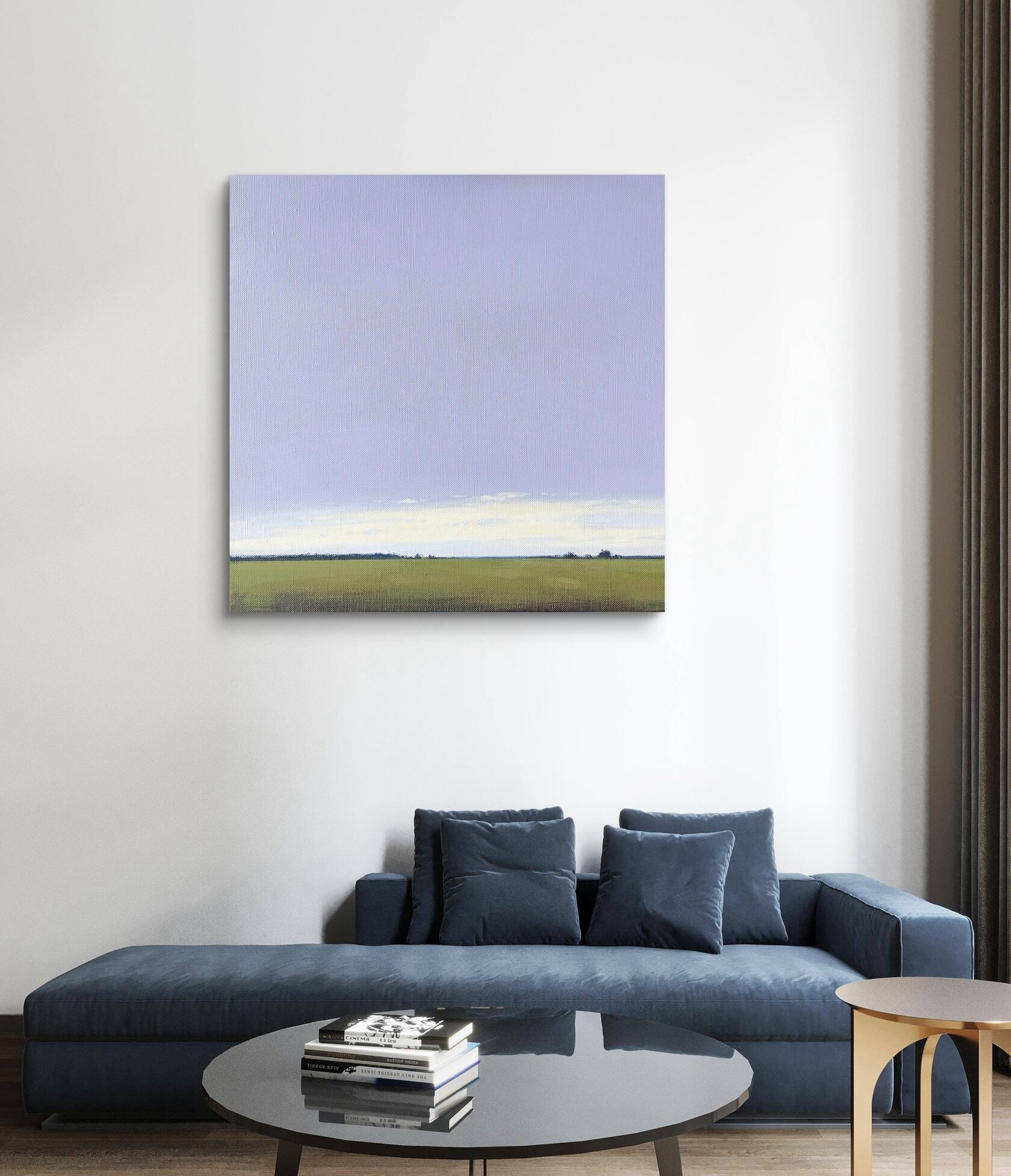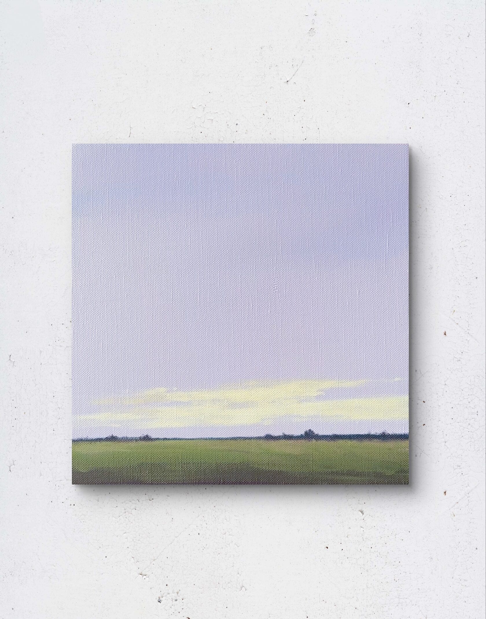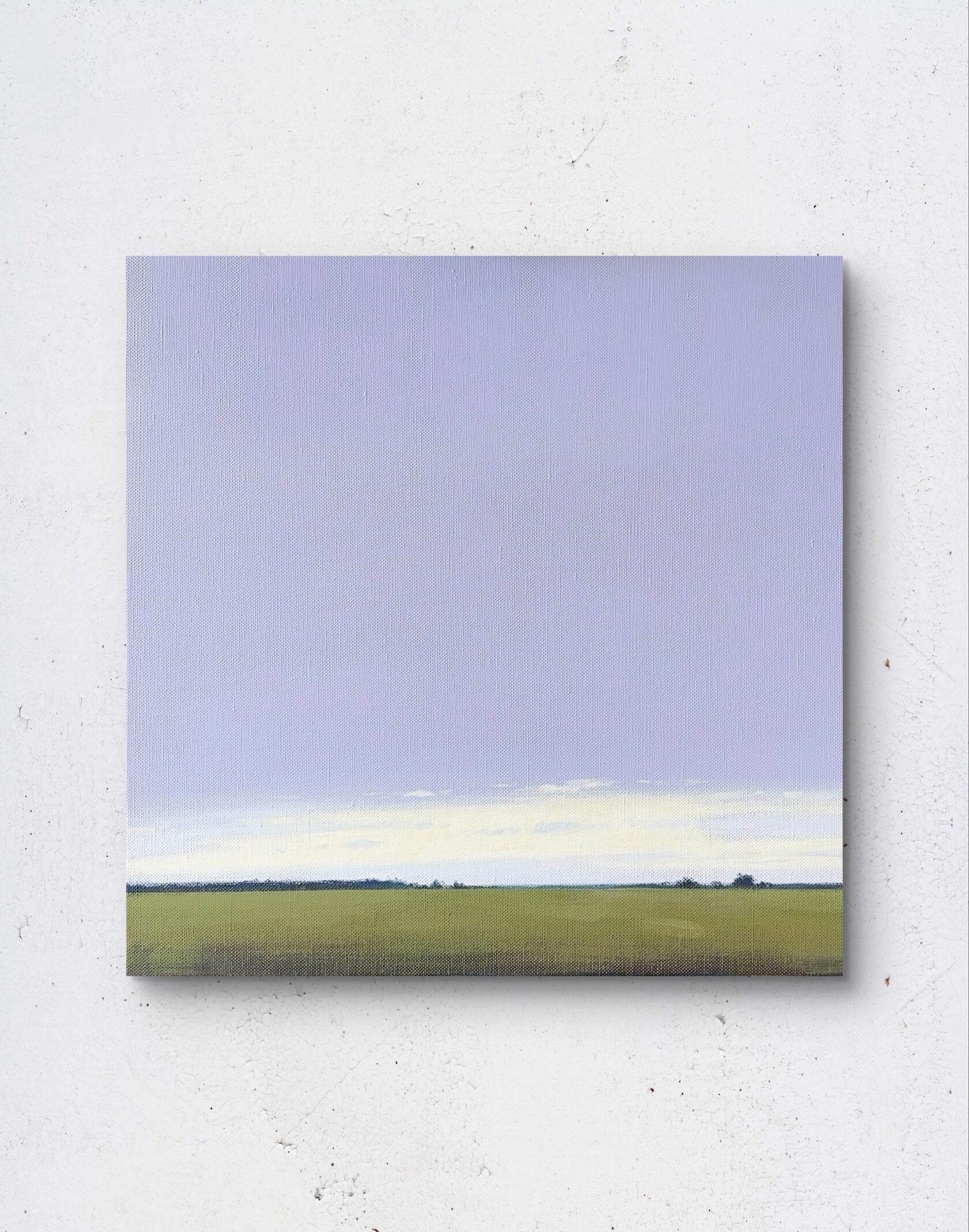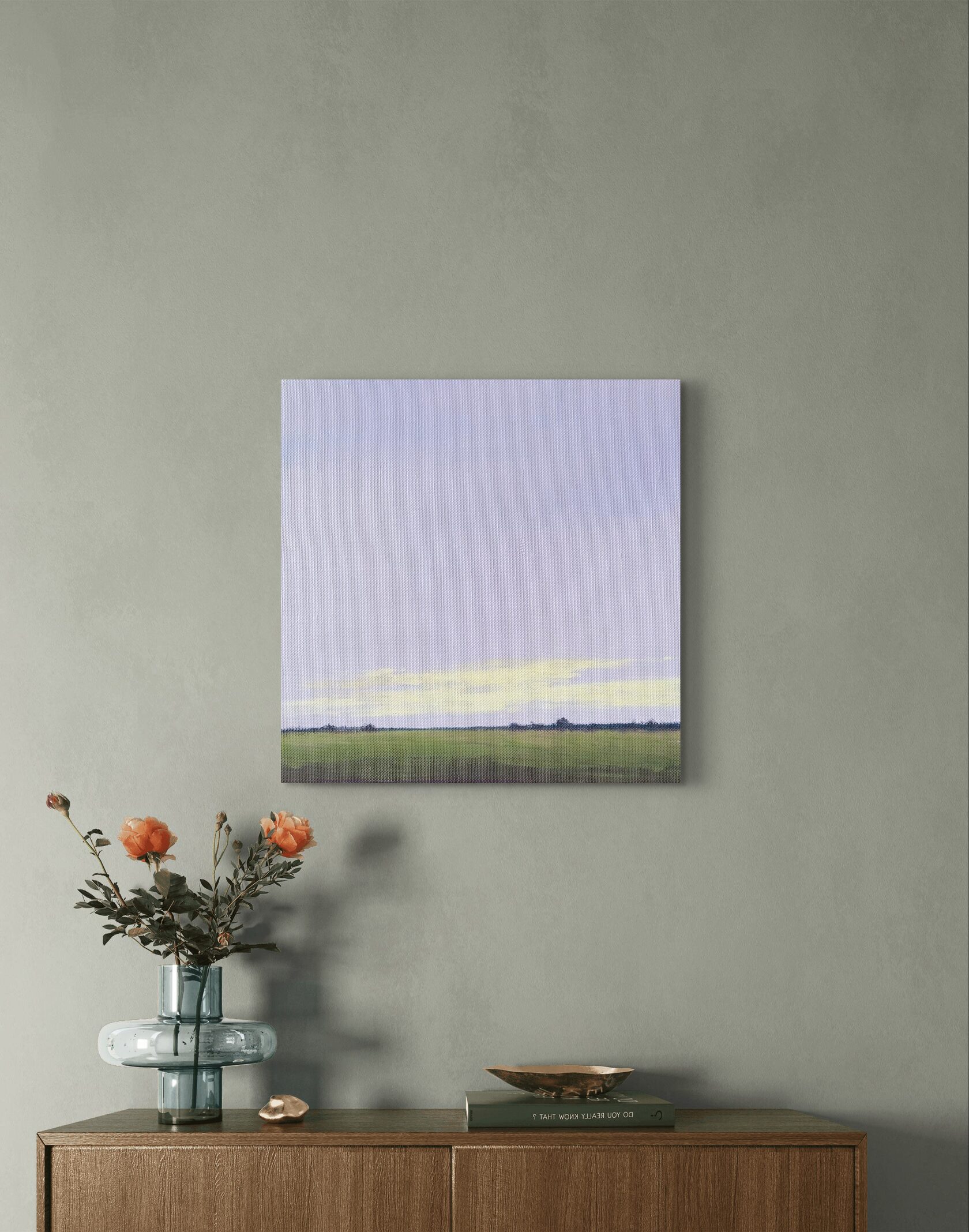 Картина из серии «Горизонты» передаёт ощущение спокойствия и простора. Тонкая полоска света у линии горизонта словно раздвигает границы привычного мира — между небом и землёй рождается мягкое, едва уловимое сияние. Лавандовое небо и зеленое поле соединяются в почти медитативном ритме, приглашая зрителя остановиться и просто быть.