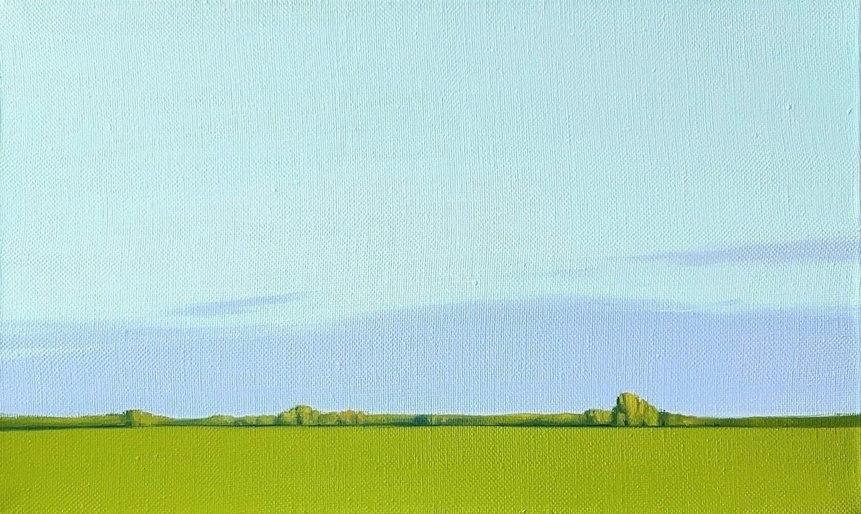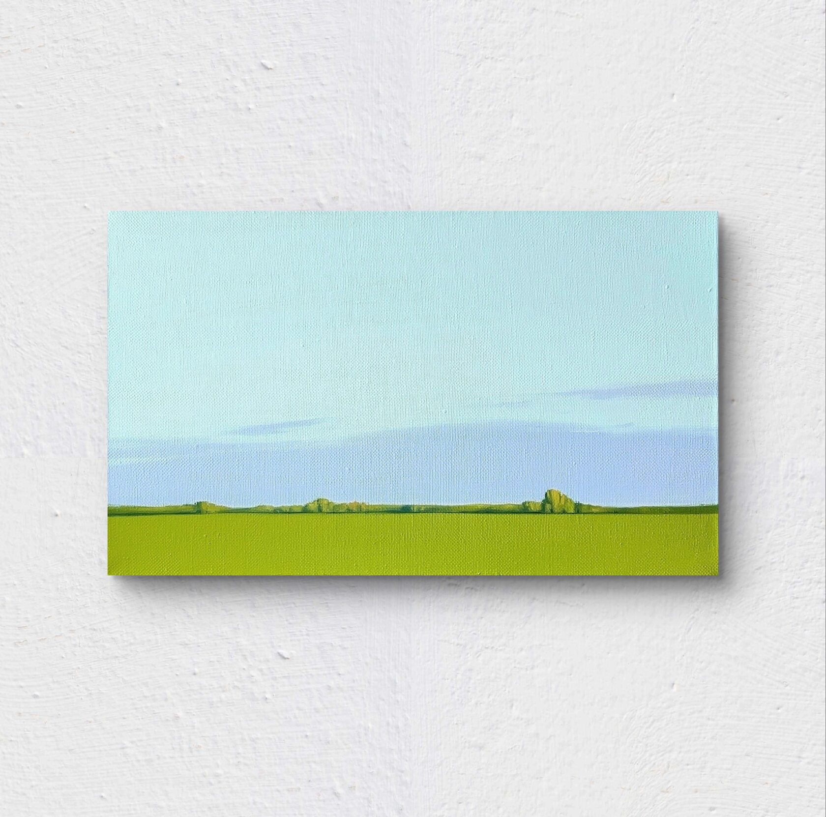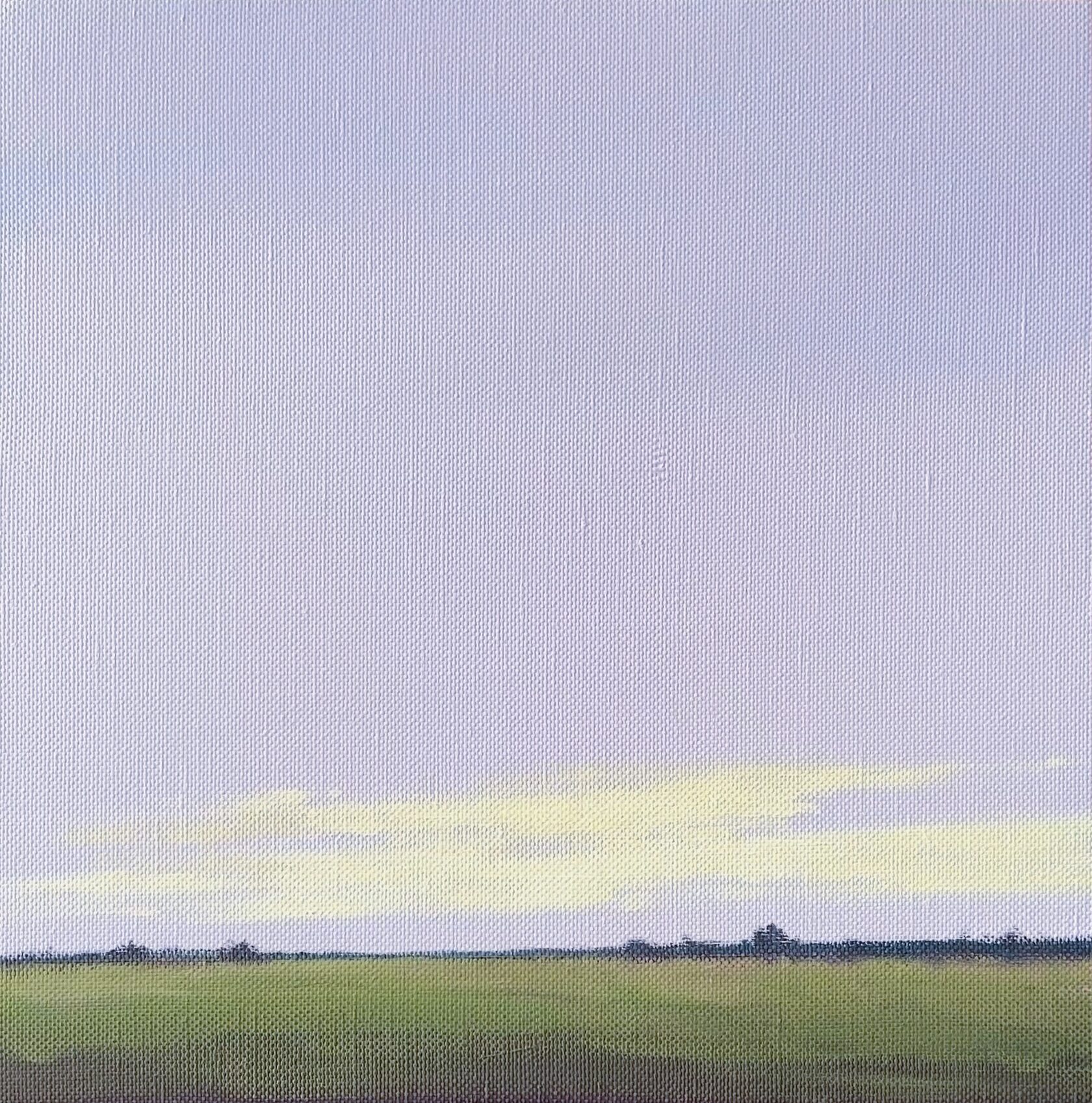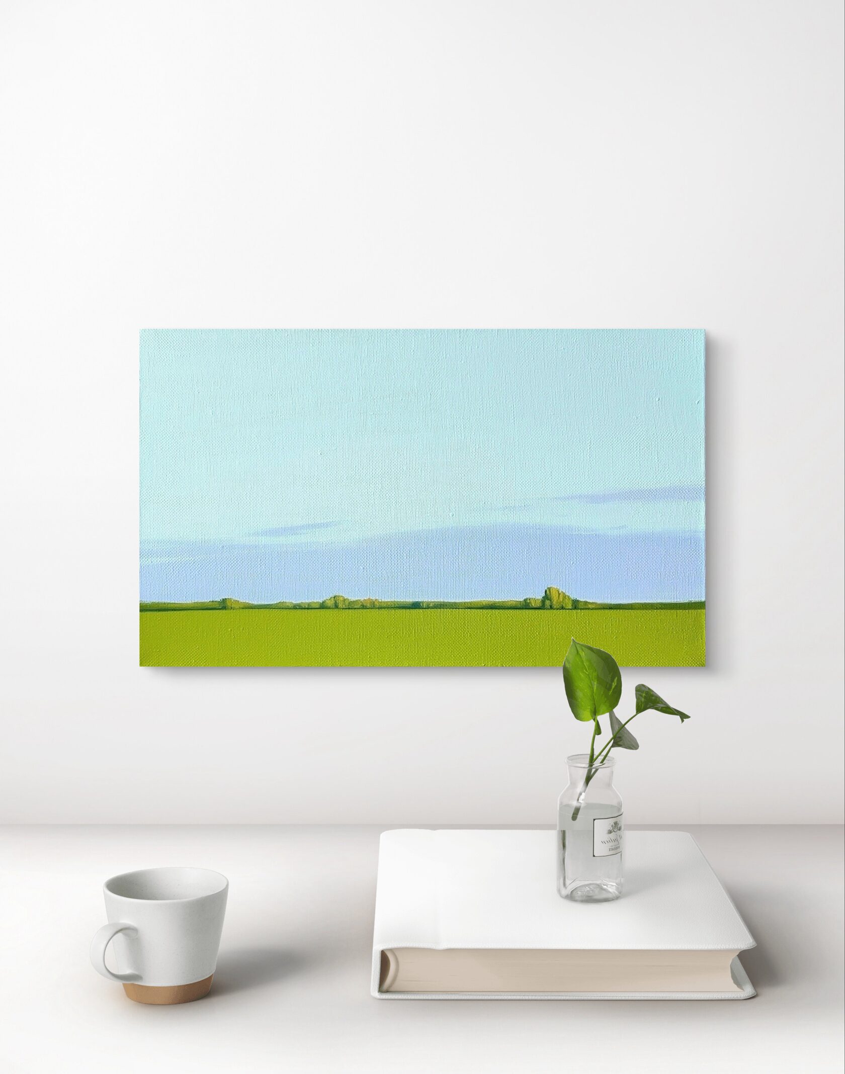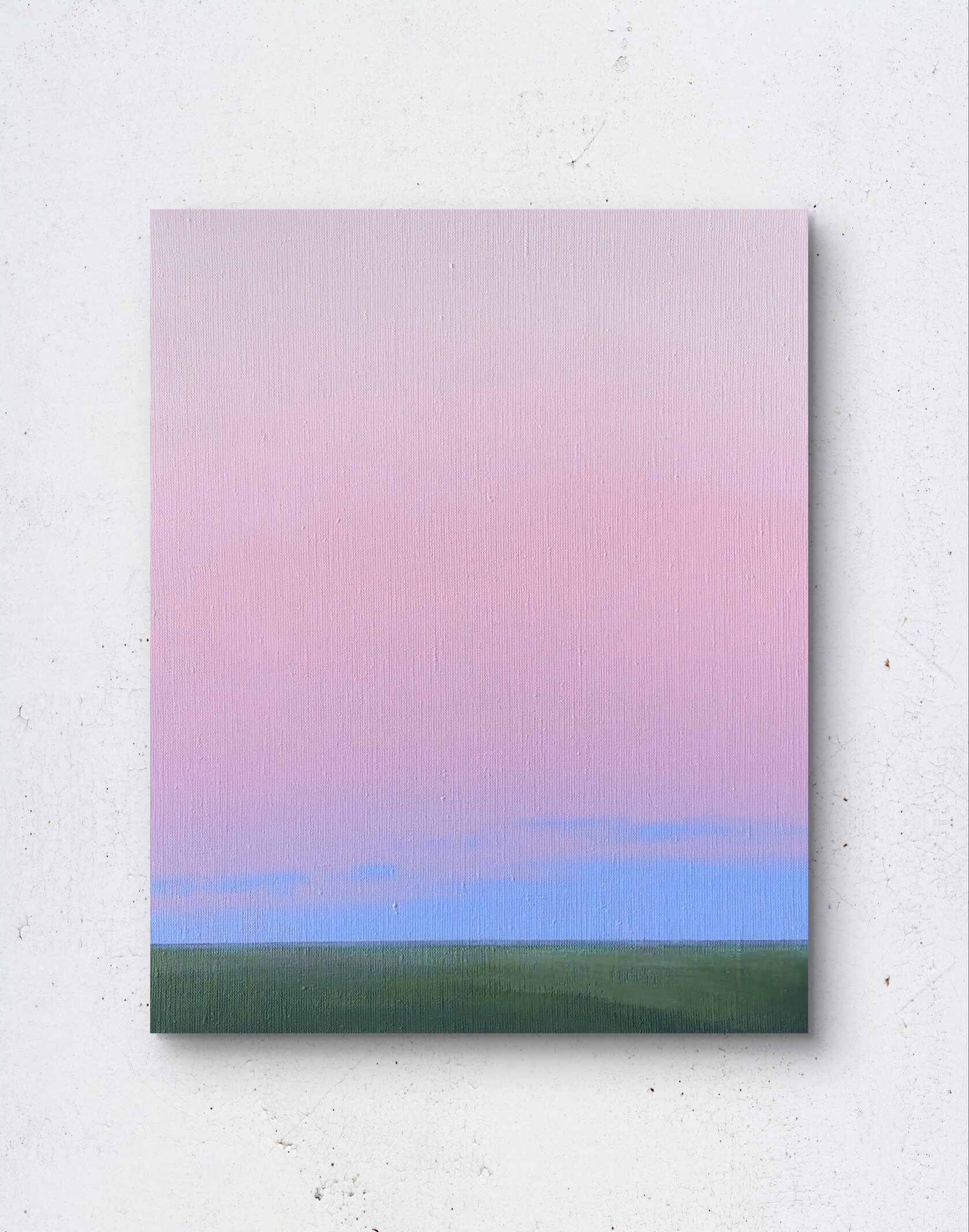 Картина из серии «Горизонты» передаёт ощущение спокойствия и простора. Тонкая полоска света у линии горизонта словно раздвигает границы привычного мира — между небом и землёй рождается мягкое, едва уловимое сияние. Лавандовое небо и зеленое поле соединяются в почти медитативном ритме, приглашая зрителя остановиться и просто быть.