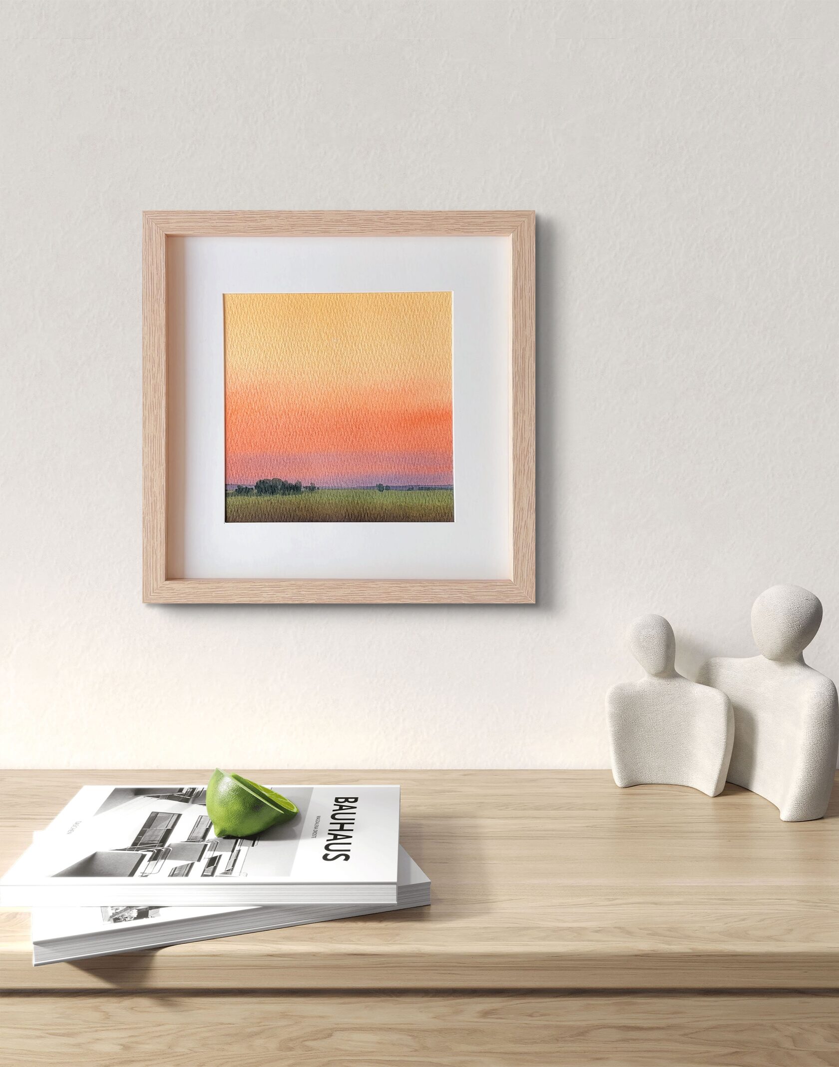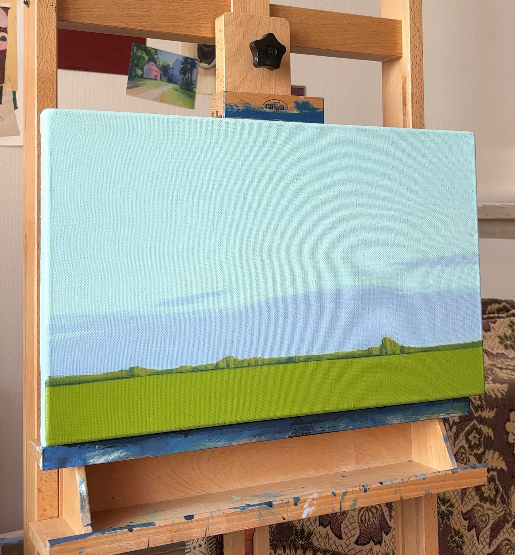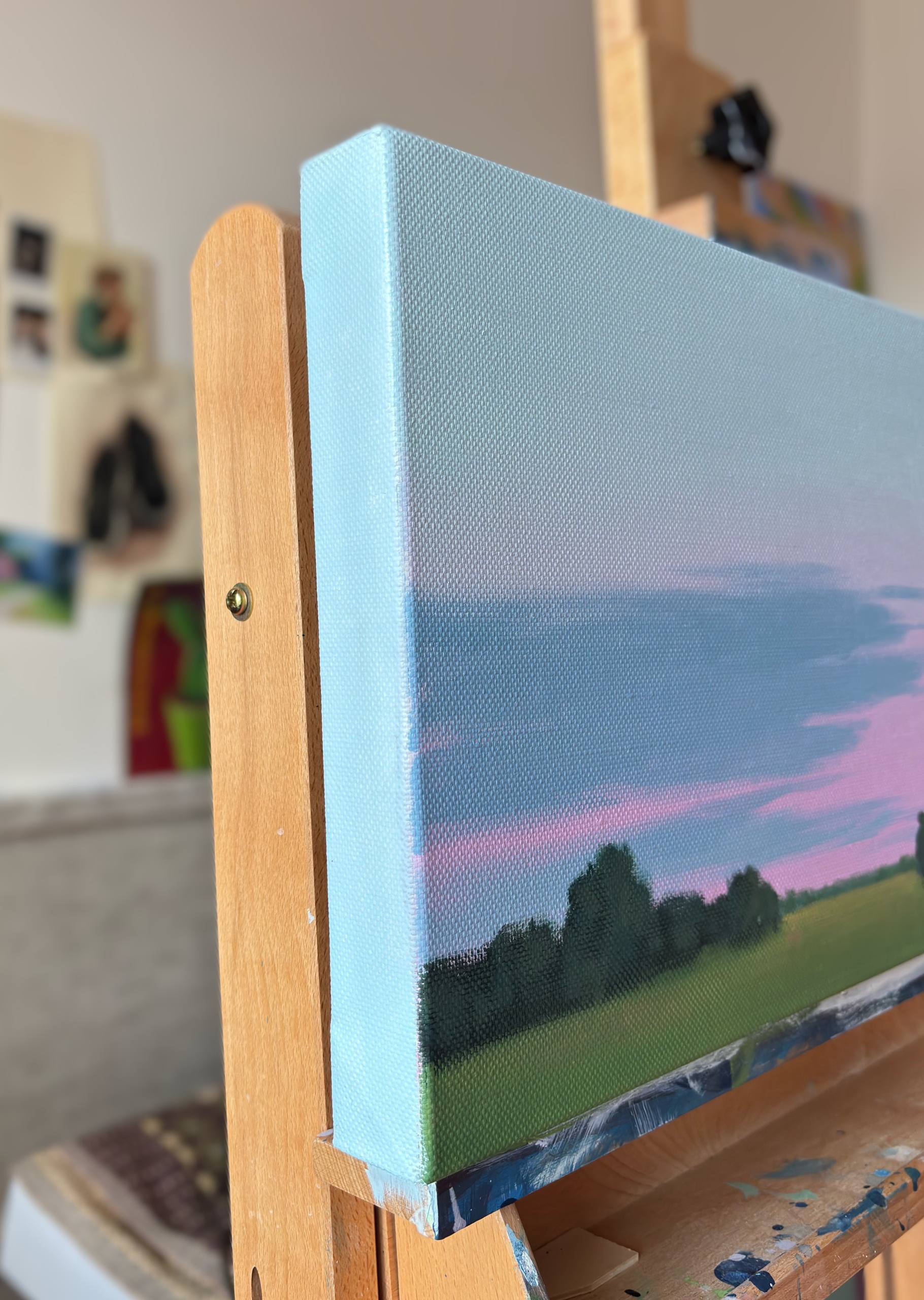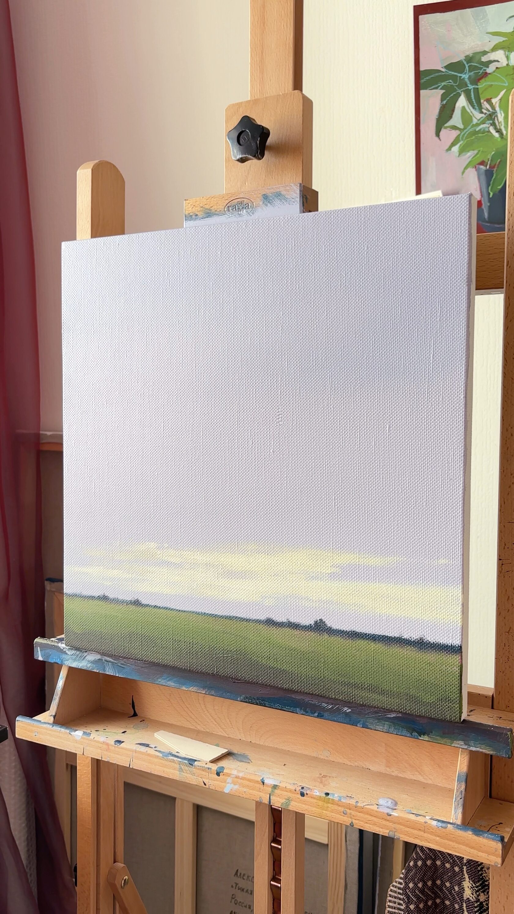 Картина из серии «Горизонты» передаёт ощущение спокойствия и простора. Тонкая полоска света у линии горизонта словно раздвигает границы привычного мира — между небом и землёй рождается мягкое, едва уловимое сияние. Лавандовое небо и зеленое поле соединяются в почти медитативном ритме, приглашая зрителя остановиться и просто быть.