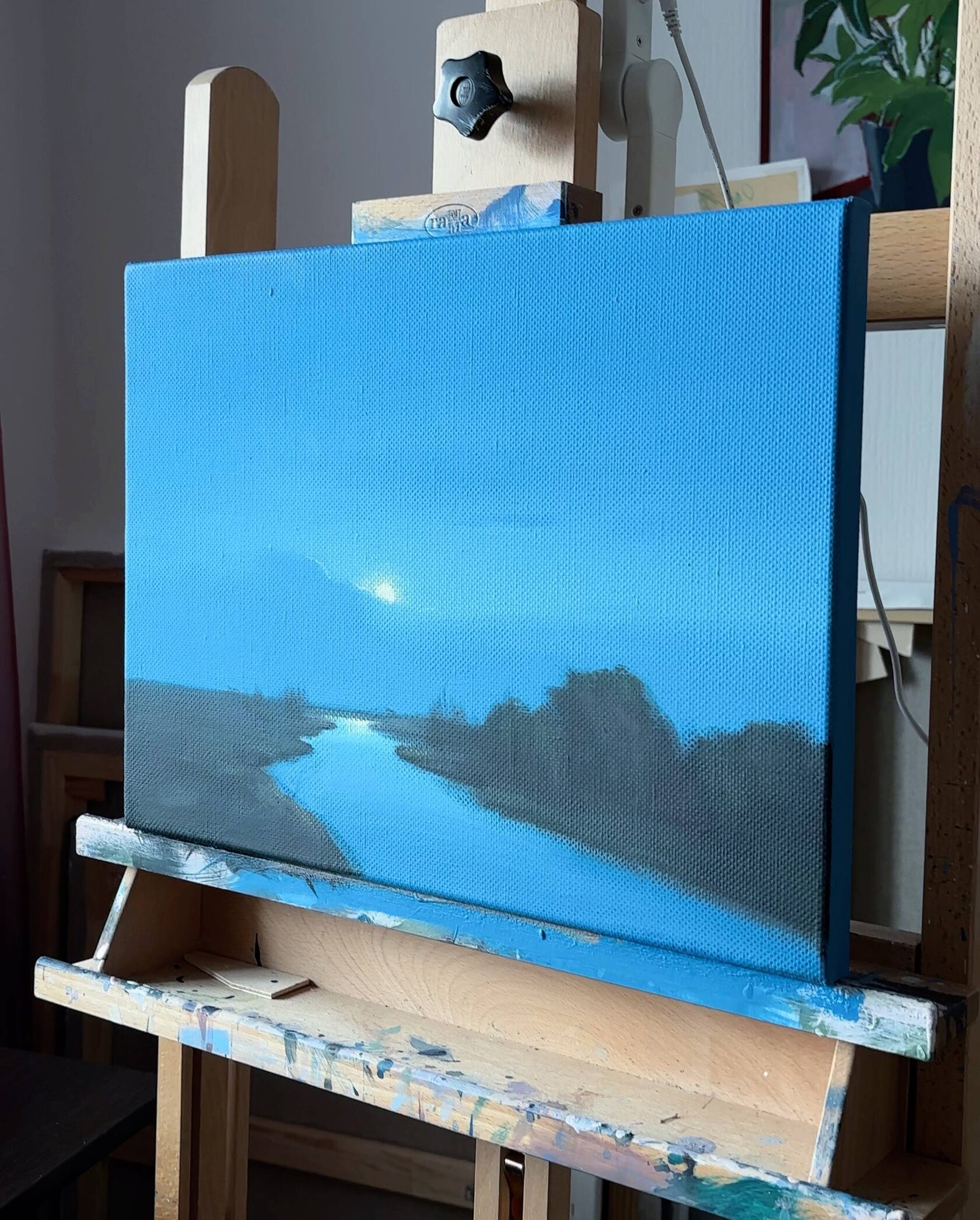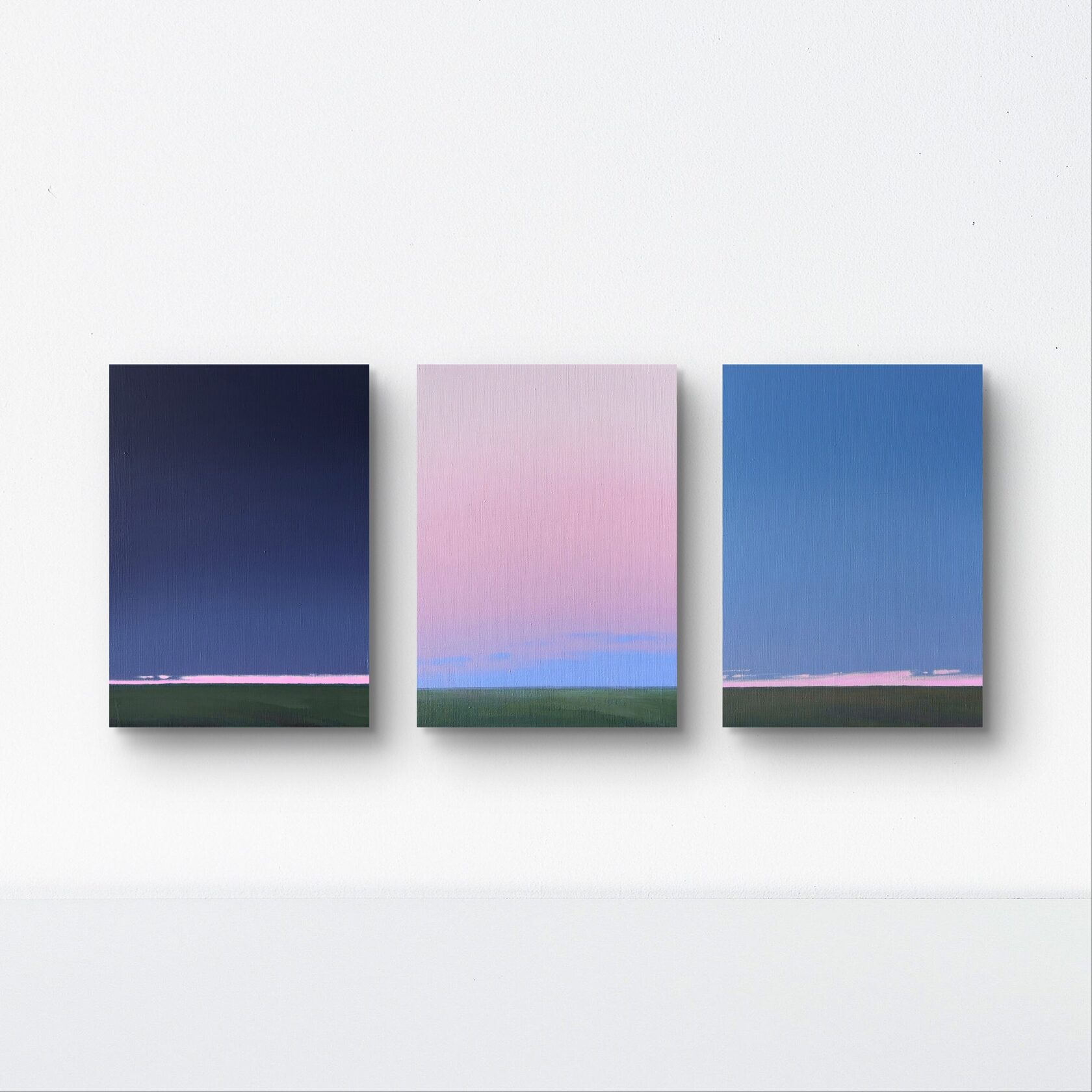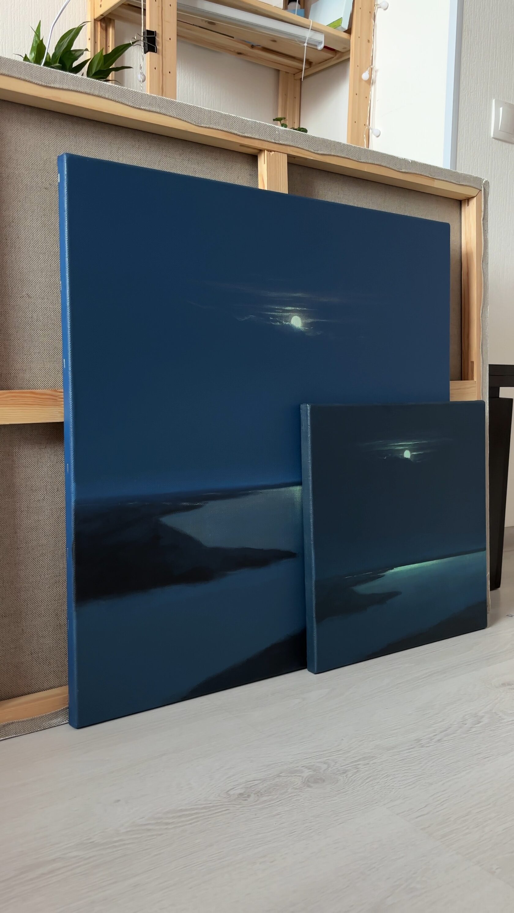 Картины выполнены на заказ по мотивам серии. Мне нравится, что в этих трёх полотнах получилось собрать разные состояния одного и того же пейзажа: от ночной глубины до сияния прозрачного утреннего неба.
