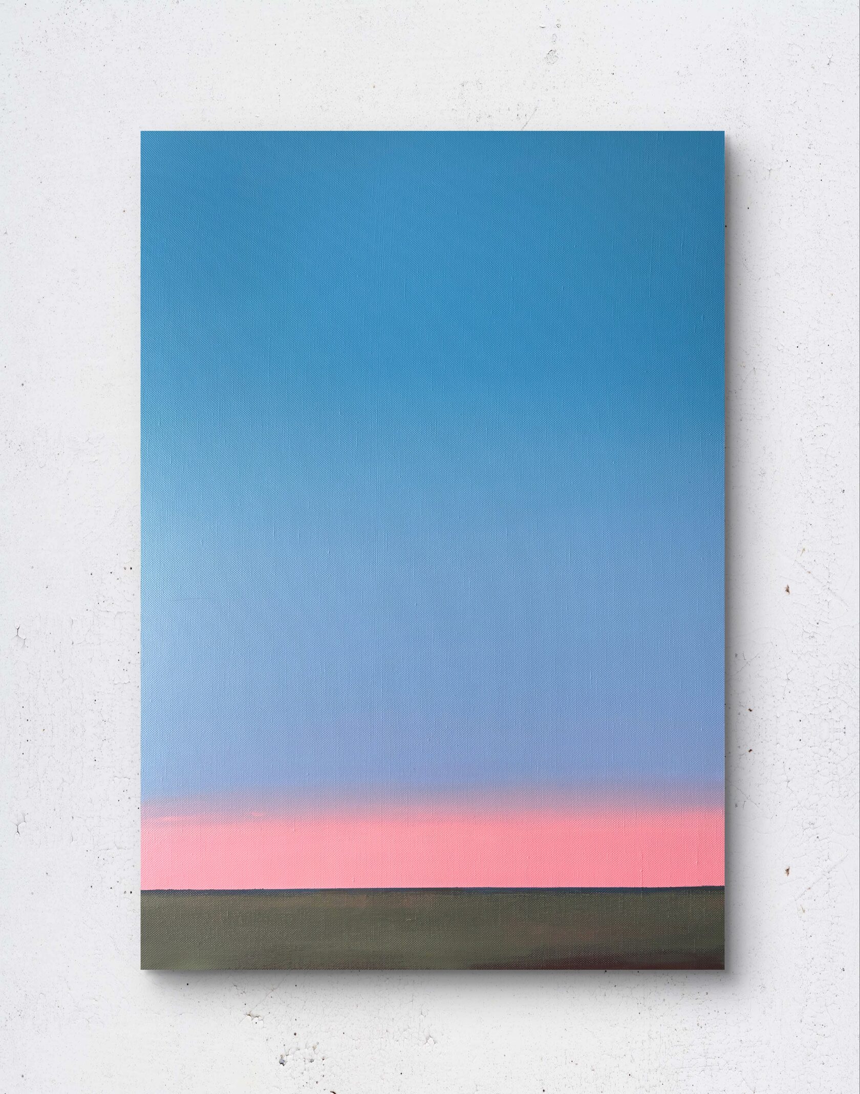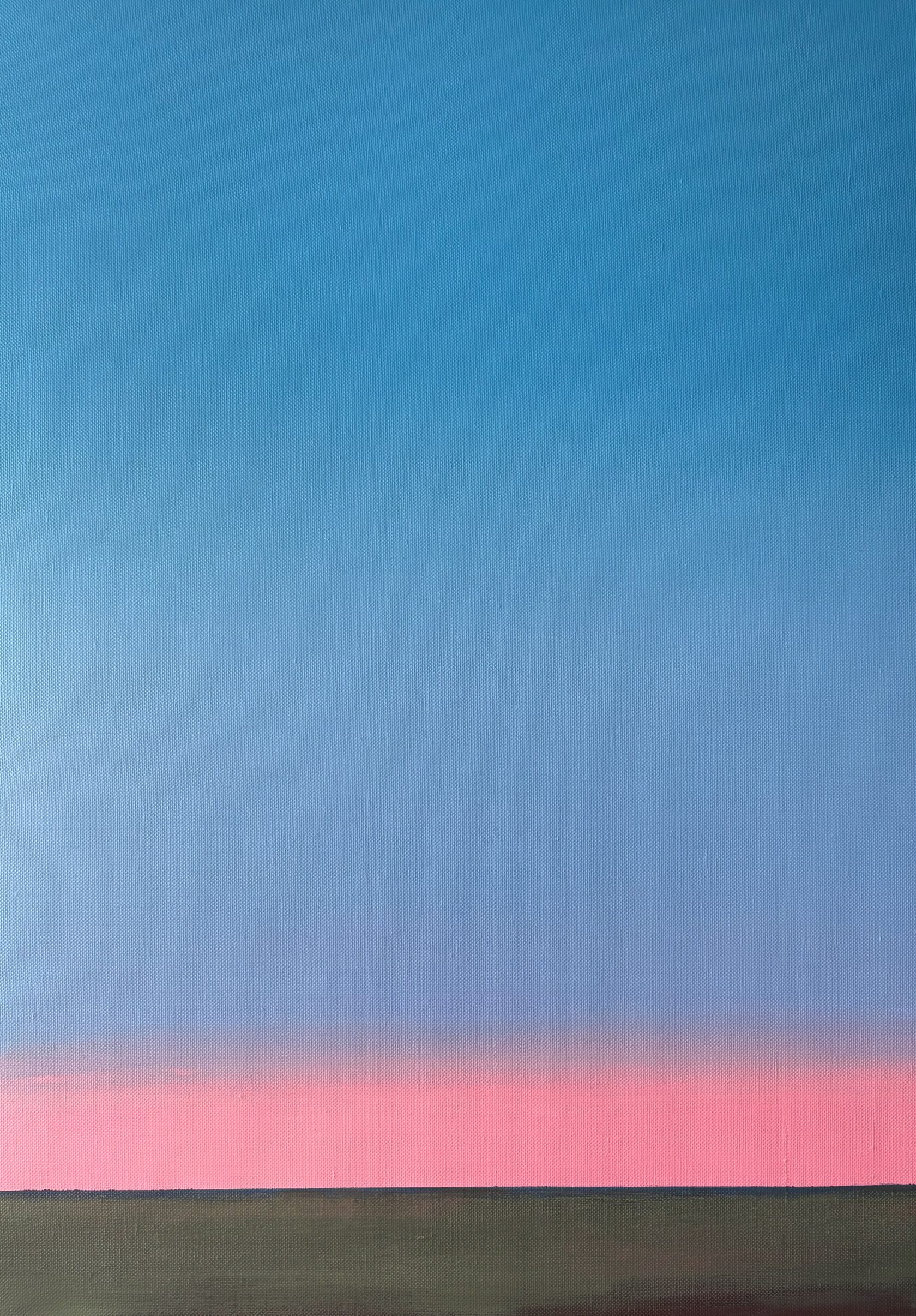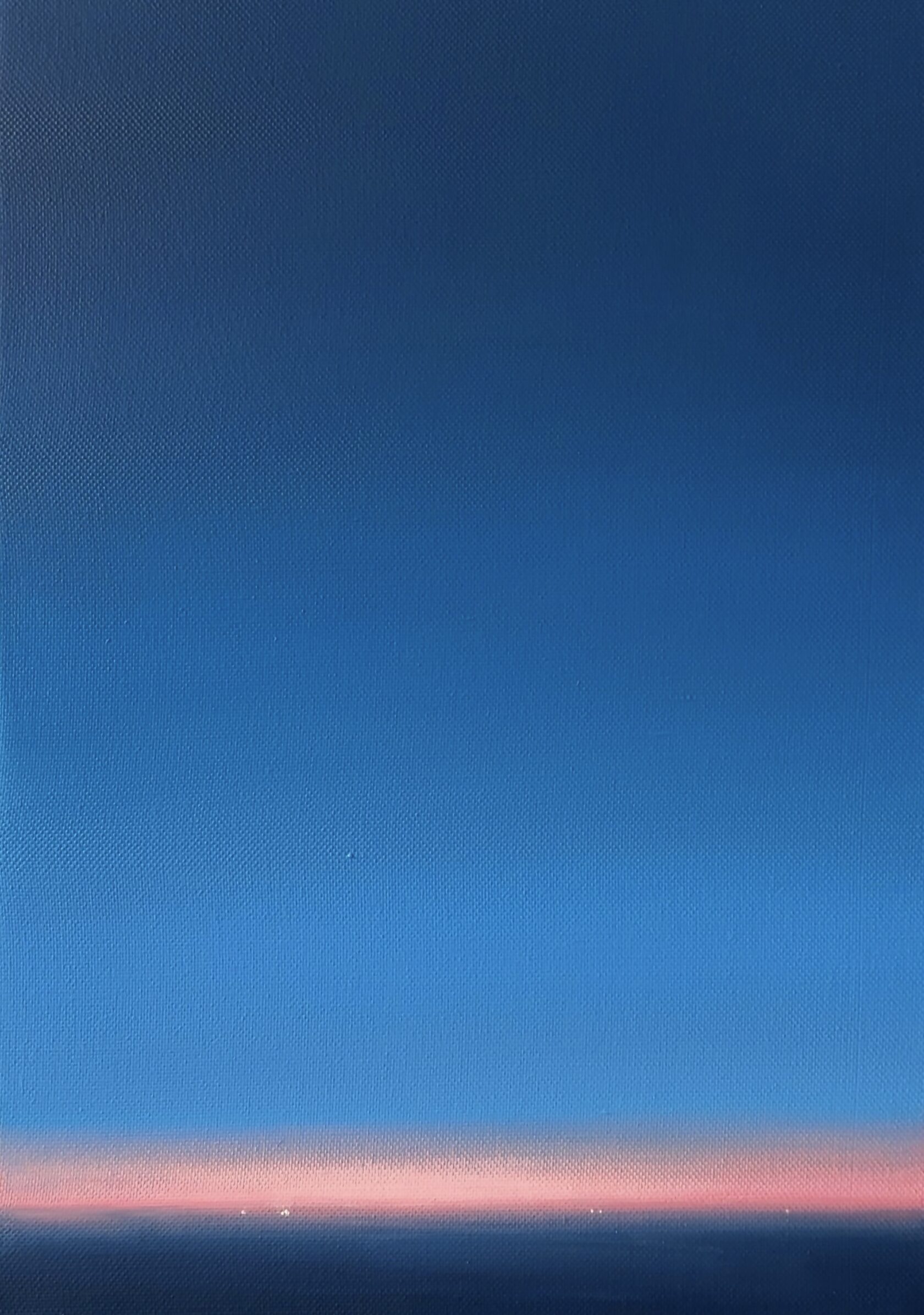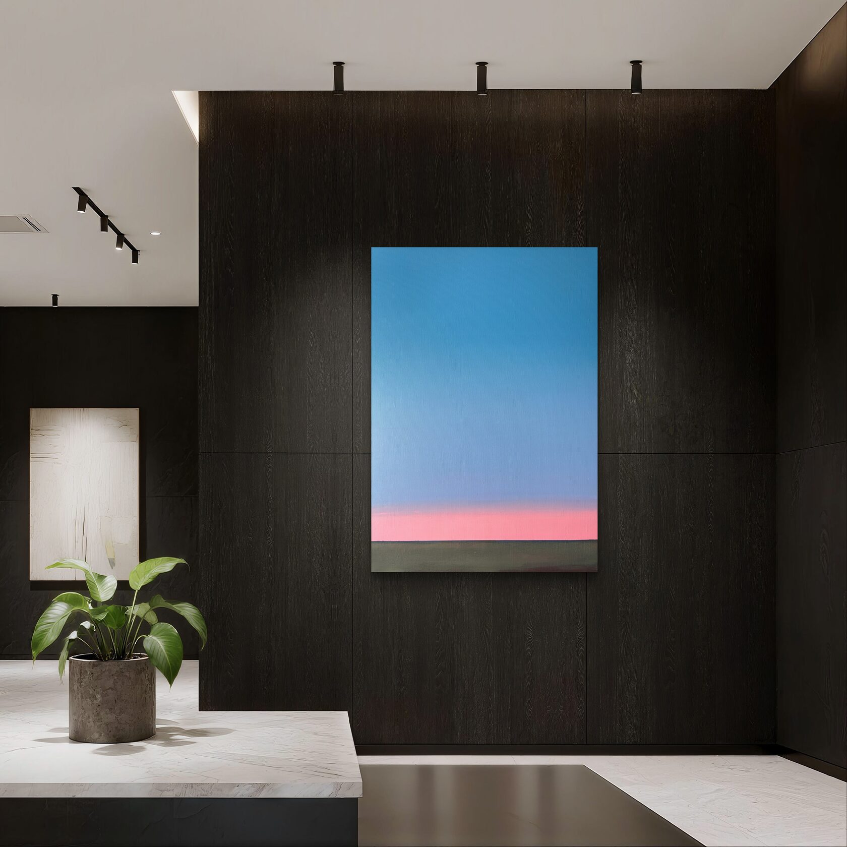 Работа передаёт состояние вечера после заката: небо постепенно уходит в холодную синеву, а у горизонта ещё держится мягкое розовое послесвечение. Минималистичный пейзаж, где чистота цвета и простая линия становятся образом тишины и покоя.