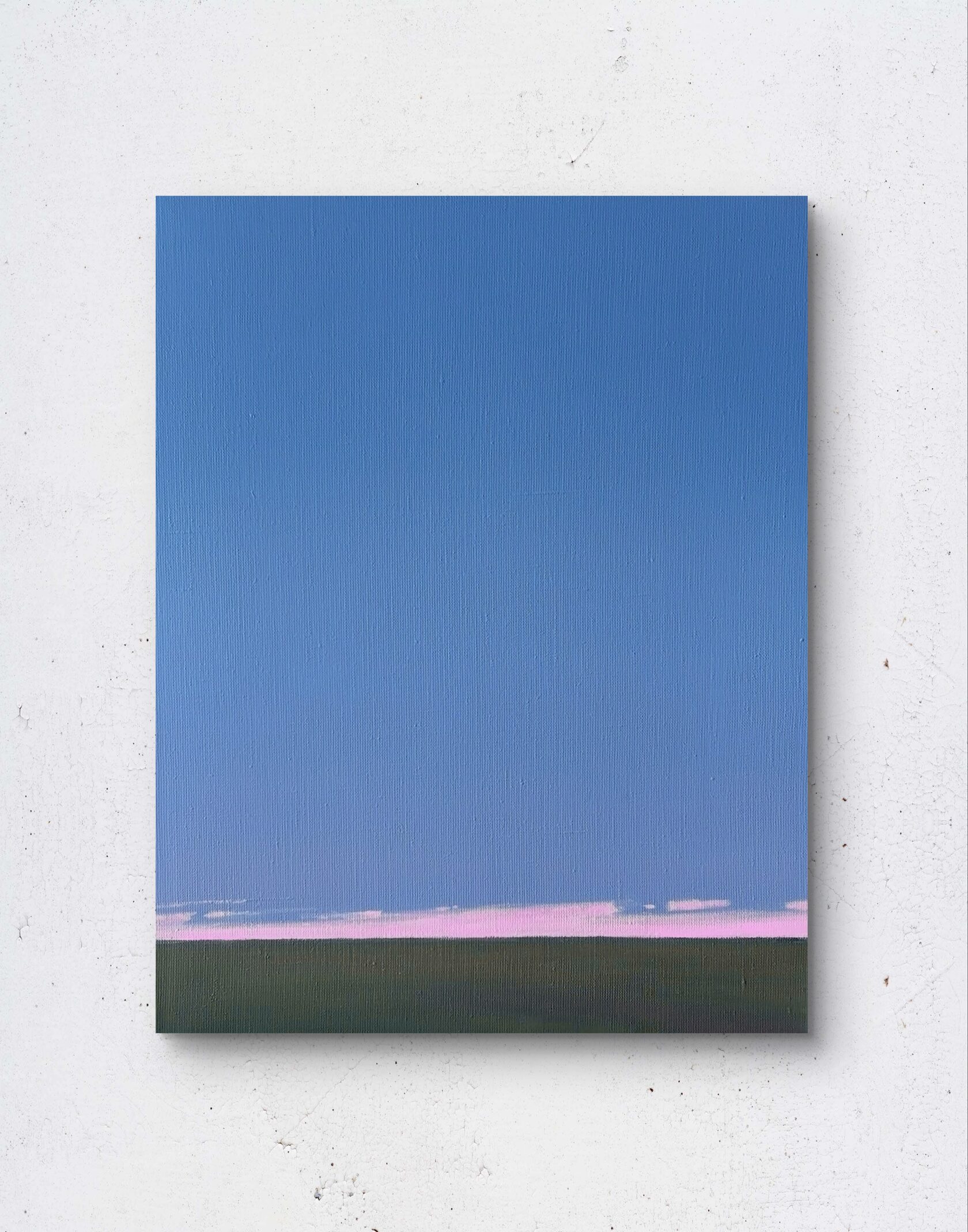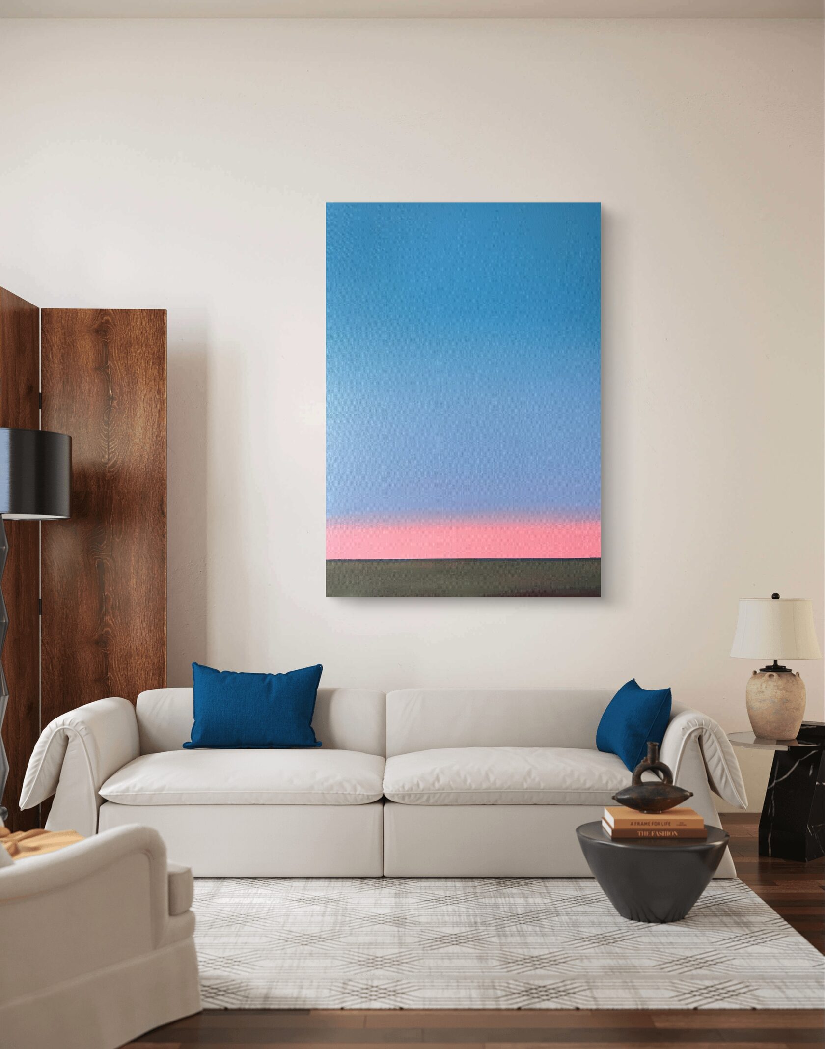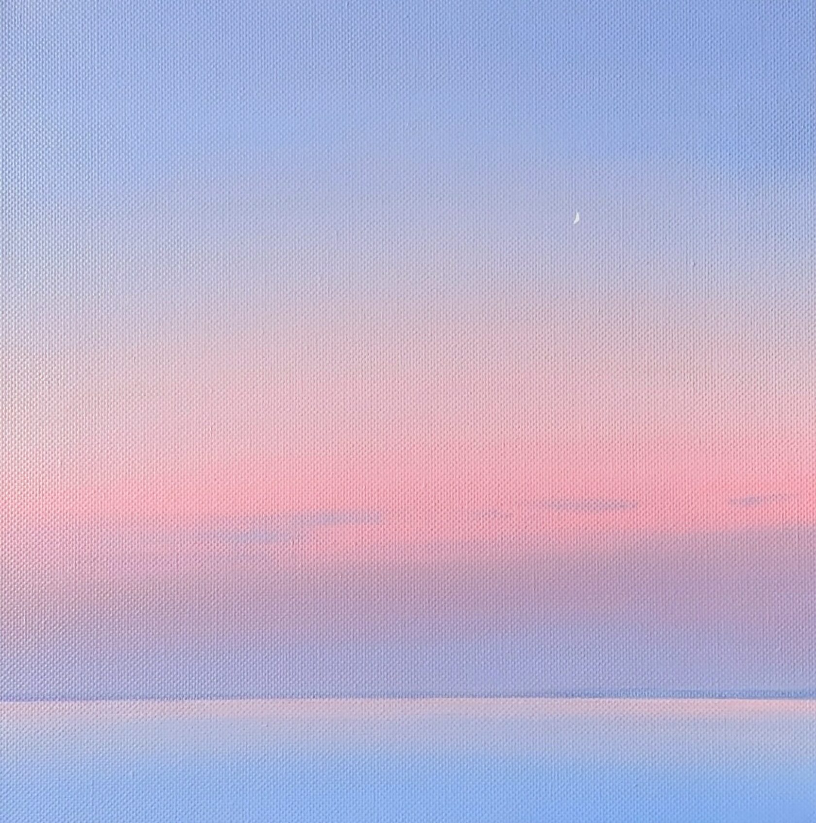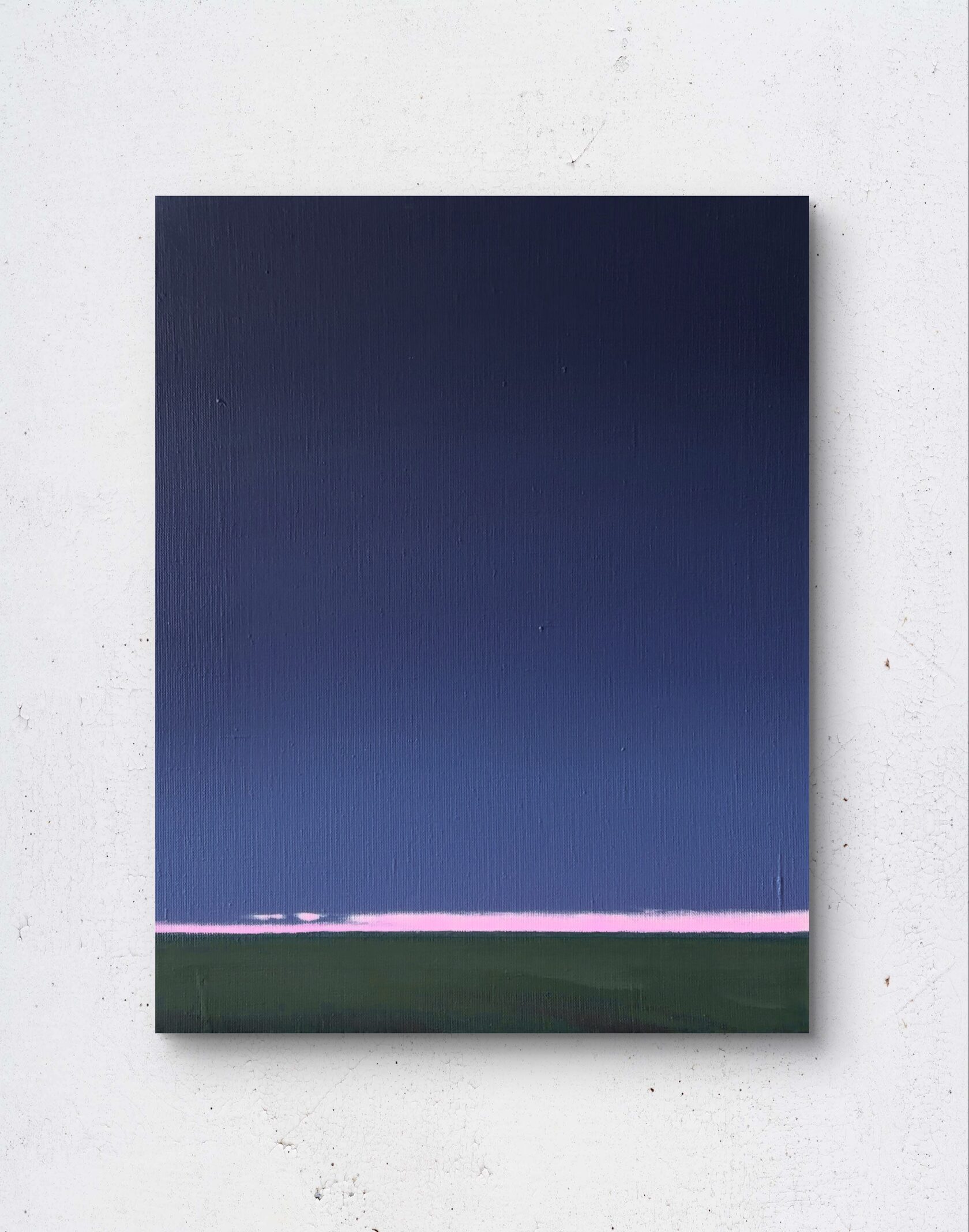 Работа передаёт состояние вечера после заката: небо постепенно уходит в холодную синеву, а у горизонта ещё держится мягкое розовое послесвечение. Минималистичный пейзаж, где чистота цвета и простая линия становятся образом тишины и покоя.