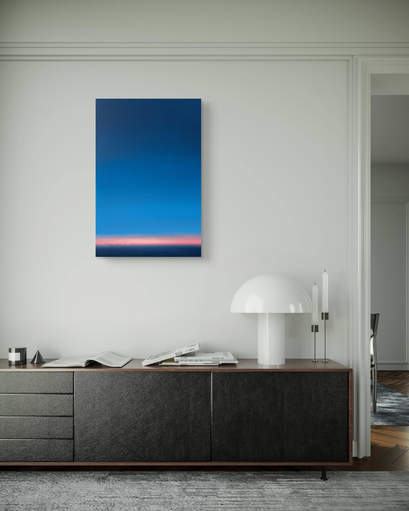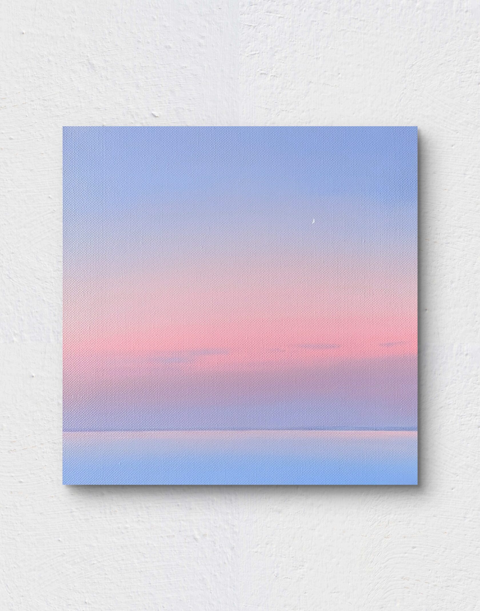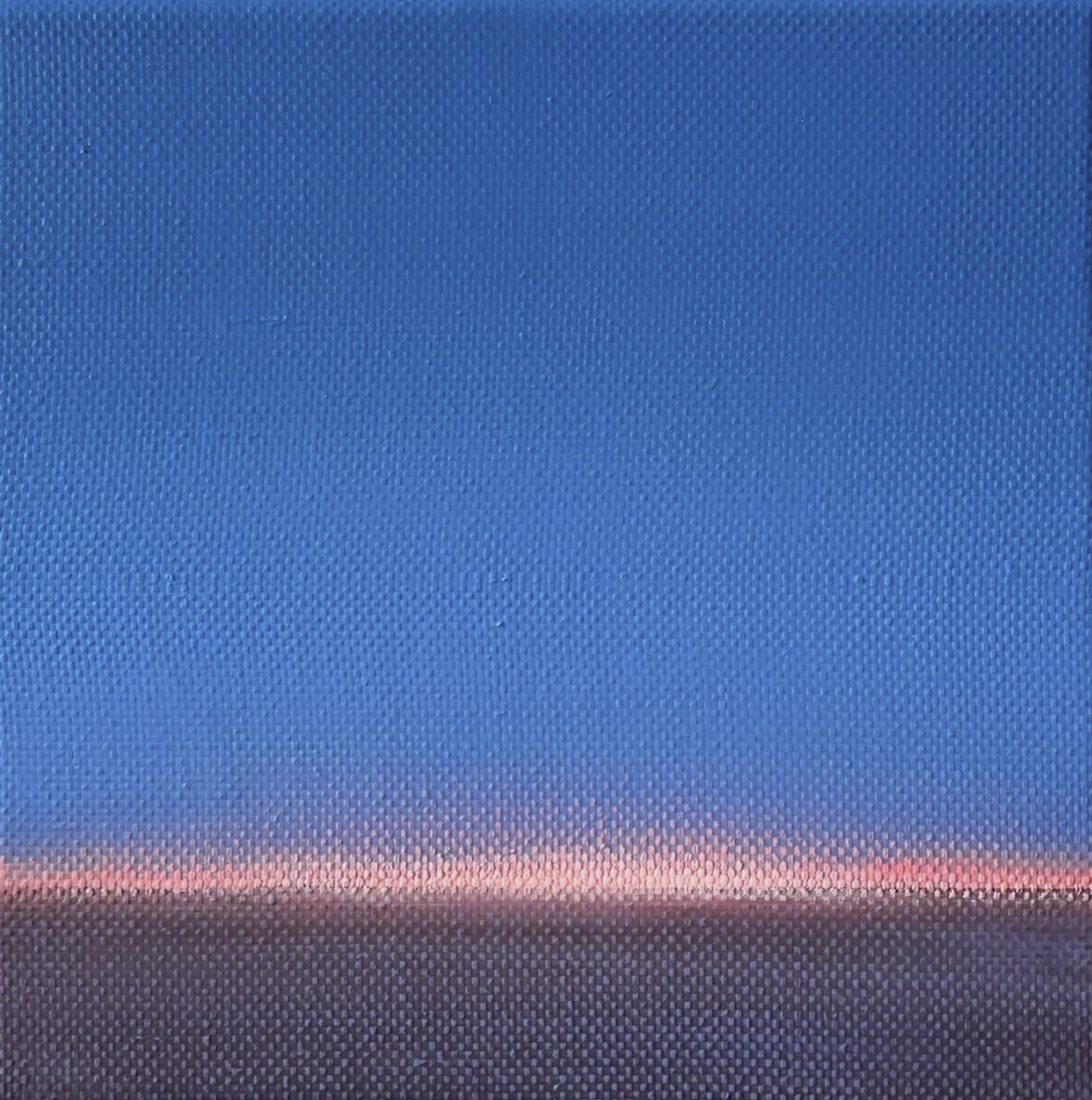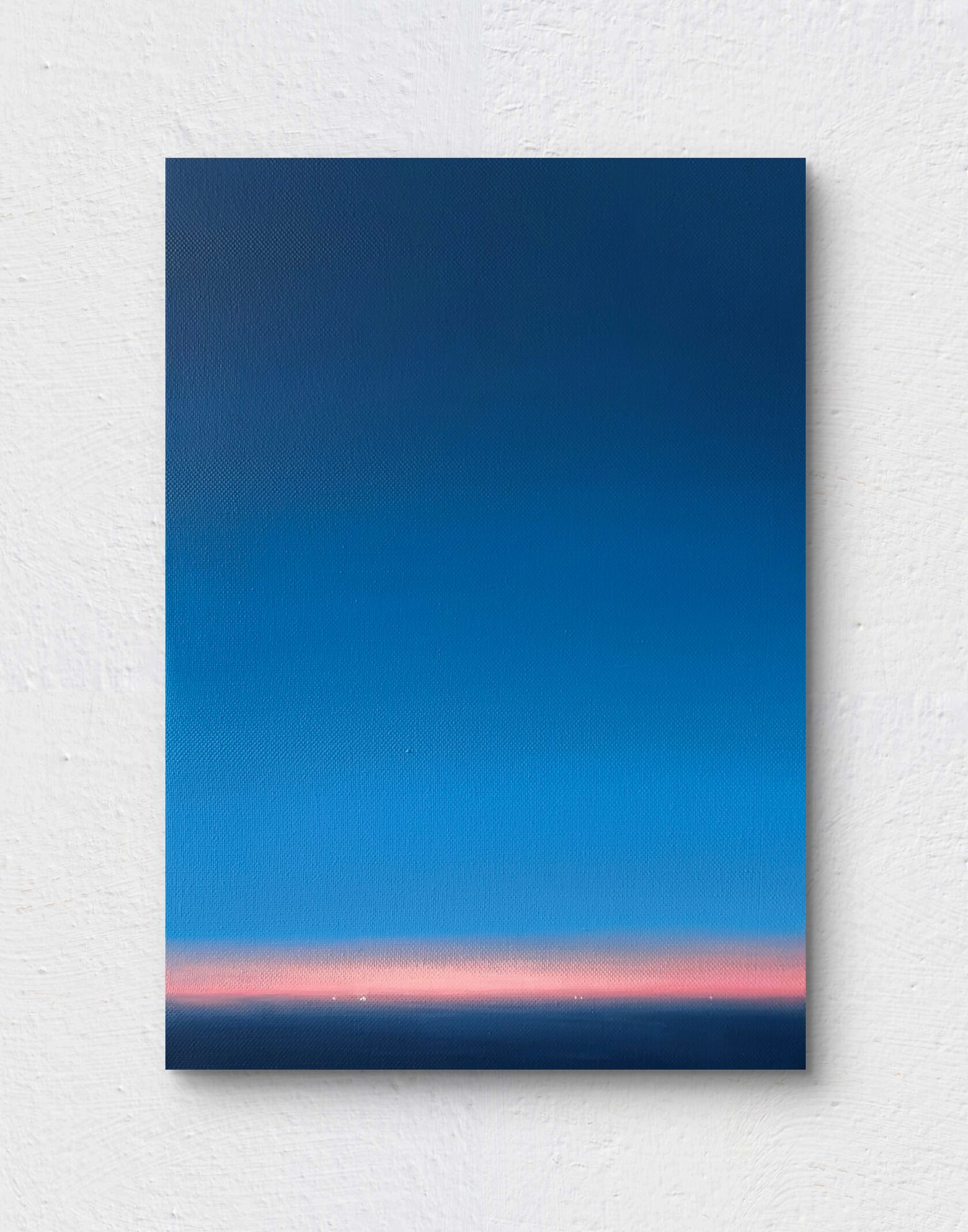 Работа передаёт состояние вечера после заката: небо постепенно уходит в холодную синеву, а у горизонта ещё держится мягкое розовое послесвечение. Минималистичный пейзаж, где чистота цвета и простая линия становятся образом тишины и покоя.