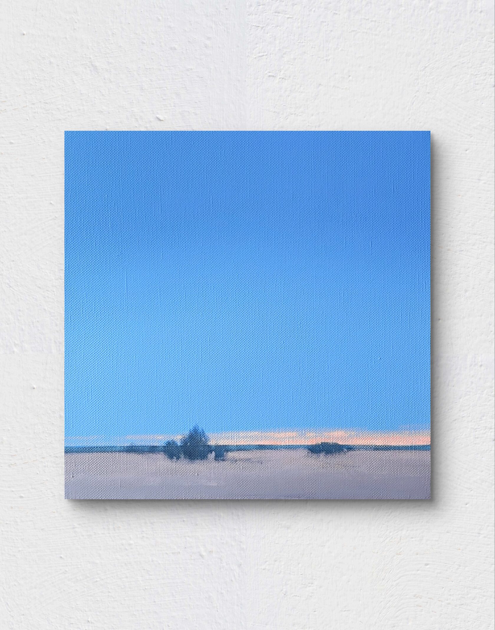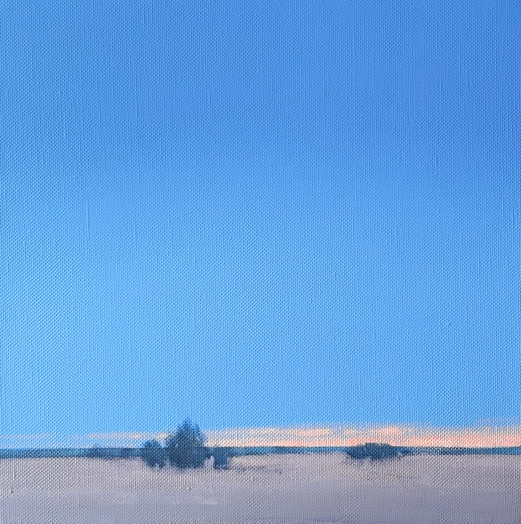 Лёгкие розовые облака растворяются в холодном синем небе, пока заснеженное поле встречает сумерки. Эта работа о тишине зимнего вечера, о моменте, когда день сменяется ночью, и всё замирает в мягком свете уходящего солнца.