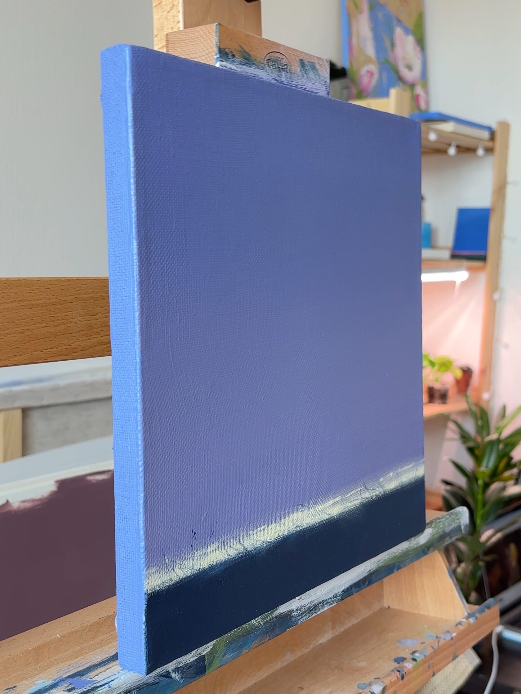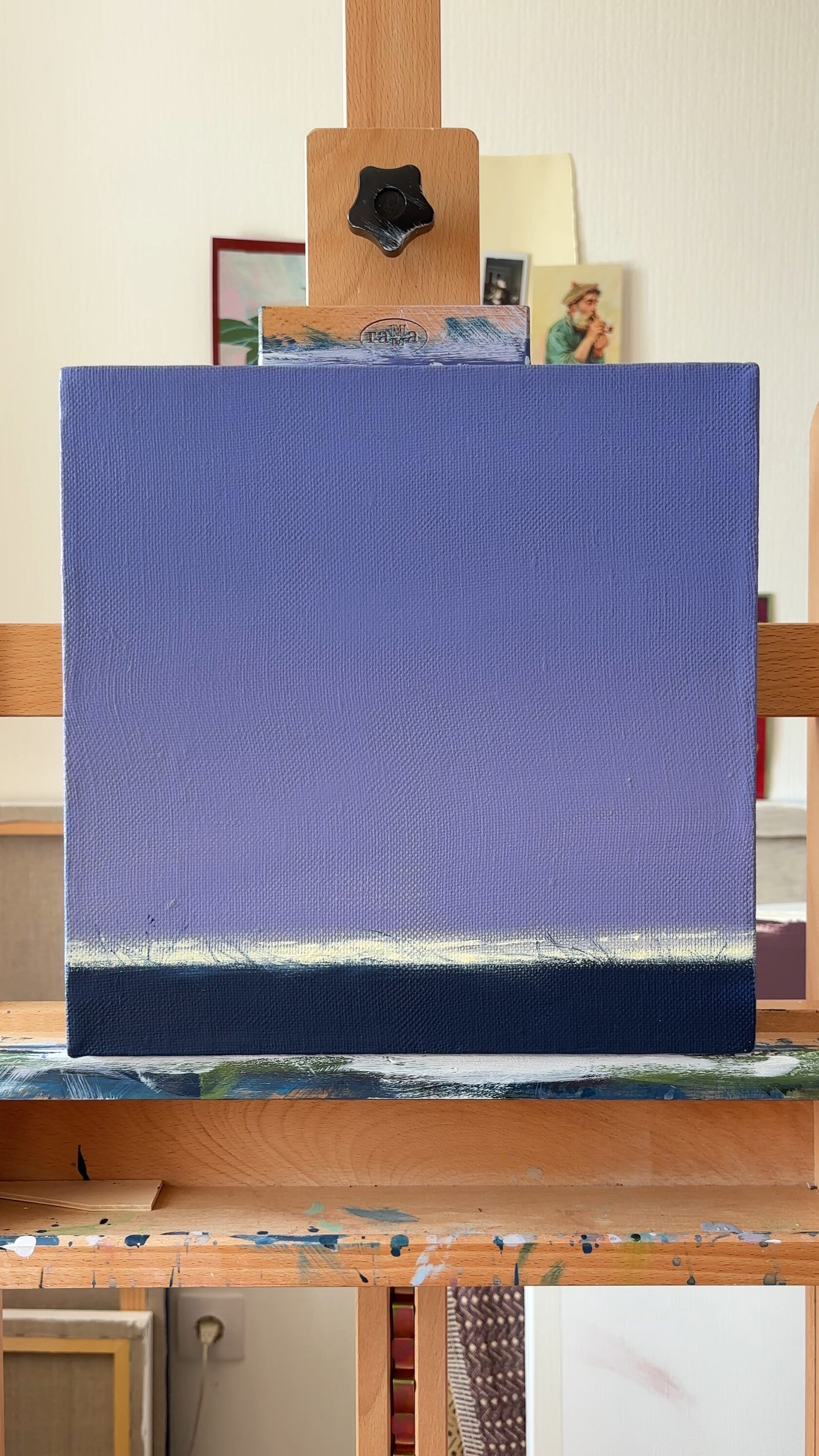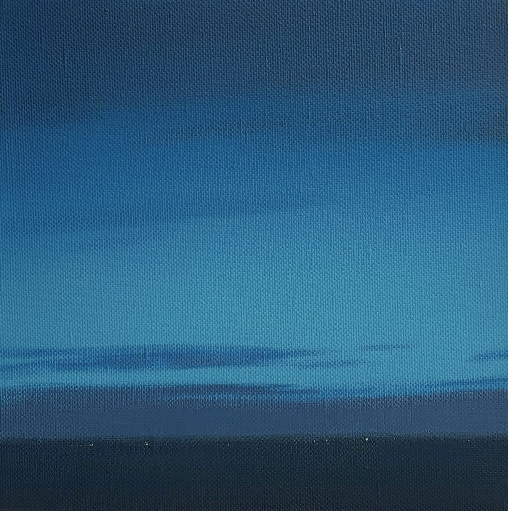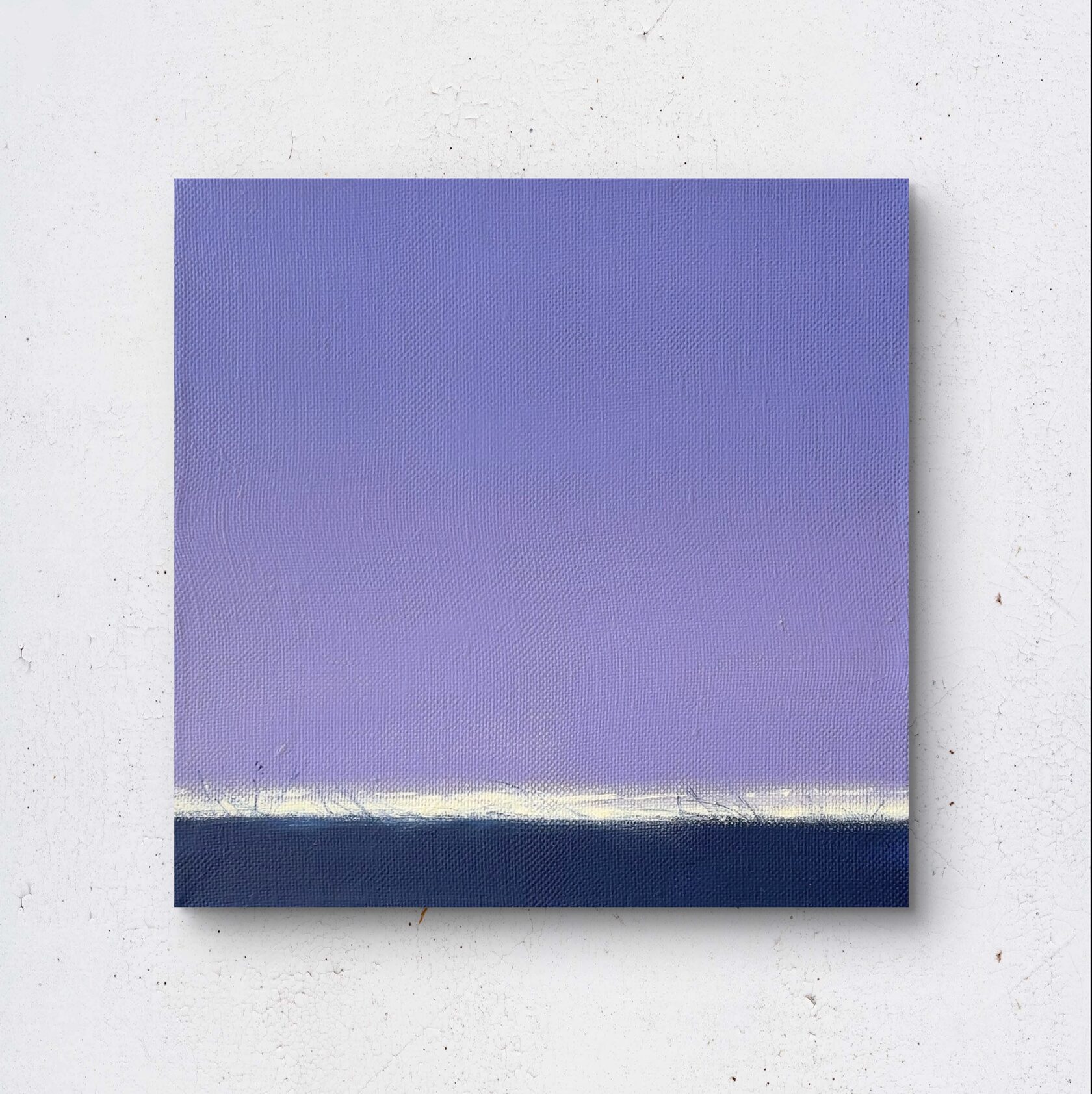 Лаконичный пейзаж, в котором линия горизонта становится главной темой. Глубокий синий и мягкий перелив фиолетово-лиловых оттенков создают ощущение предвечерней тишины. Едва заметное свечение на границе неба и земли фиксирует момент перехода — когда день растворяется в ночи, а пространство кажется бесконечным.