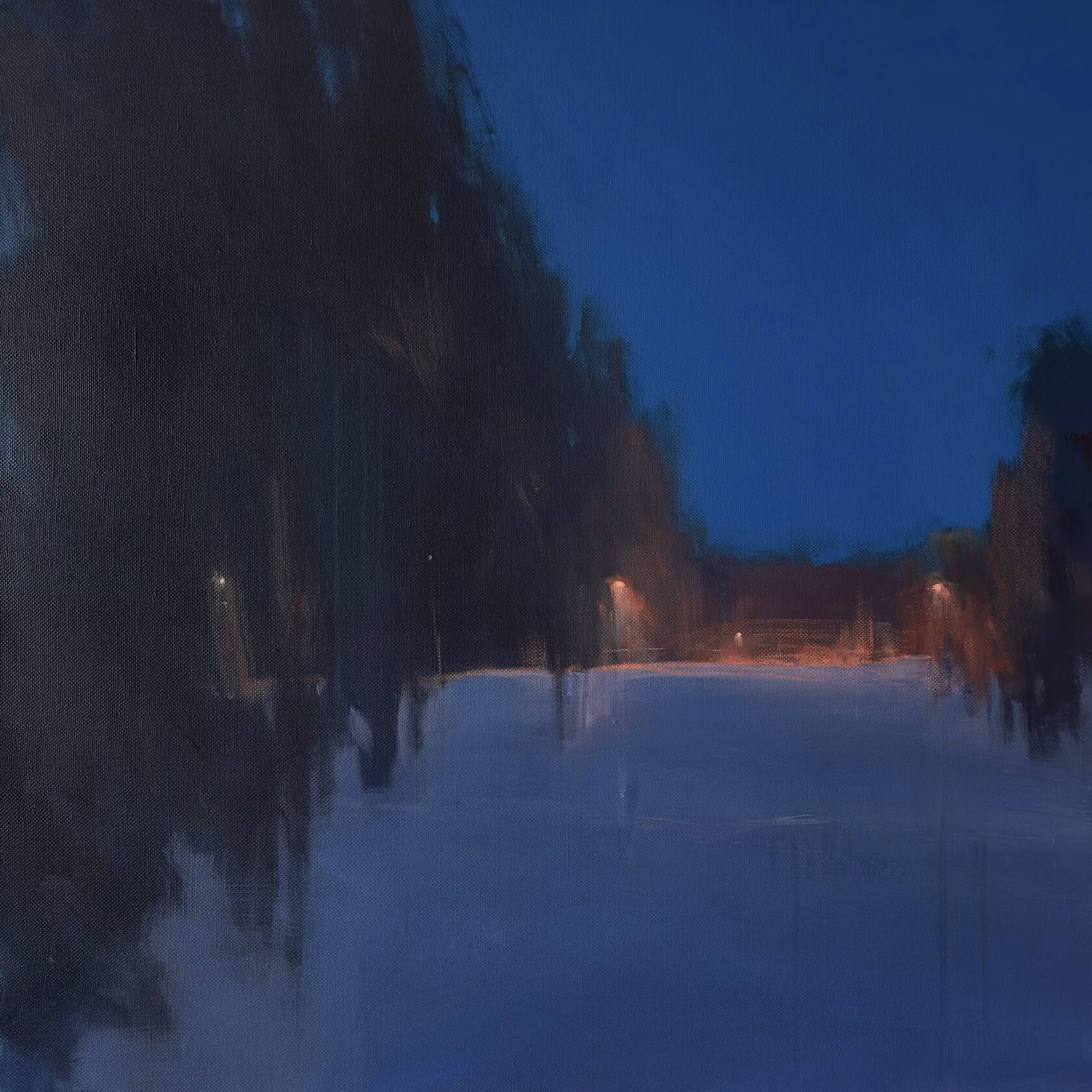 Мастерски проработанная светотень подчёркивает атмосферу ночной глубины, а минималистичность композиции позволяет зрителю почувствовать себя частью этого пейзажа — в тишине, где слышен лишь ветер и дыхание зимней ночи. Картина продолжает серию “Ночной свет”, раскрывая мотив взаимодействия природного покоя и удалённого присутствия человека в пространстве.