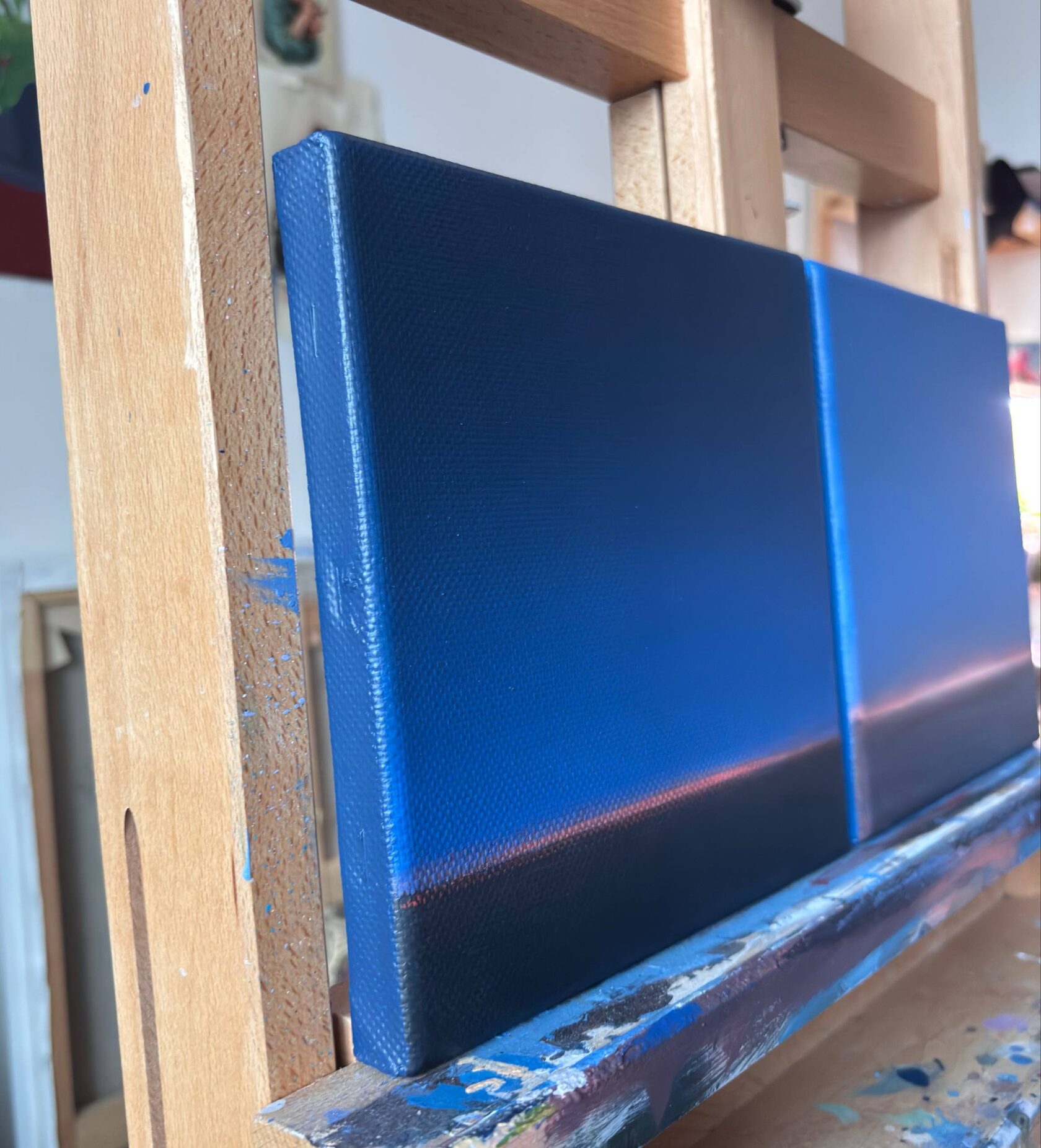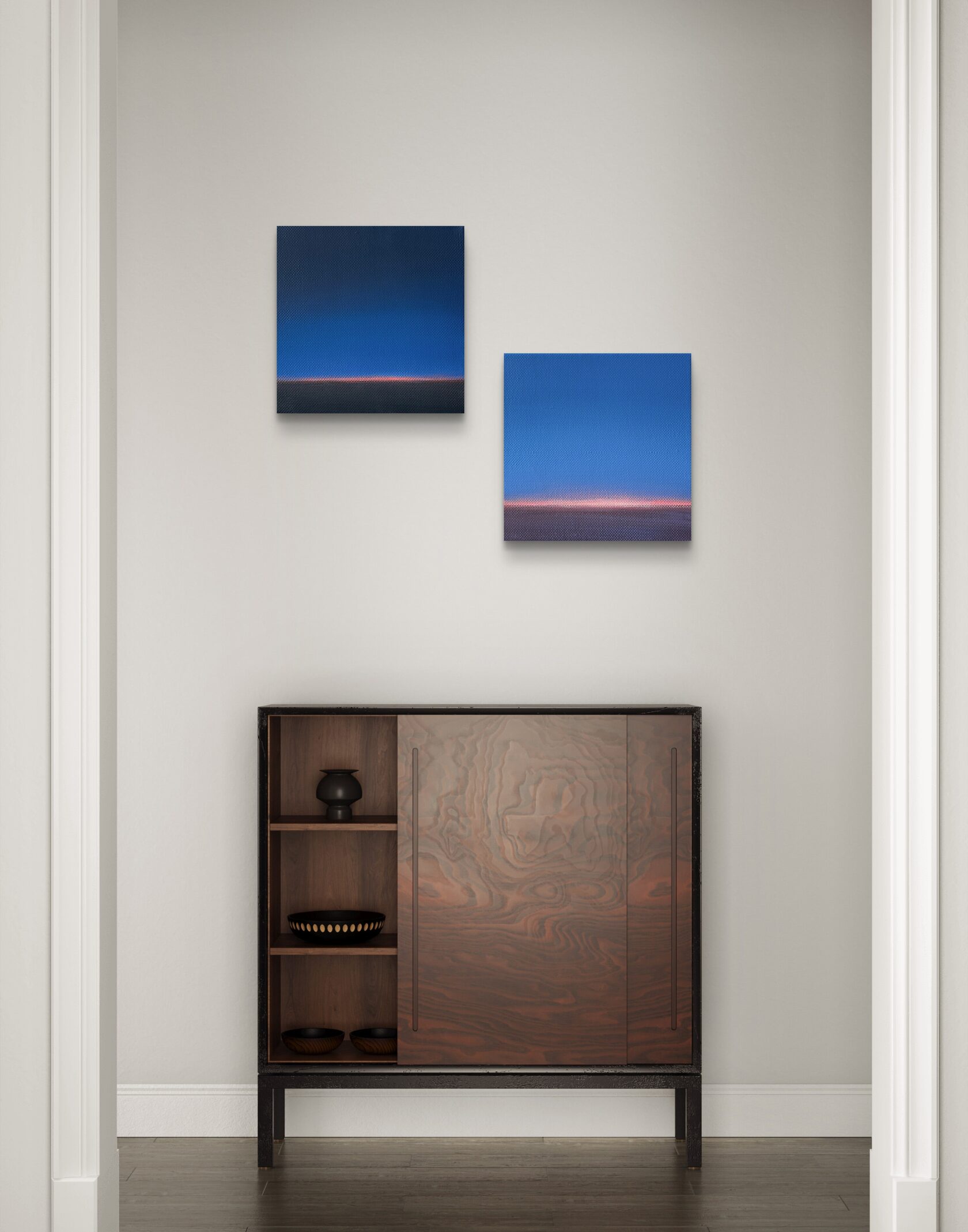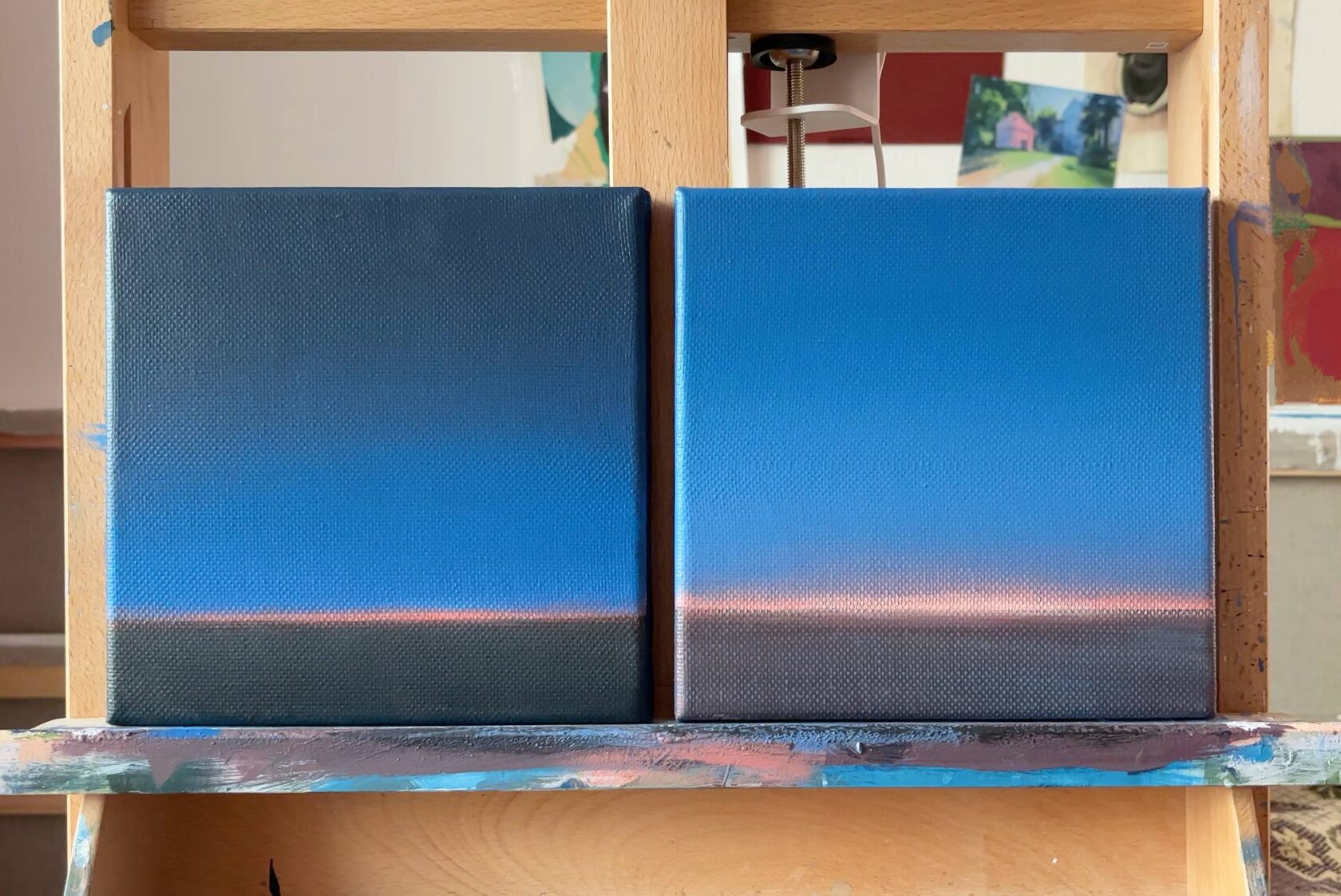 Диптих из двух миниатюрных картин является частью серии «Горизонты», пейзажей на стыке абстракции и минимализма. Работа «Просвет» строится на контрасте холодных тёмных синих и тёплого кораллового горизонта. Плавные градиенты и тонкая полоска света создают ощущение покоя и внутреннего просветления, где свет становится символом надежды.