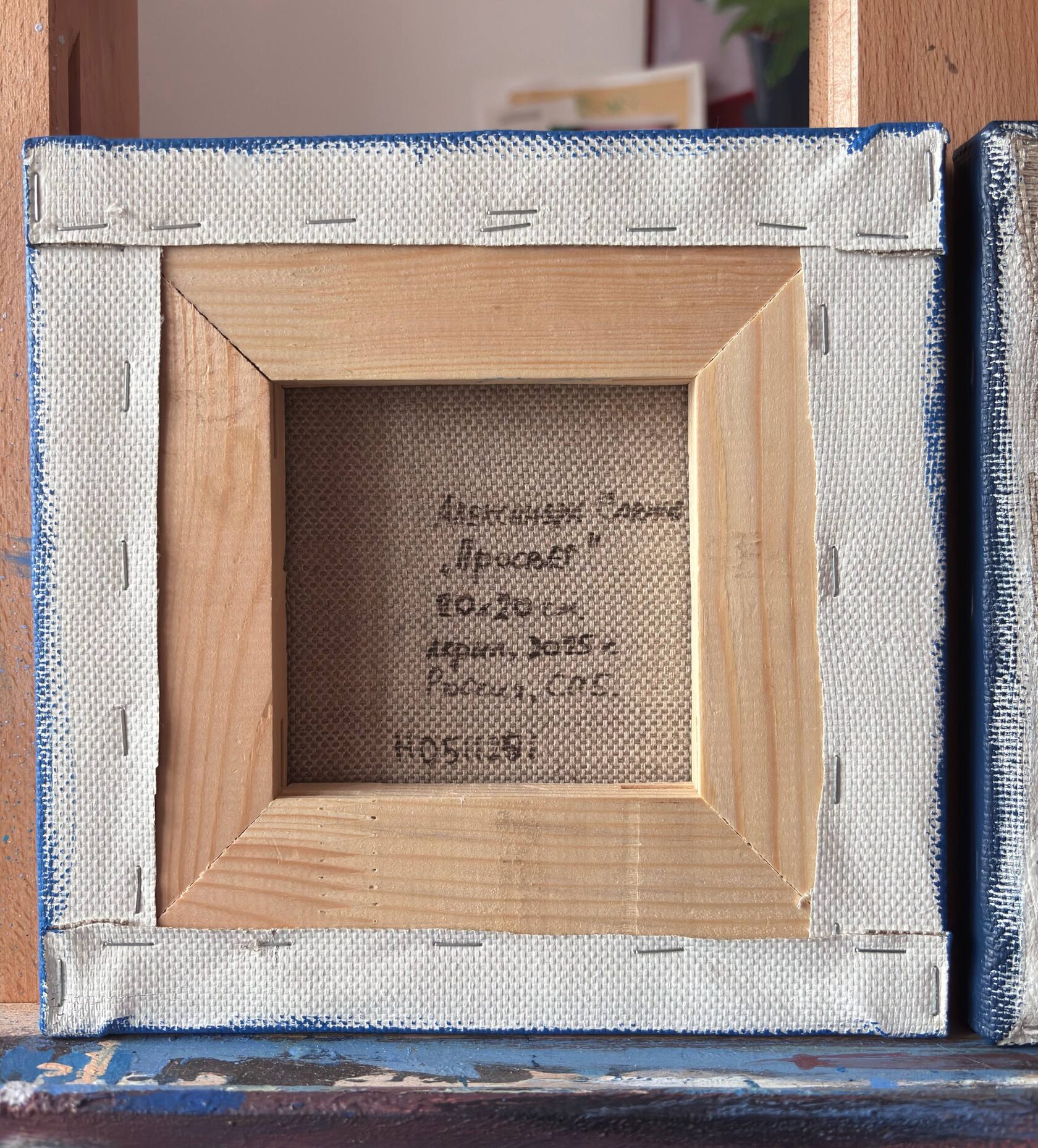 25х25 см, холст на картоне, смешанная техника, 2024 год. Весенний пейзаж выполненный в абстрактной манере, но сохраняющий все очертания весеннего солнечного дня.