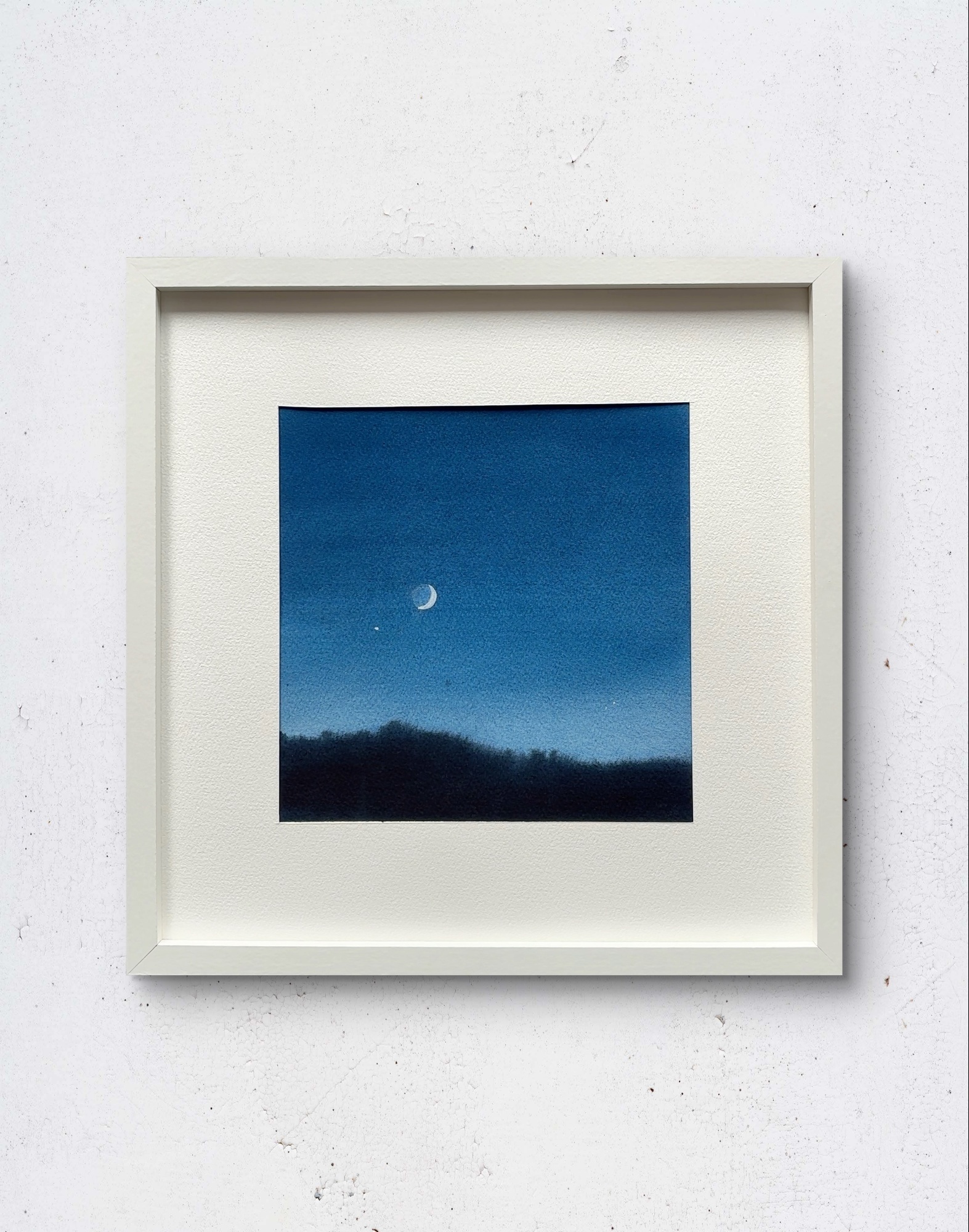 40х40 см, акрил, холст на подрамнике, 2025 год. Эта работа навеяна тихим осенним вечером, когда мягкий свет луны встречается с глубокими оттенками уходящего дня. В композиции ощущается привязка к коллажности: элементы пейзажа будто собираются из фрагментов воспоминаний, создавая многослойное пространство.