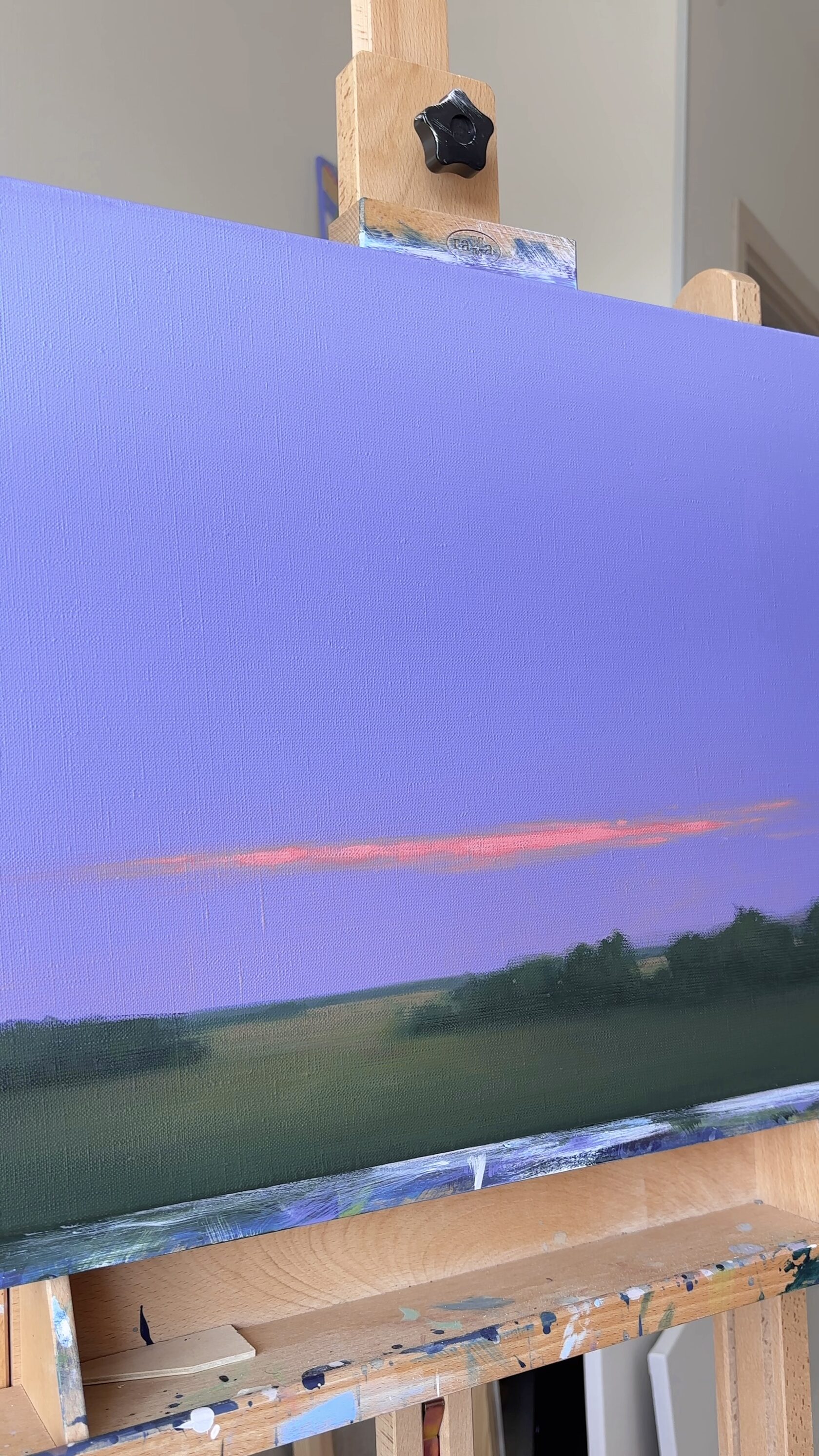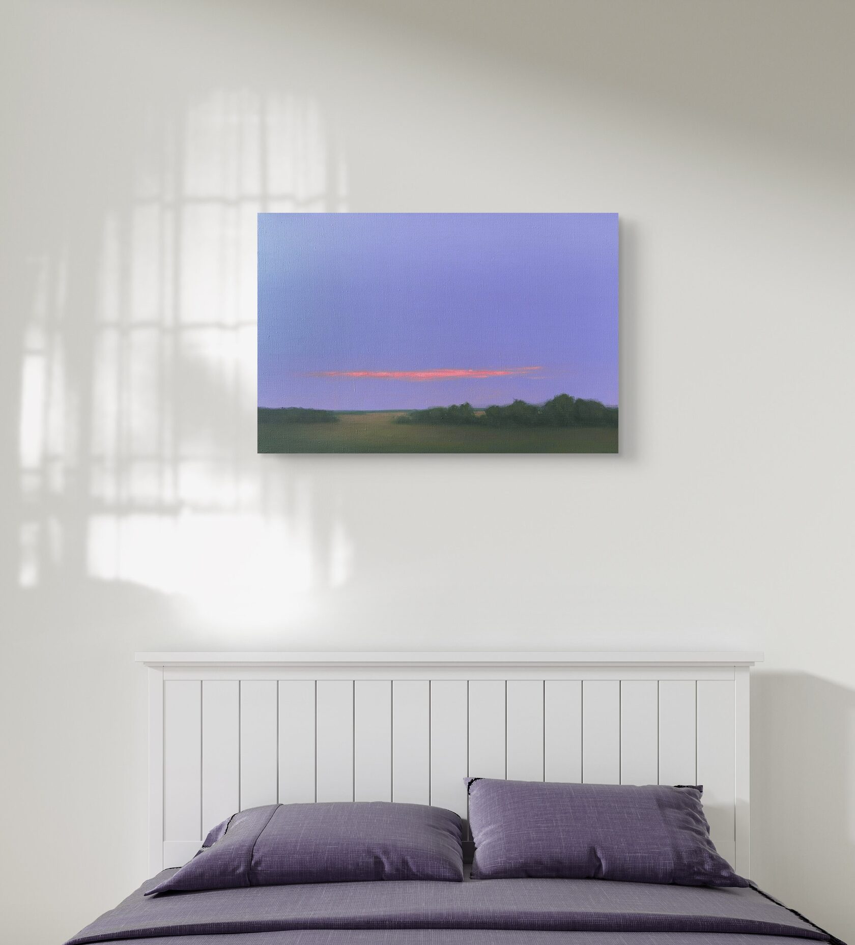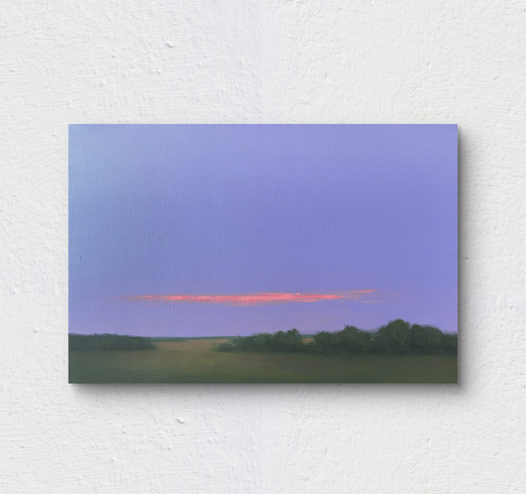 Минималистичный пейзаж, передающий тихую гармонию вечернего поля. Лёгкий розовый отблеск на горизонте мягко контрастирует с глубоким фиолетовым небом, создавая атмосферу спокойствия и умиротворения. Работа выполнена с акцентом на простоту форм и цветовую нюансировку, чтобы зритель мог погрузиться в момент тихой природы.