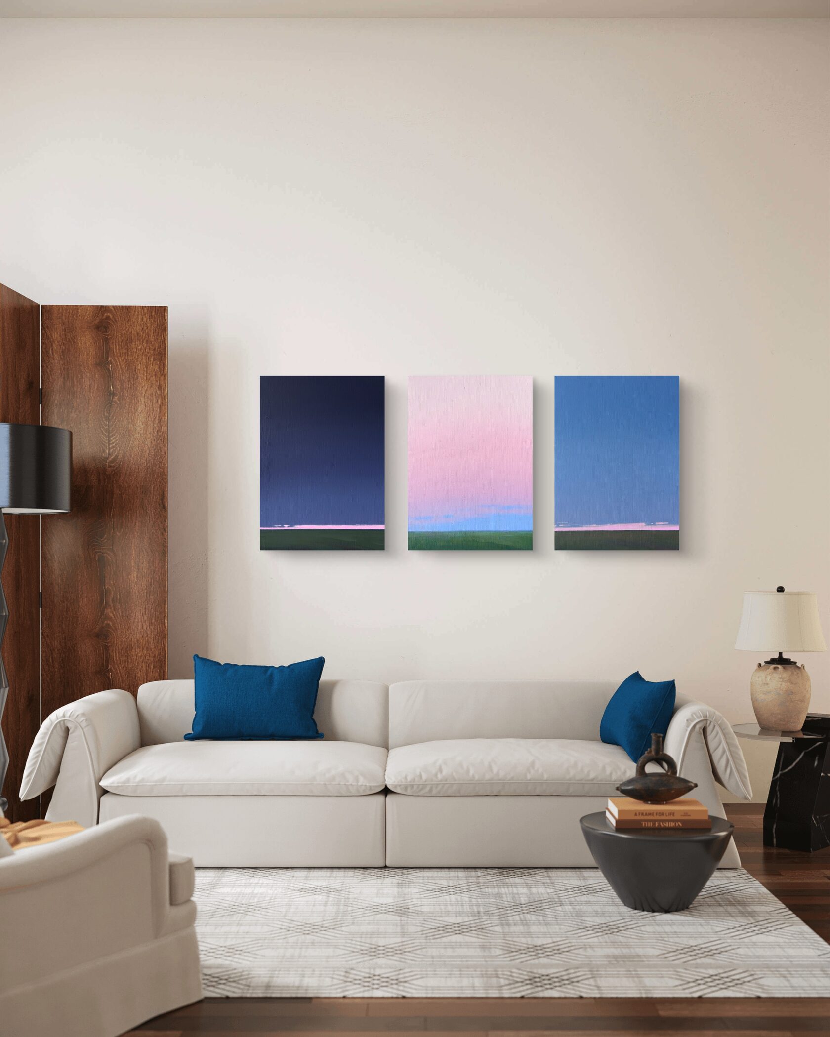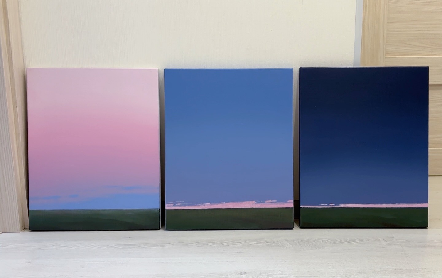 Минимализм здесь работает как «чистый воздух» — без лишних деталей, только цвет и свет, только настроение момента. Каждое полотно можно воспринимать отдельно, но вместе они создают цельное пространство, словно три взгляда на один и тот же горизонт.